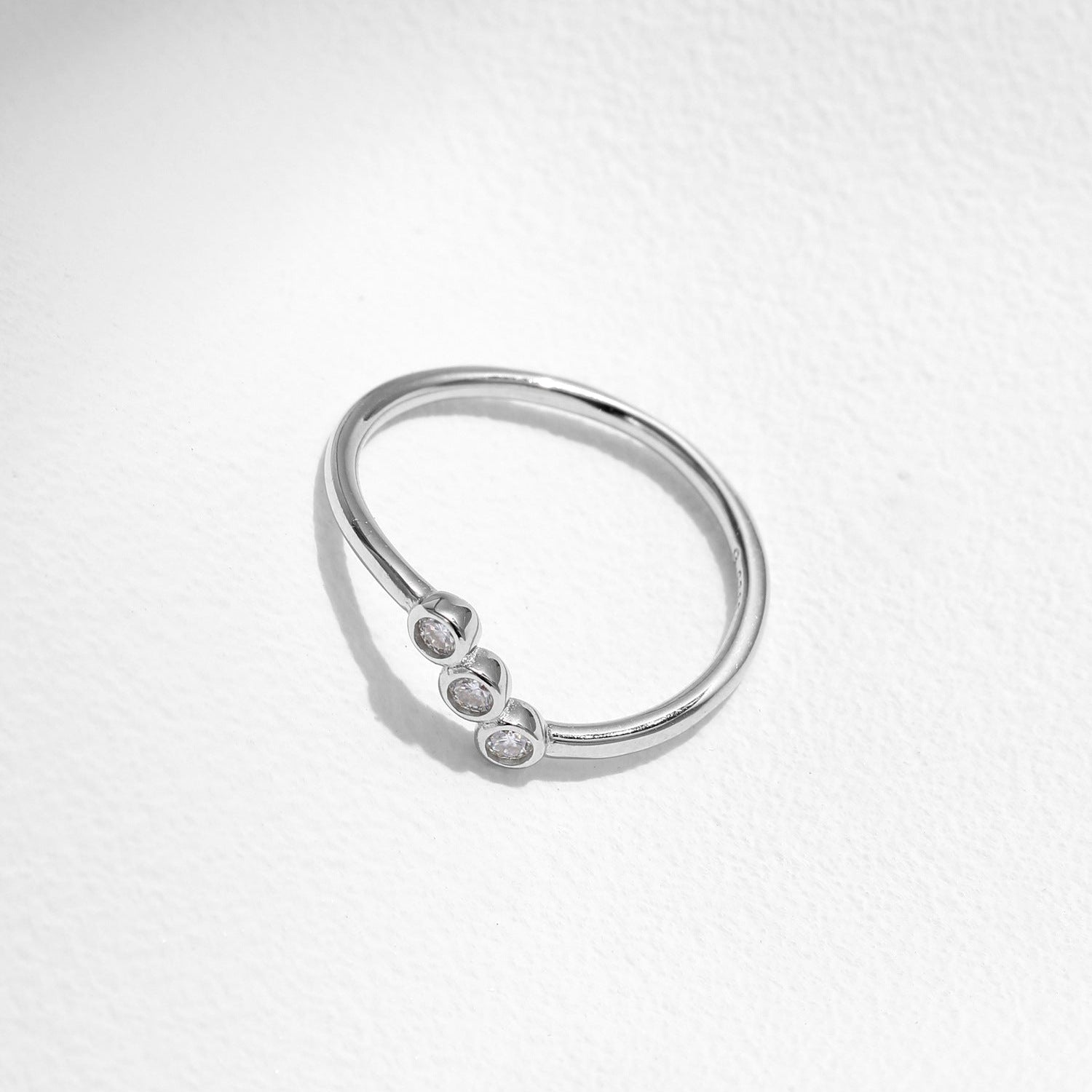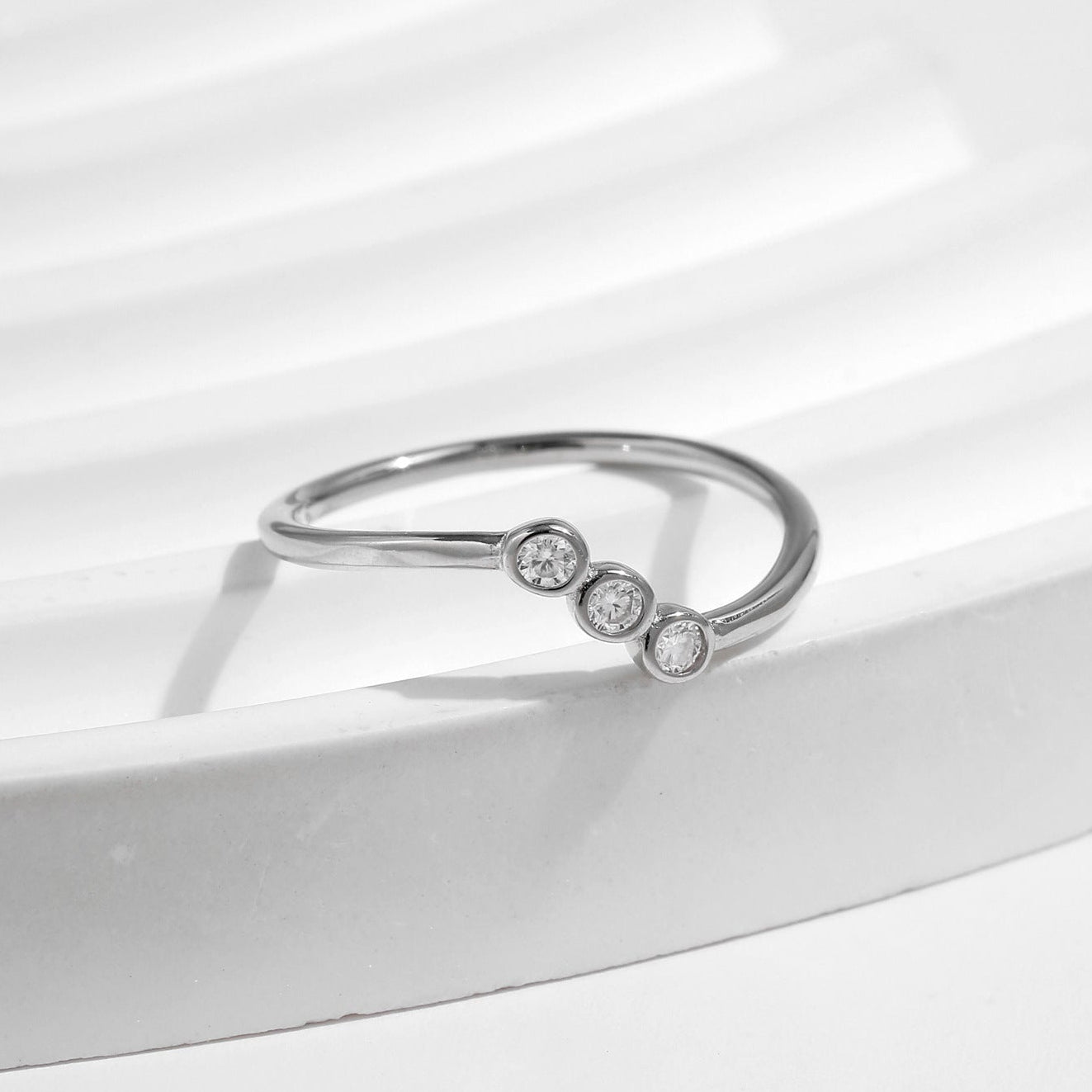 A graceful alignment of light and form. Three D-color VVS1 moissanite stones, each weighing 0.03ct and measuring 2.00mm, rest in perfect harmony along a polished band. Their brilliance captures quiet confidence and subtle motion. Accompanied by an official GRA certificate verifying authenticity, clarity, and serial number — a study in simplicity and precision.