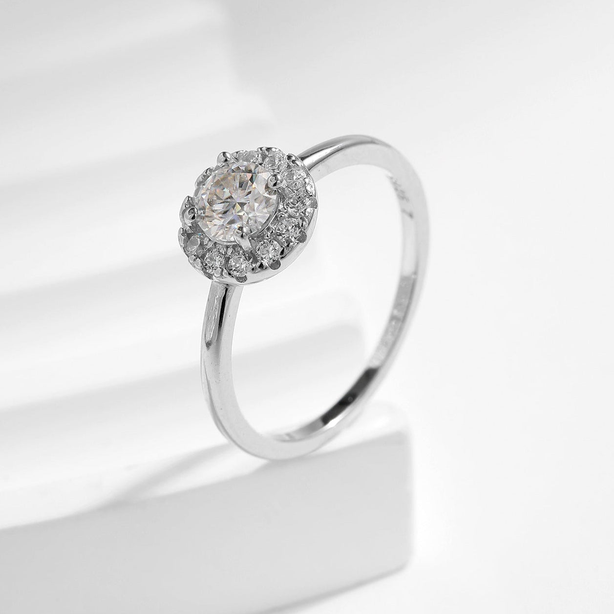 A 0.50CT round-cut moissanite rests at the center, encircled by a halo of brilliance that seems to breathe with light. Every angle catches the eye, every reflection feels alive. A symbol of quiet strength and eternal clarity.