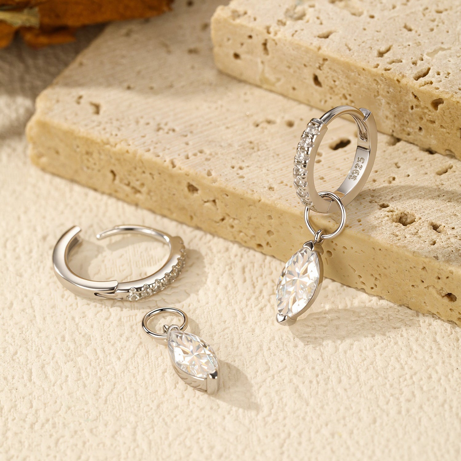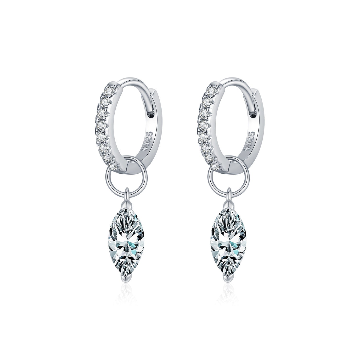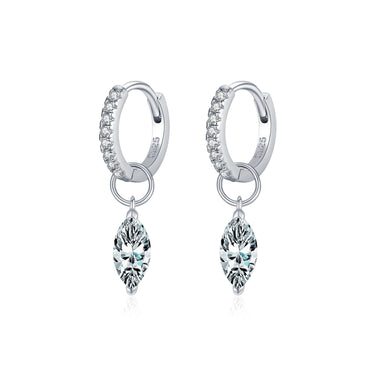 A graceful blend of fire and movement. These marquise-cut moissanite drop earrings feature two D-color VVS1 stones, each weighing 0.50CT and measuring 4.00×8.00MM, suspended from hoops adorned with brilliant cubic zircon accents. Crafted in platinum vermeil, they capture light with every turn—balancing sophistication with a fluid, modern allure. Certified by GRA for verified quality and brilliance.