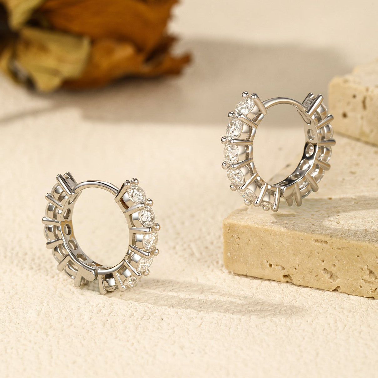 A radiant embrace of light and symmetry. These hoops feature 22 D-color VVS1 moissanites, each weighing 0.10CT and measuring 3.00MM, for a total of 2.20CT per pair. Expertly set in polished platinum vermeil, the brilliant-cut stones reflect exceptional fire and clarity from every angle. Comes with an official GRA certificate confirming authenticity, clarity, and cut grade.