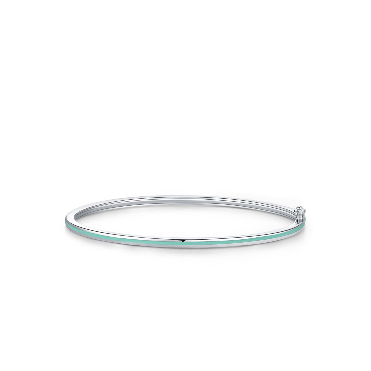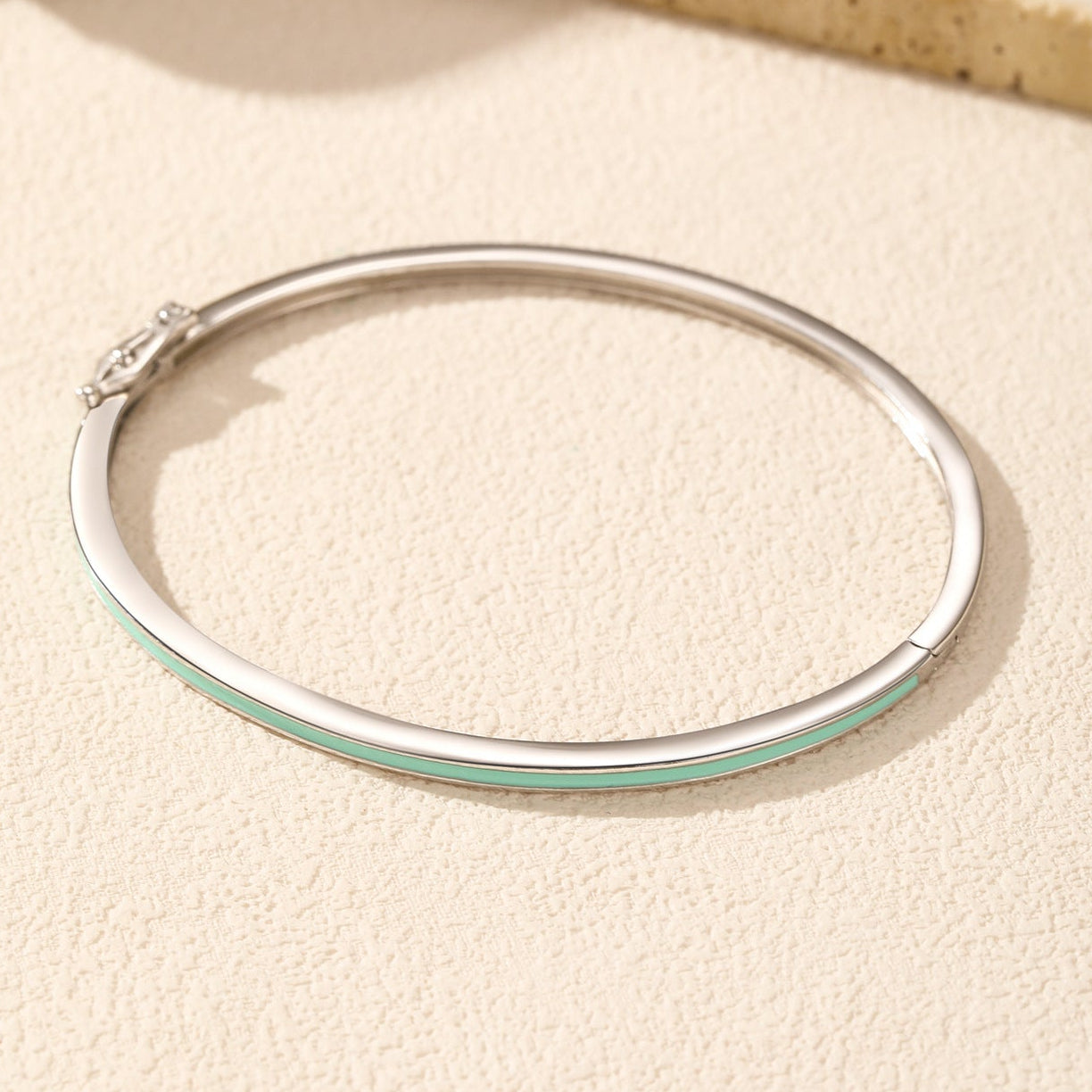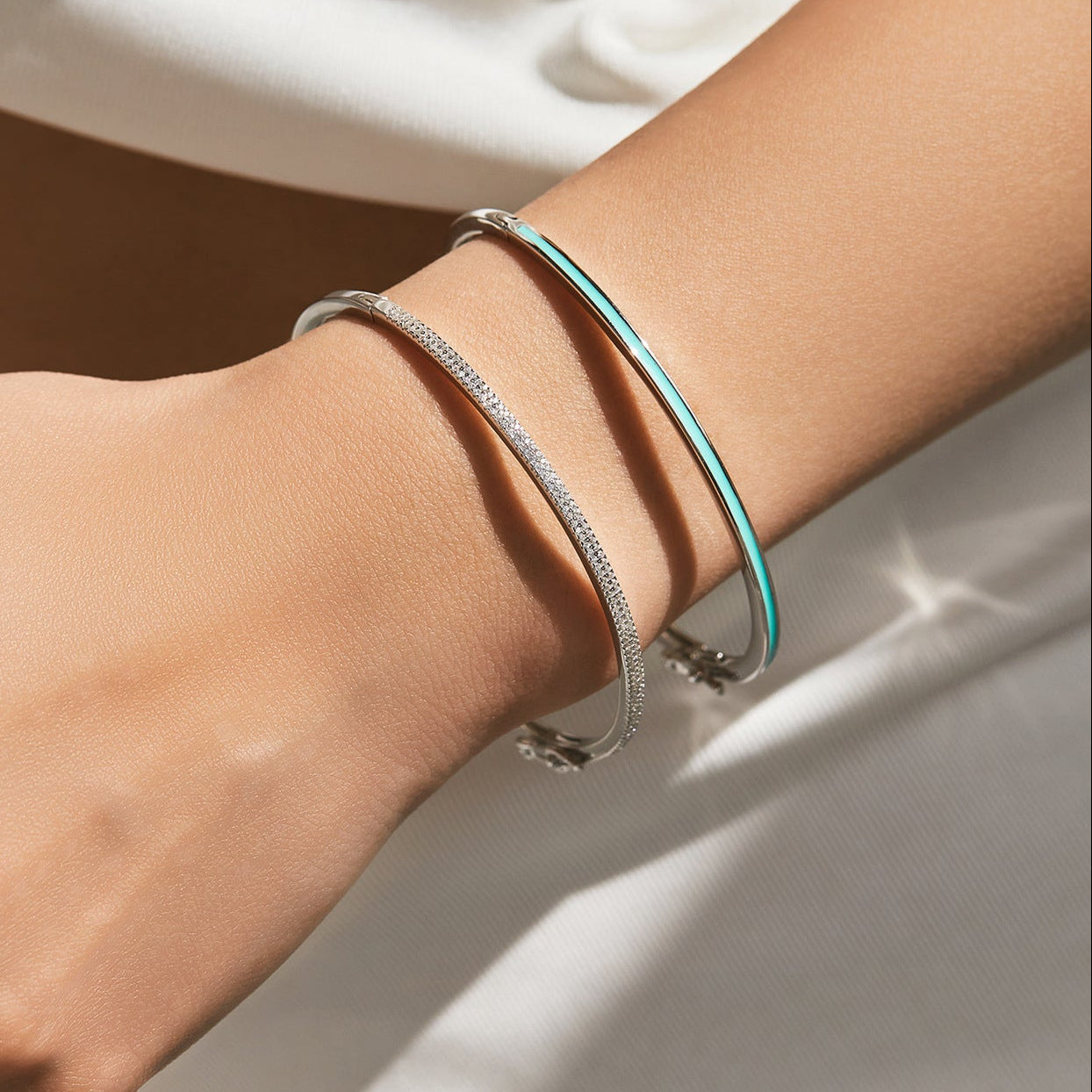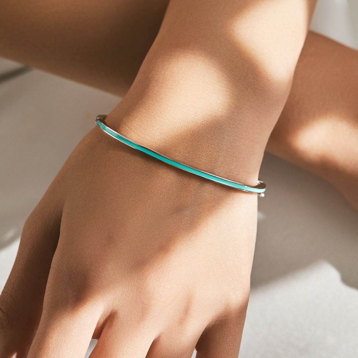 This bangle captures quiet elegance through a smooth 2.5 mm band with subtle turquoise enamel detail. Designed with perfect proportions, it measures 54 mm or 60 mm in diameter, weighing 8.65 g — light enough for everyday wear, yet structured with a solid, polished finish.