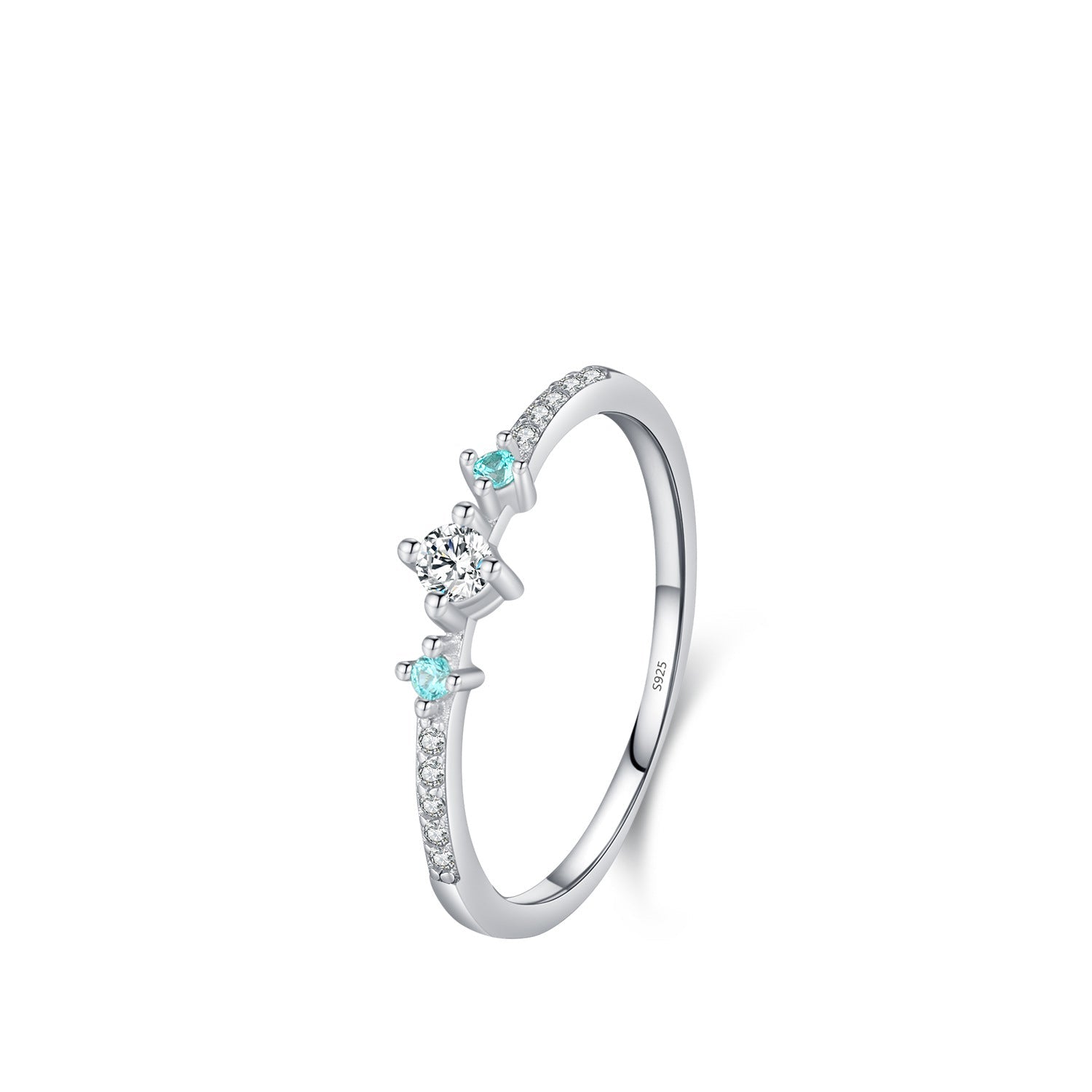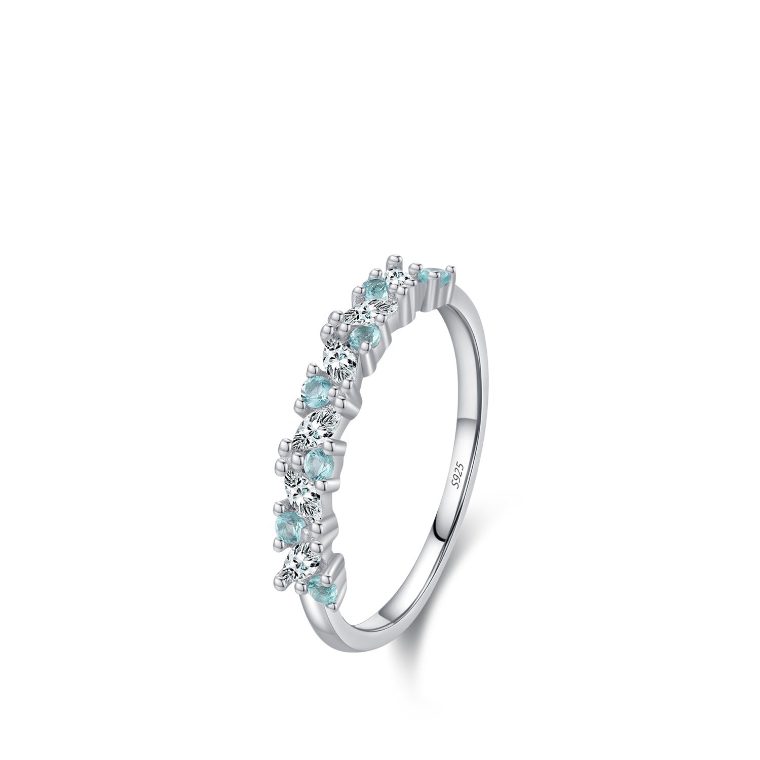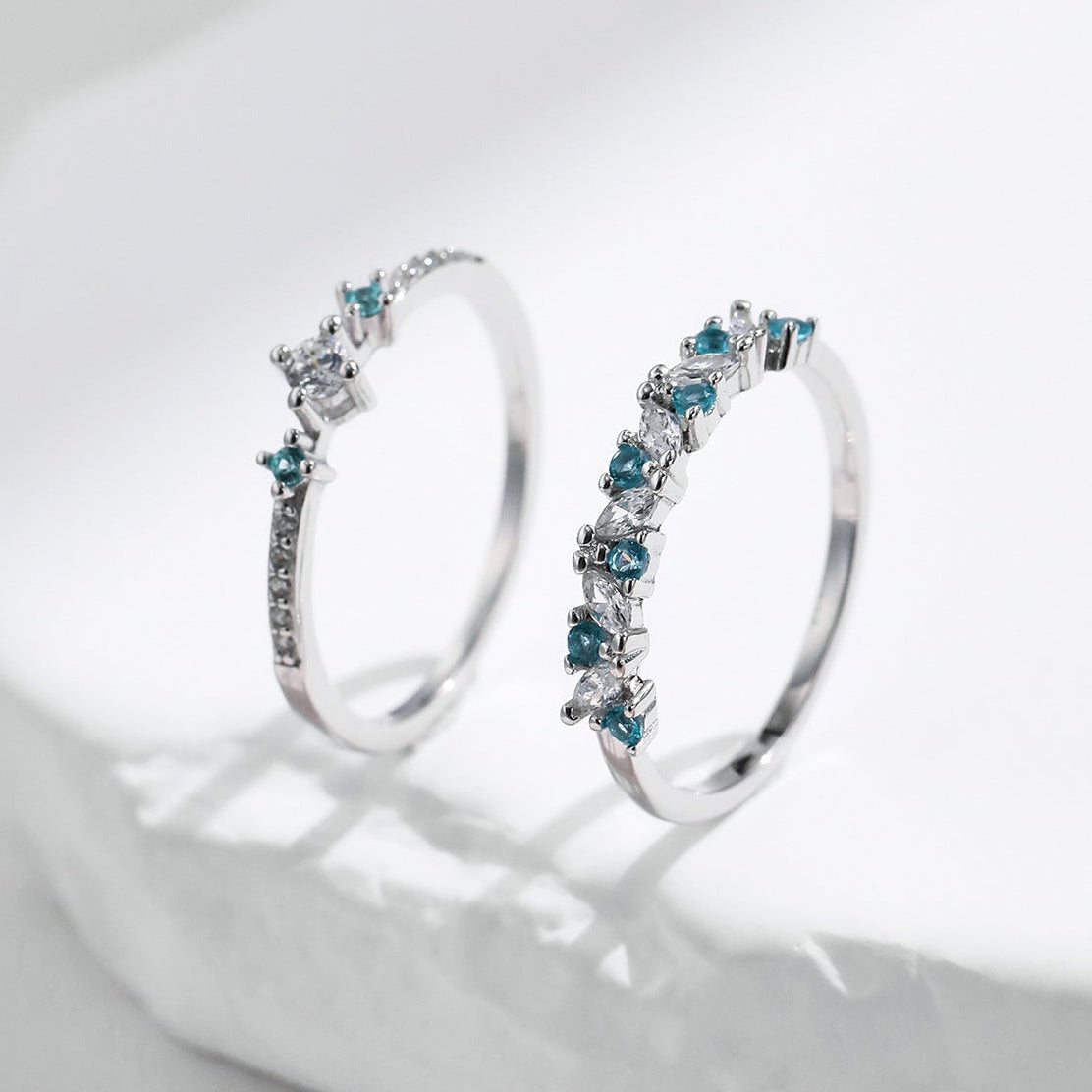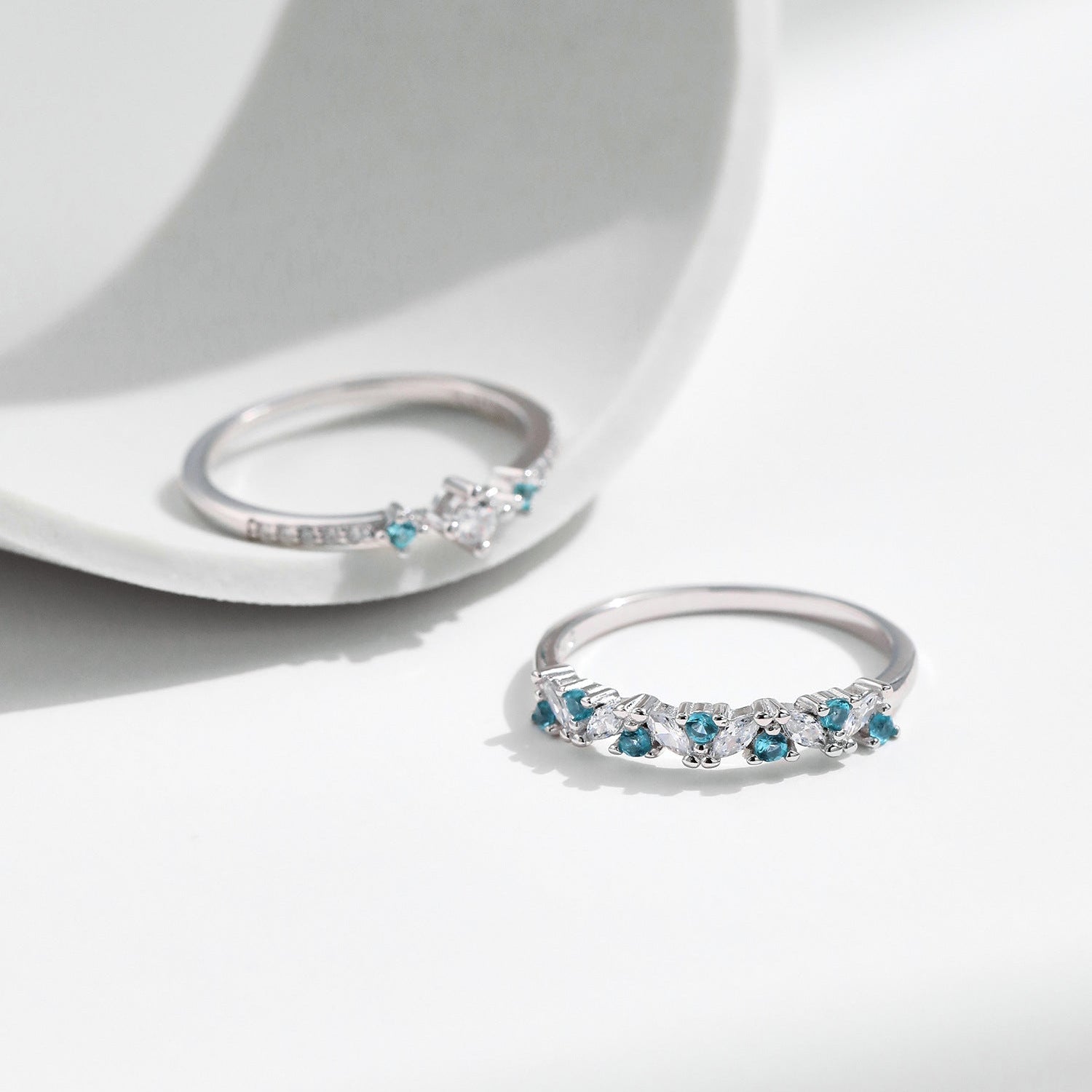 Each ring features luminous stones with soft aqua accents, set along a fine, slender band that captures light with quiet precision. The first design highlights a central 3 mm gem flanked by pavé details; the second forms a continuous arc of subtle blue and white shimmer.