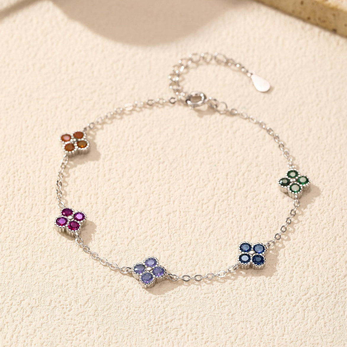 Each floral charm features a different hue — emerald green, sapphire blue, amethyst violet, fiery orange, and deep ruby — creating a perfect balance of joy and refinement. The fine chain drapes lightly around the wrist, its 16+3 cm length adjustable for a precise fit.