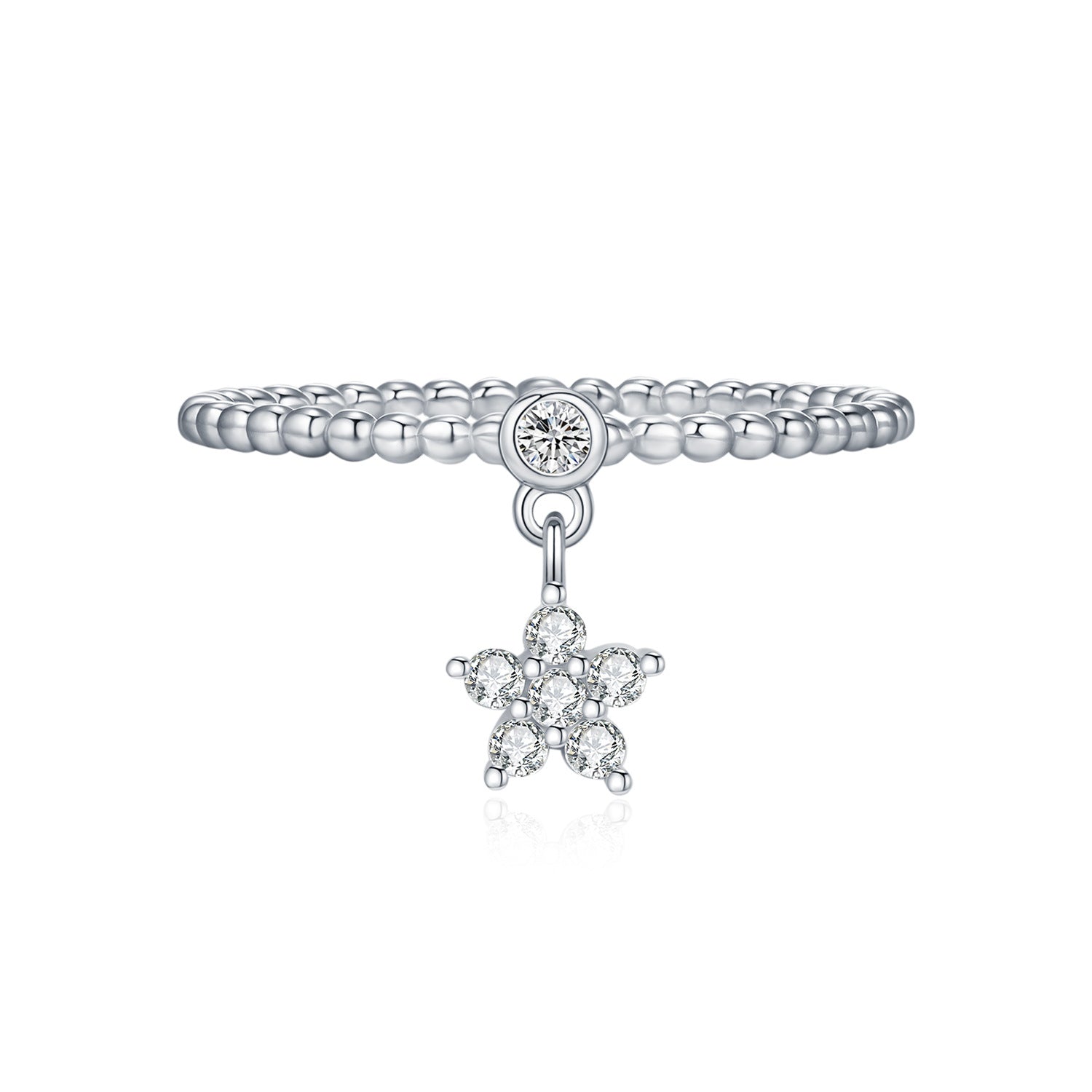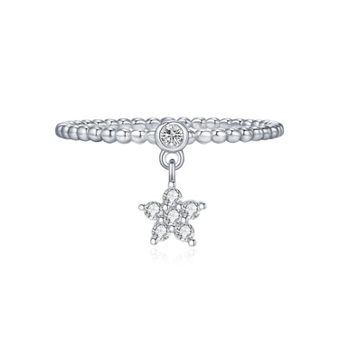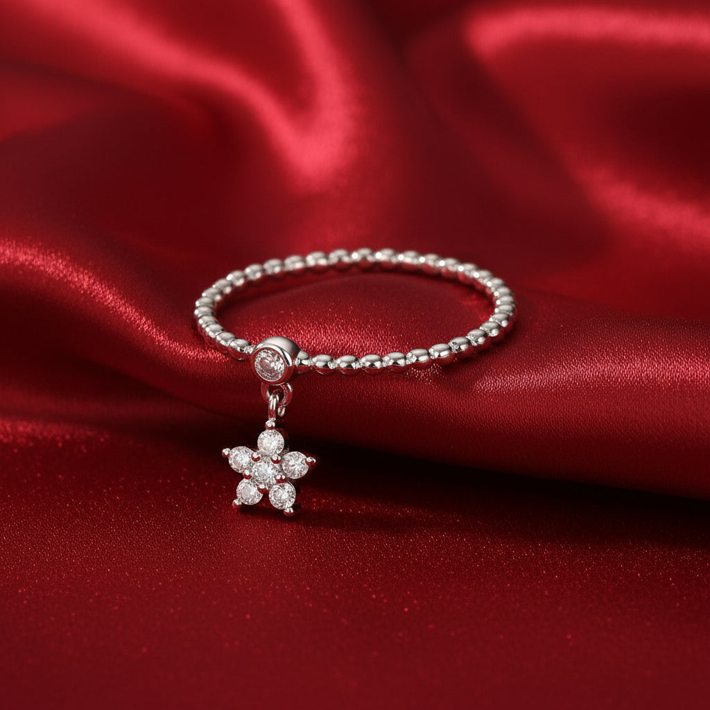 This star charm ring features a central 0.03 CT moissanite surrounded by six 0.015 CT stones, all graded D color and VVS1 clarity for an ice-pure glow. Each facet reflects precision and light, delicately suspended from a fine beaded band that moves gracefully with every gesture.