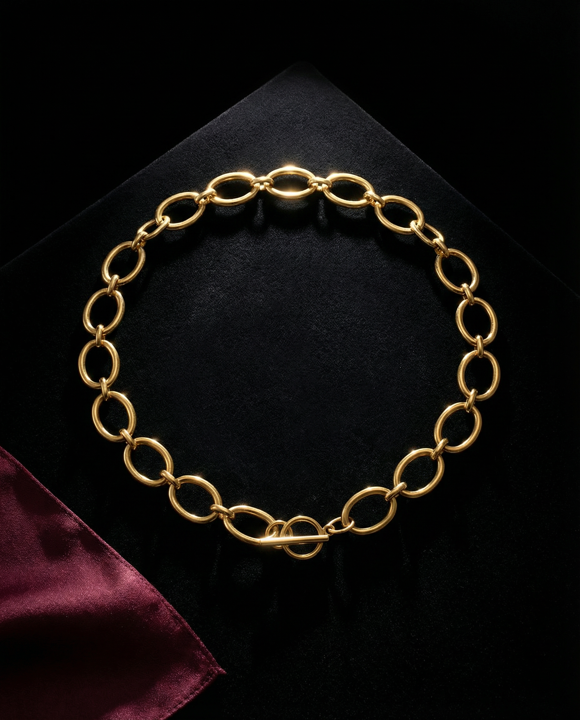 Forty-five centimeters of substantial oval intention. Each link 14mm of polished gold refusing delicate chain logic—these ovals claim presence through dimension not decoration. Toggle clasp doubles as statement, visible when worn proving closures deserve design attention. 40.9 grams sitting below your collarbone, substantial enough to feel, elegant enough to forget you're wearing armor. This isn't layering chain—it's singular bold geometry that needs no accompaniment.