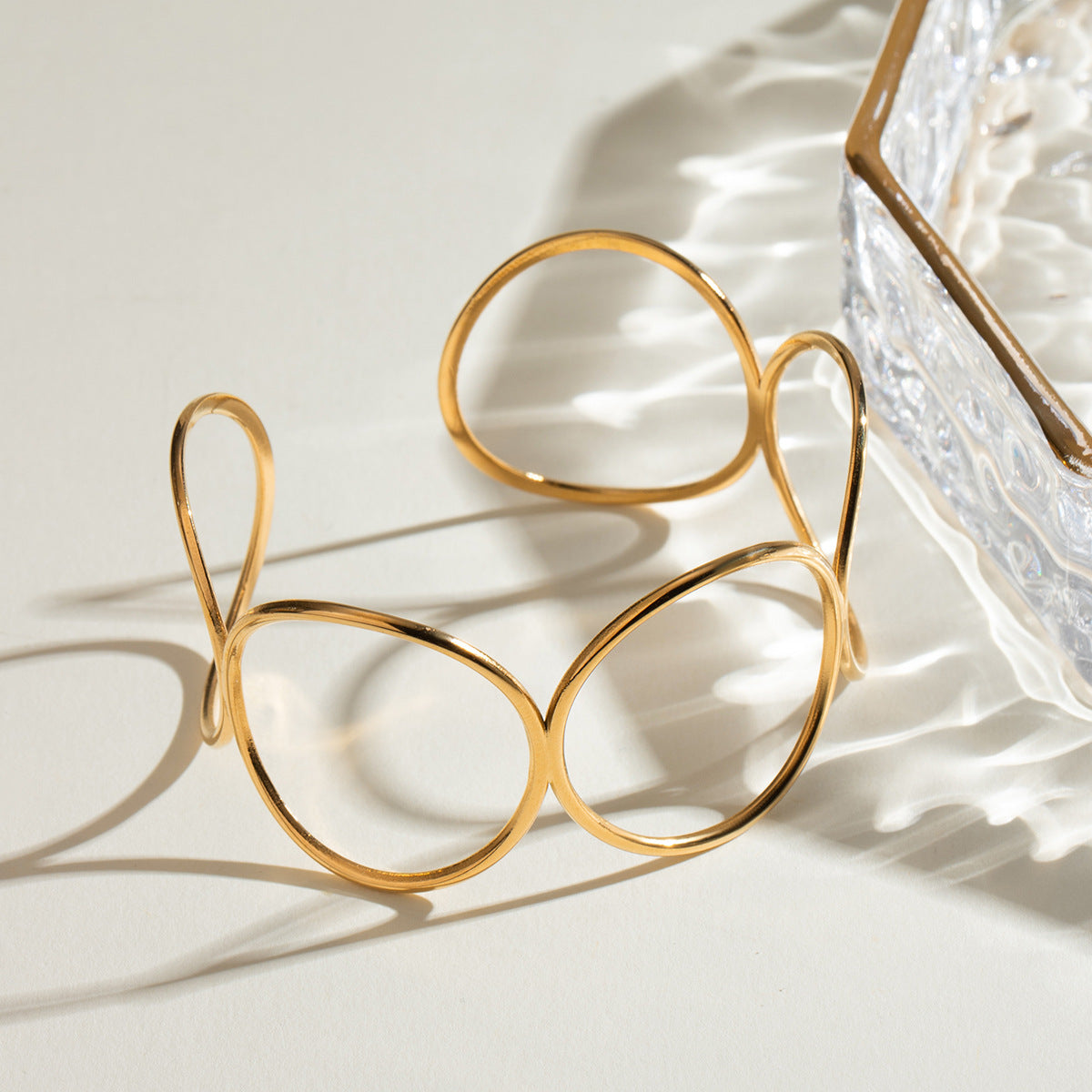 Open-structure cuff bracelet defined by sweeping, fluid curves that create an airy, sculptural silhouette. The 5.5 cm inner diameter ensures a balanced fit, while the 8.4 g weight gives it a confident yet effortless presence on the wrist.