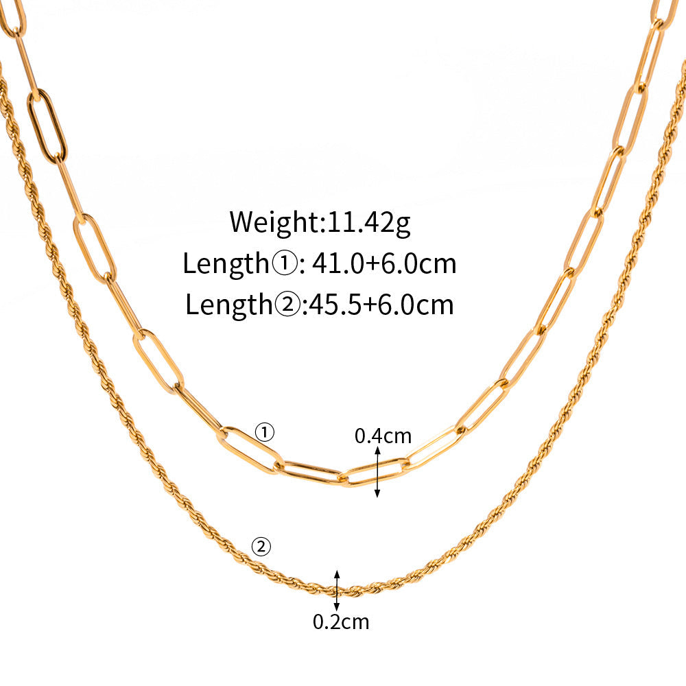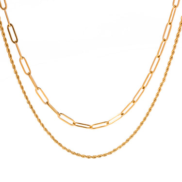 Two-layer necklace featuring contrasting chain styles — one elongated paperclip link and one twisted rope chain. Together they create a balanced layered look with a modern yet timeless appeal. Adjustable length for a perfect fit with any neckline.