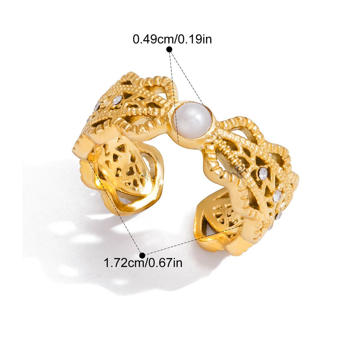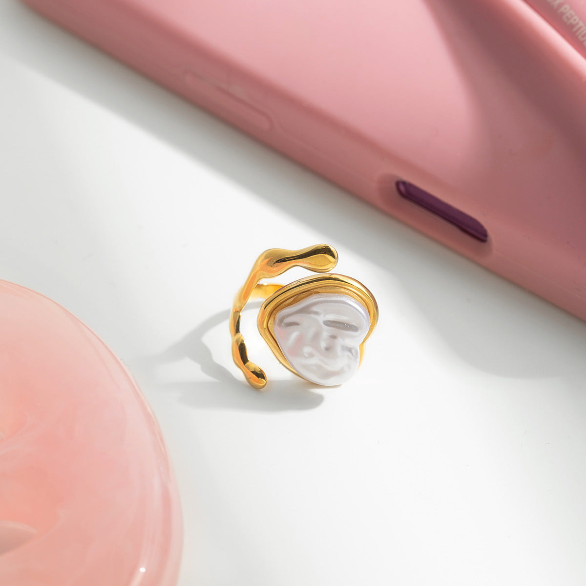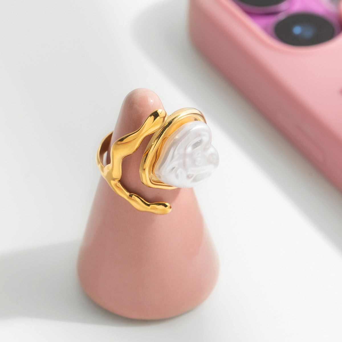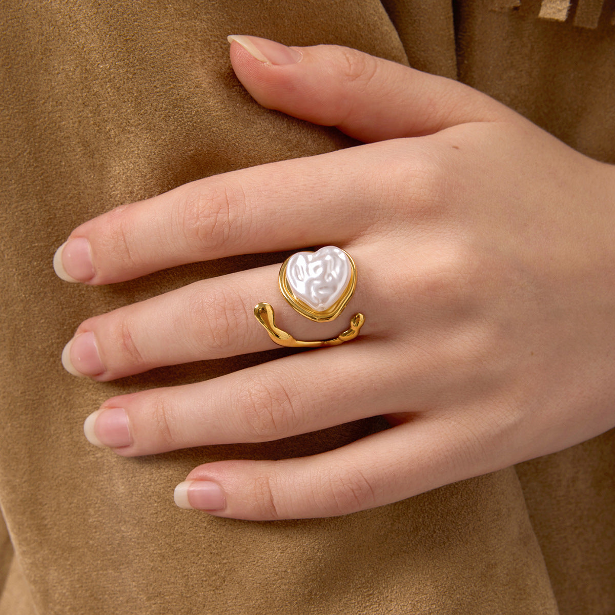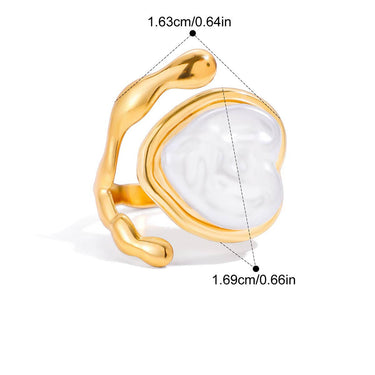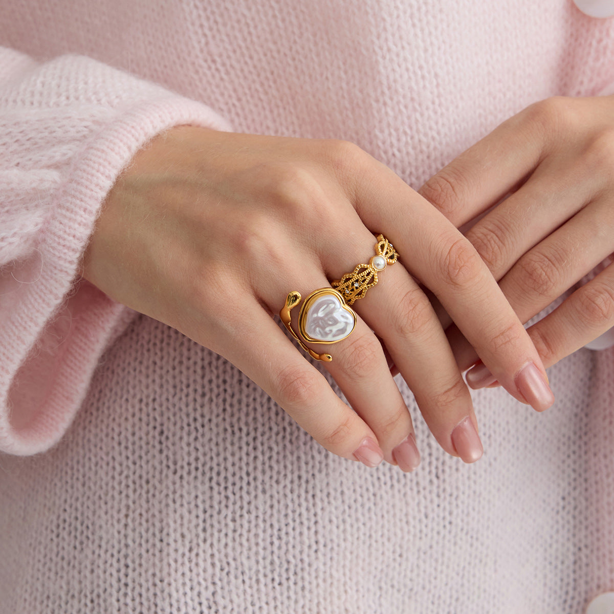 Two adjustable gold-finish rings designed with distinct character. One showcases a smooth, flowing band wrapped around a white heart centerpiece, while the other features detailed filigree patterns with a centered pearl. Both adapt easily to any finger, combining comfort with sculptural design.