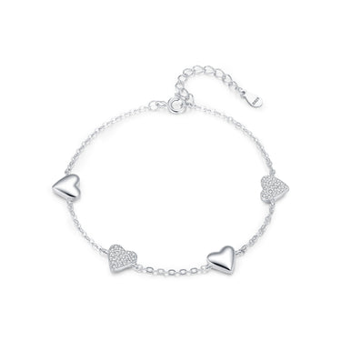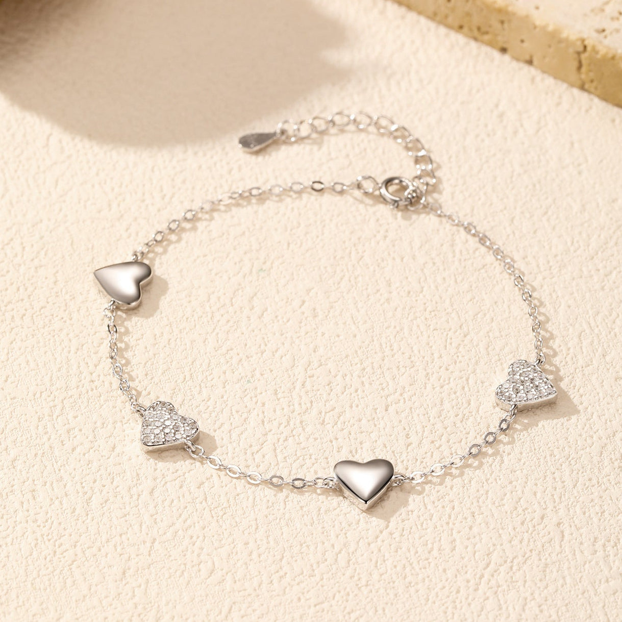 Four heart charms — two polished, two finely pavé-set — alternate across a 16+3 cm chain, giving this bracelet a romantic rhythm that feels both balanced and refined. Each heart measures 7.5 mm, creating a delicate texture that glows quietly on the wrist.