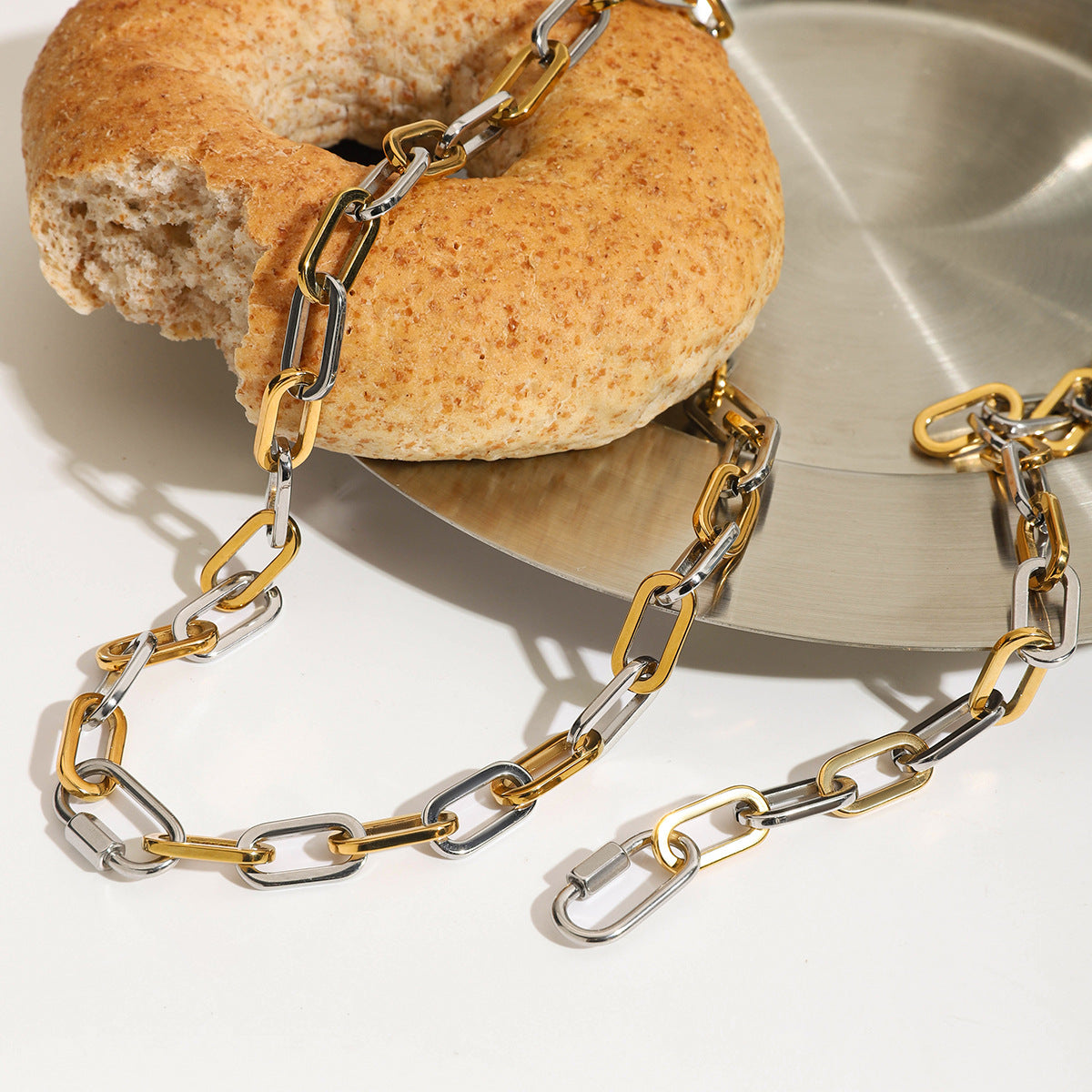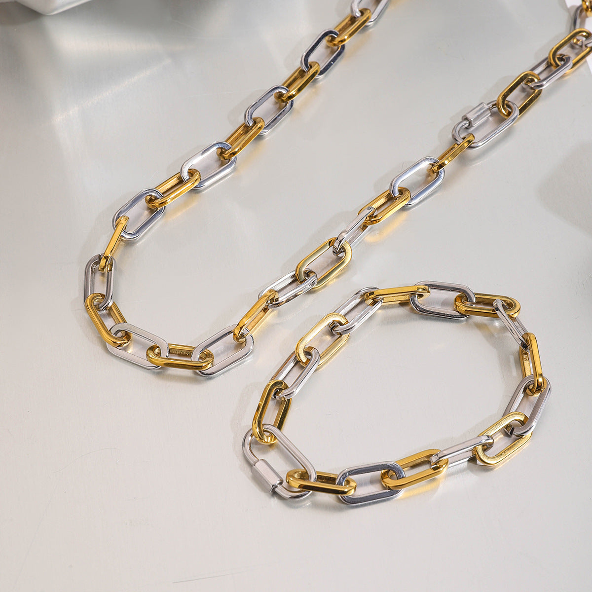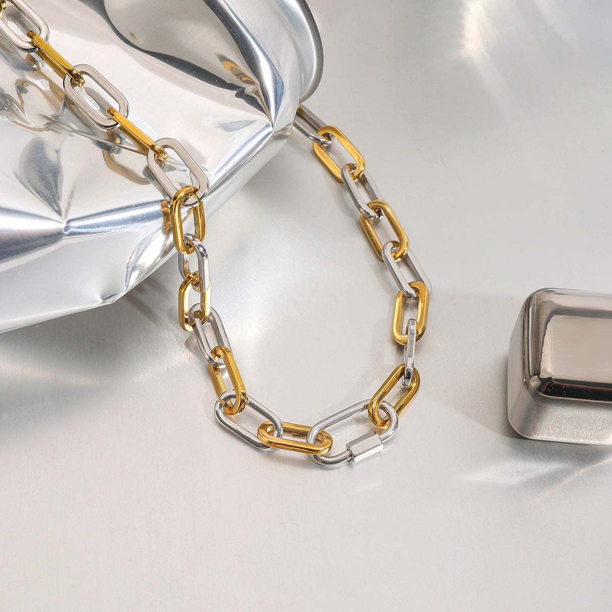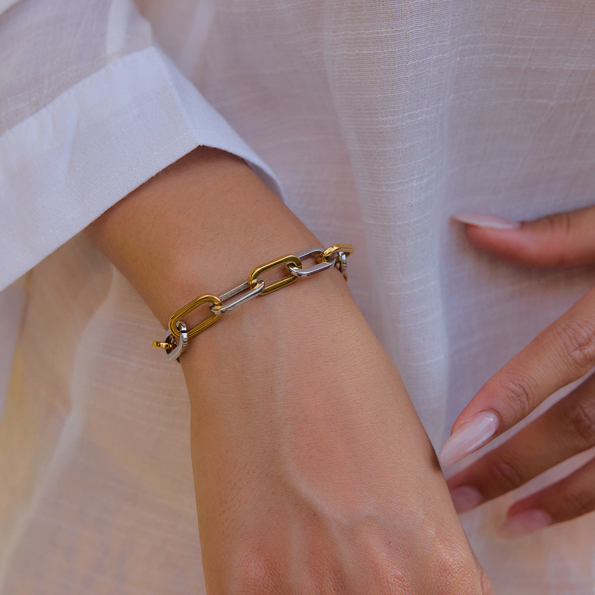 A refined dual-tone design that merges strength and precision. Each interlocking link alternates between platinum and gold finishes, creating a balanced statement of contrast and unity. Crafted from waterproof, hypoallergenic stainless steel with a seamless clasp, built for everyday wear with luxury presence.