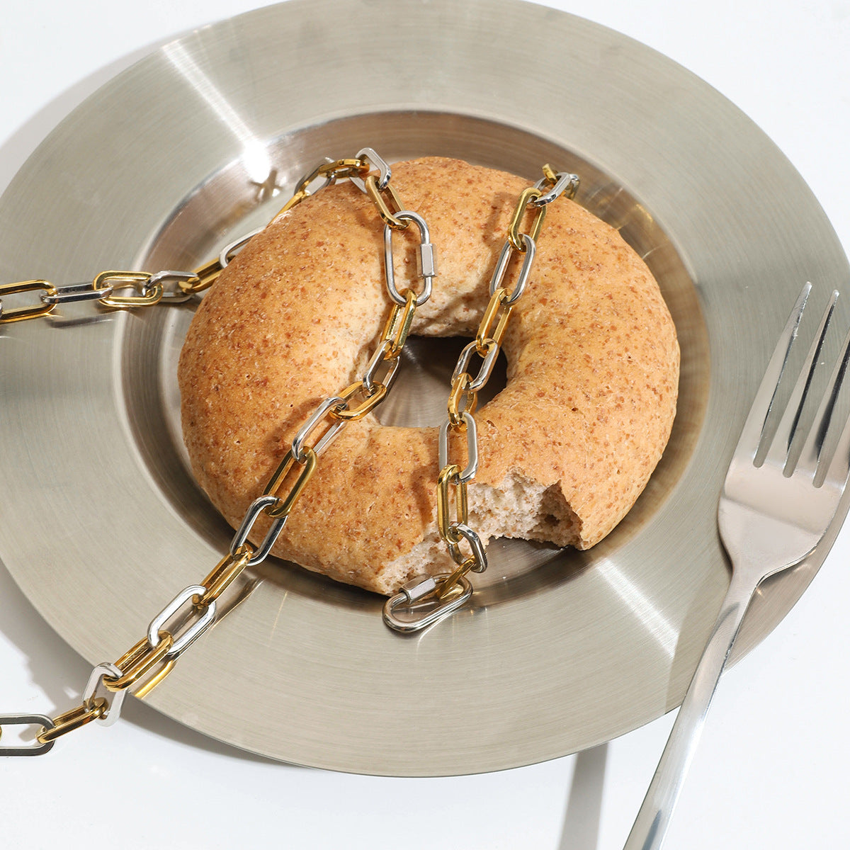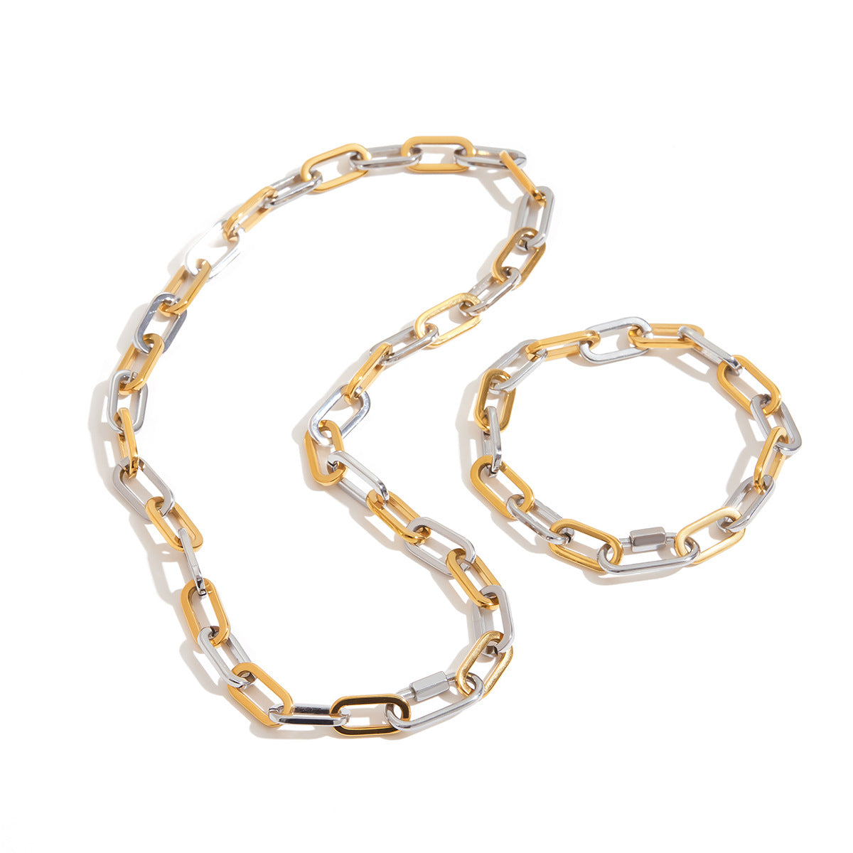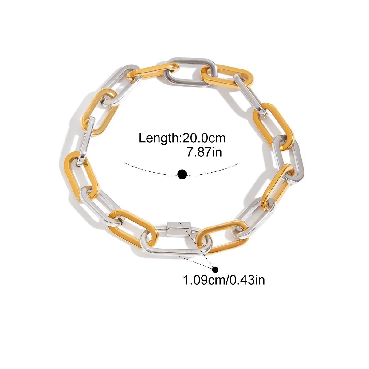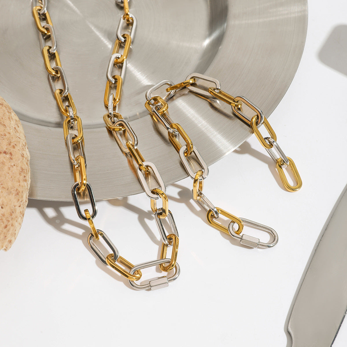 A refined dual-tone design that merges strength and precision. Each interlocking link alternates between platinum and gold finishes, creating a balanced statement of contrast and unity. Crafted from waterproof, hypoallergenic stainless steel with a seamless clasp, built for everyday wear with luxury presence.