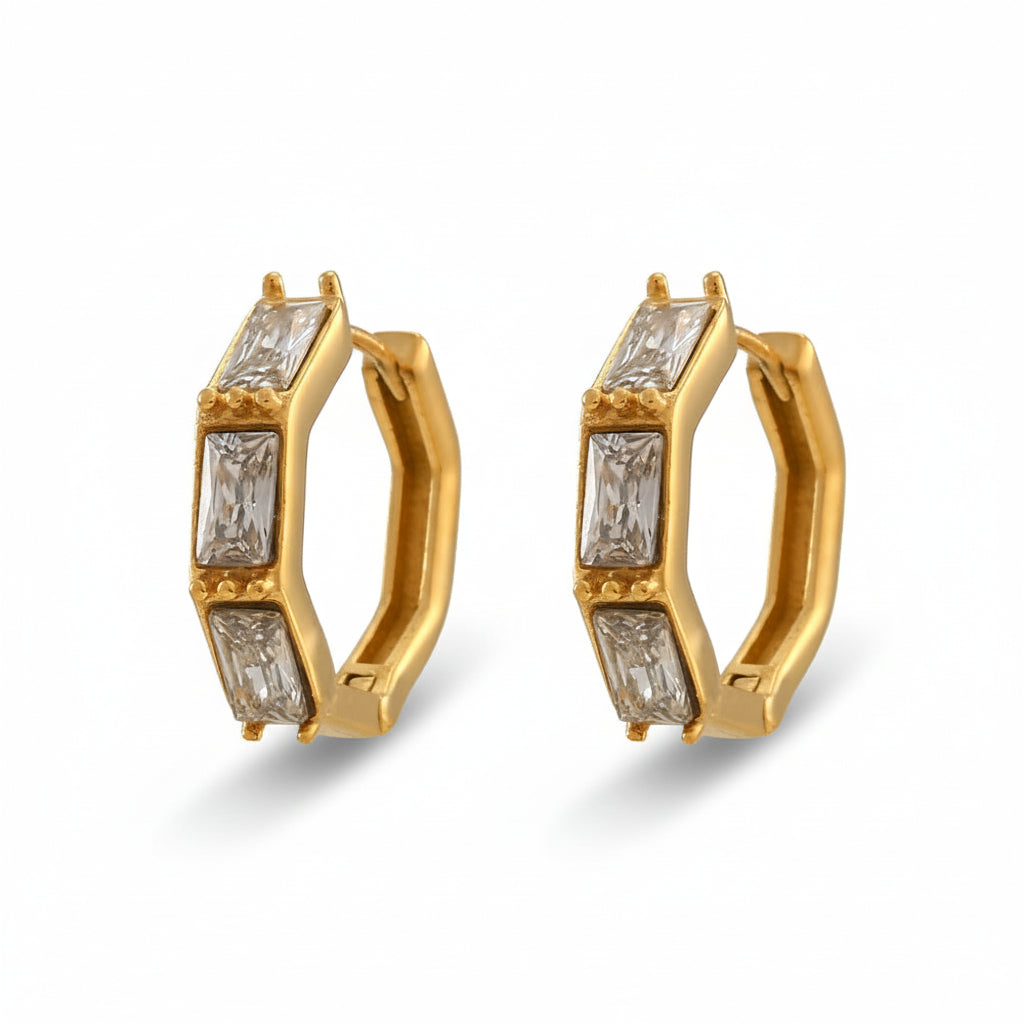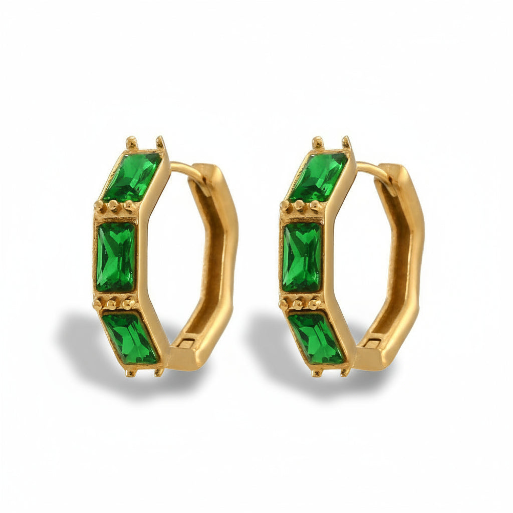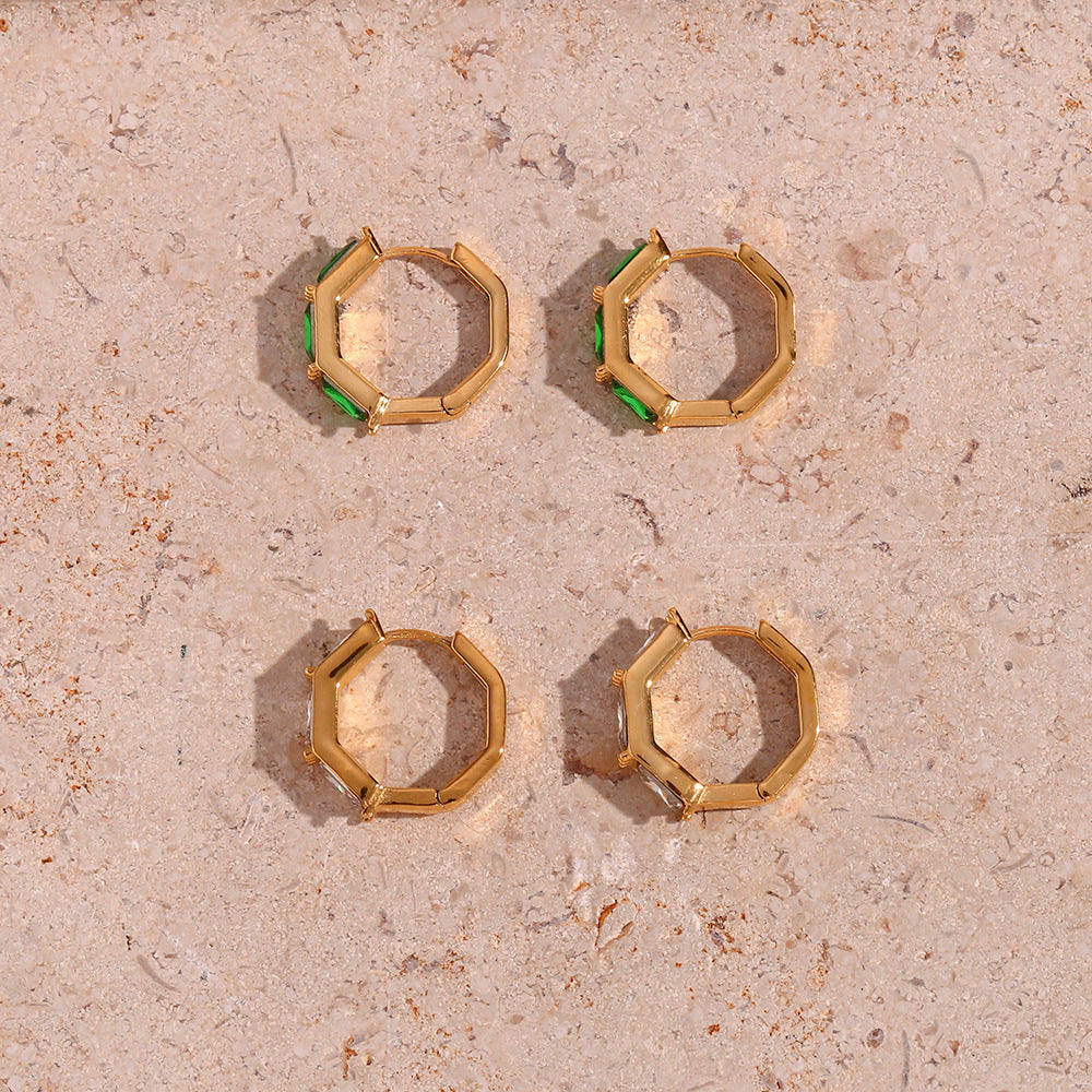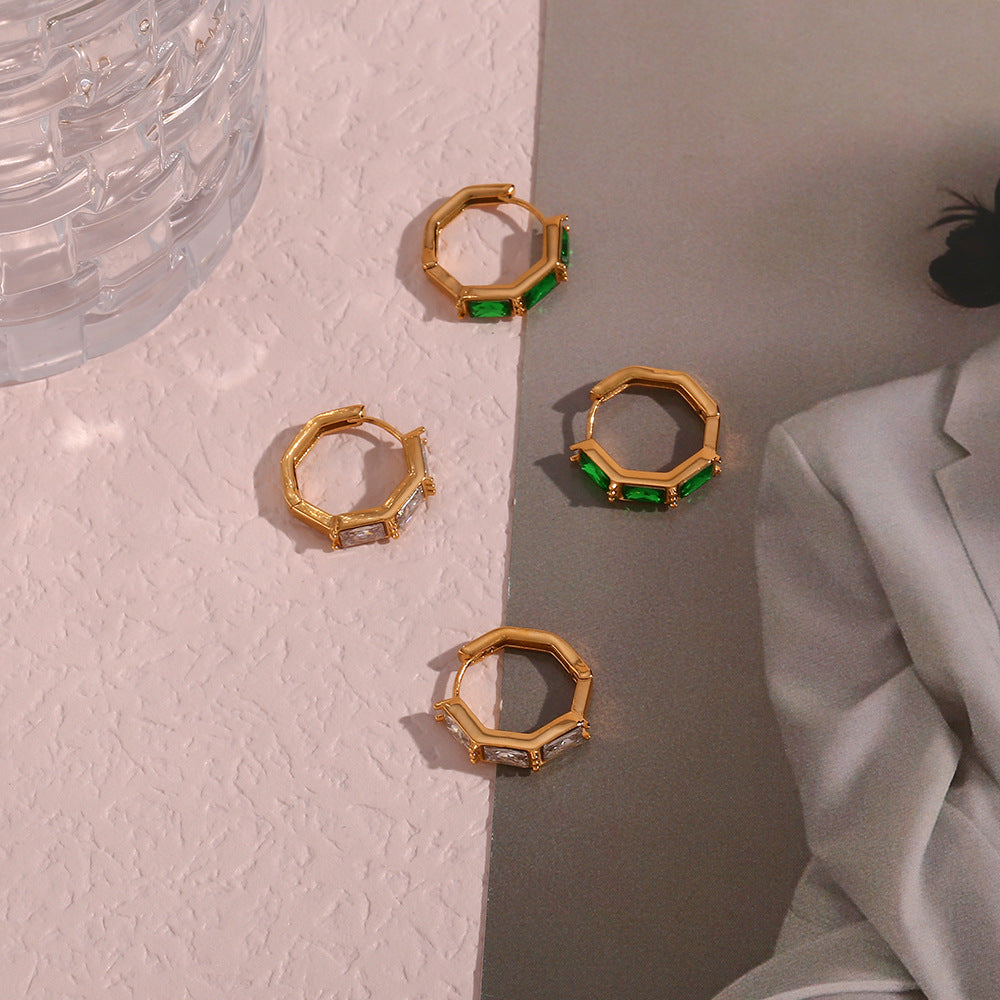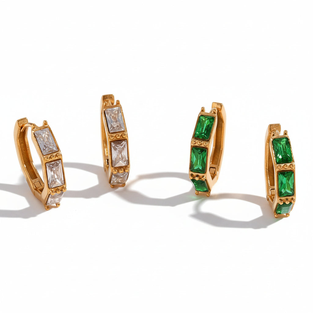 A refined twist on classic hoops — structured edges, square-cut stones, and a touch of bold geometry. The design captures the play between light and form, whether in deep emerald green or pure crystal white. Each pair frames the face with quiet confidence and radiant clarity.
