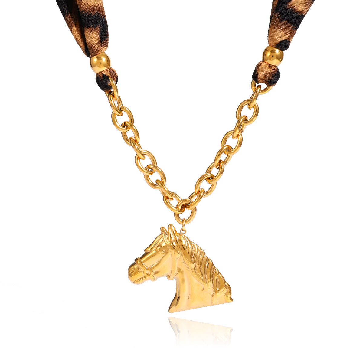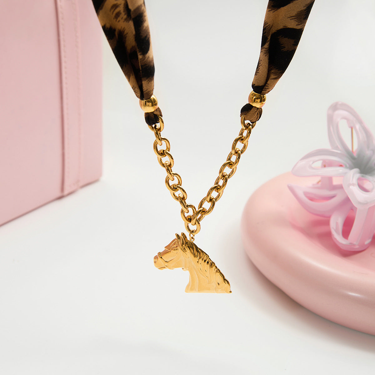 A statement of courage and command — the golden horse pendant embodies power in motion, anchored by a bold leopard-patterned ribbon that blends strength with sensuality. The sculpted chain creates balance between wild freedom and refined artistry, radiating confidence in every detail. Designed for those who move through life with unstoppable energy — Unglaz.