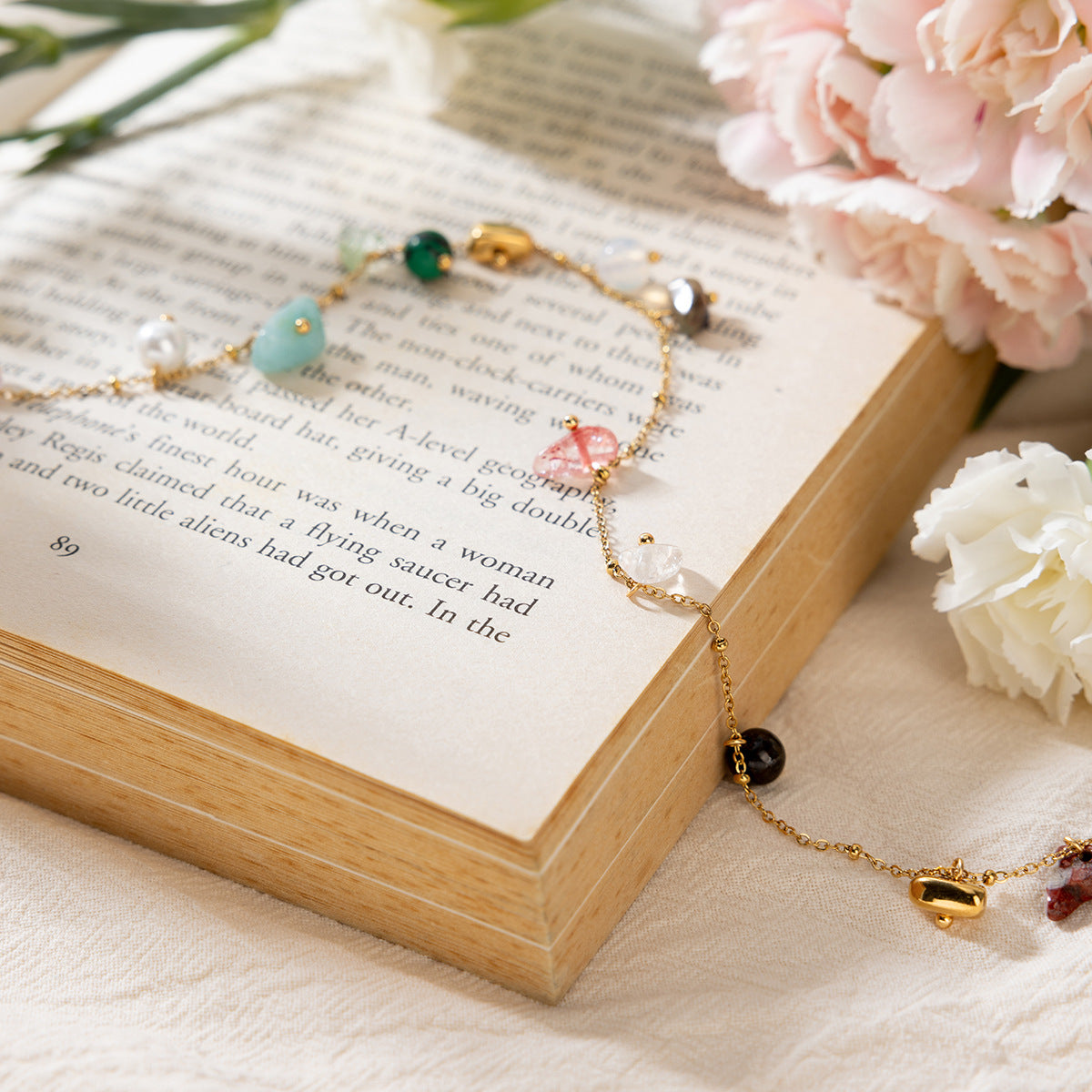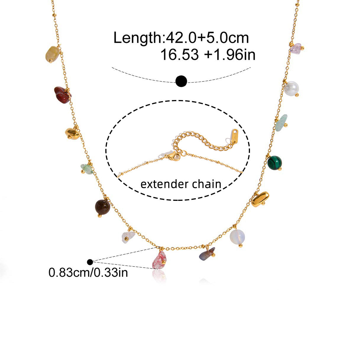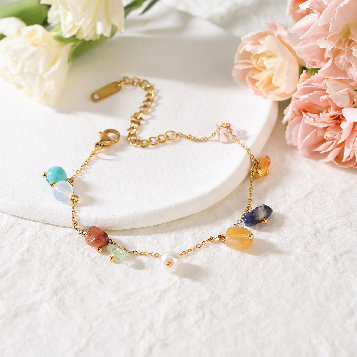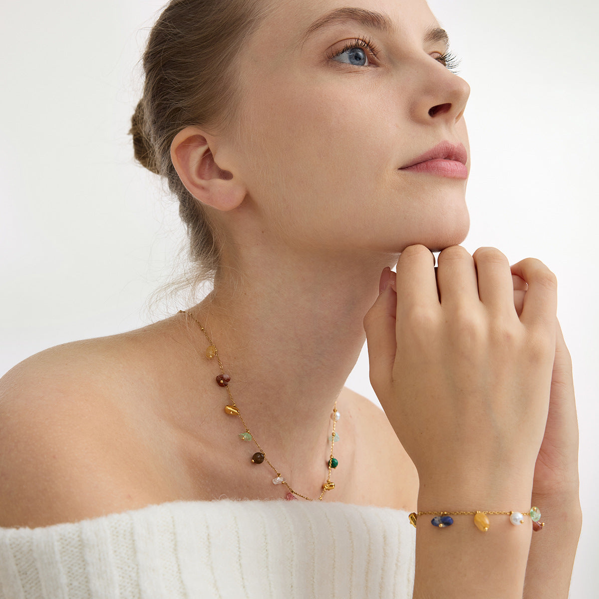 Vivid and balanced, this necklace and bracelet set features small, polished stones in a spectrum of natural tones. Each piece captures a quiet rhythm of color along a delicate gold-toned chain, creating a subtle play of light on the skin.