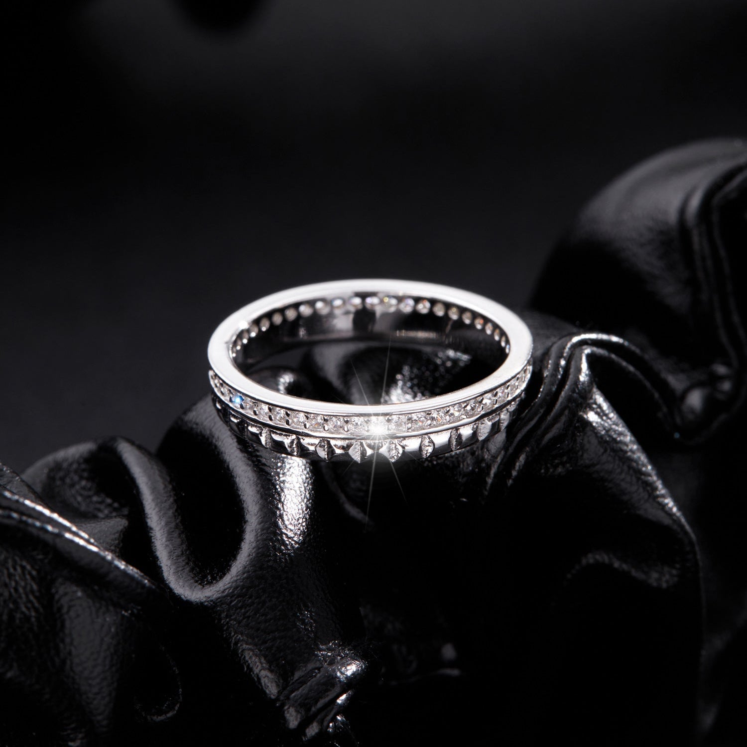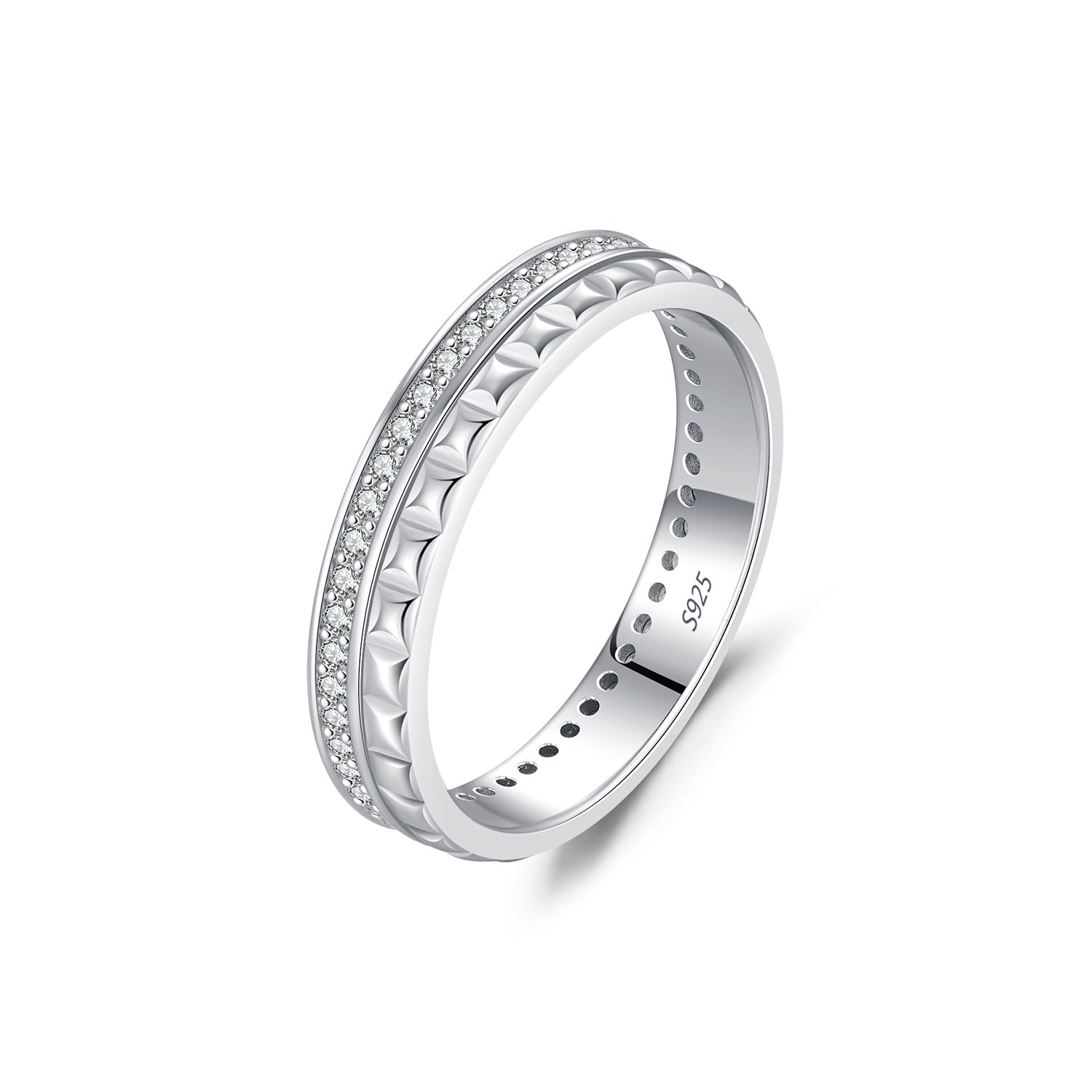 A refined band with a clean geometric texture framed by a row of subtle stones, creating a quiet shimmer with a structured edge. The slim 3.70 cm profile and 2.56 g weight keep it light, modern and effortlessly elegant on the hand.