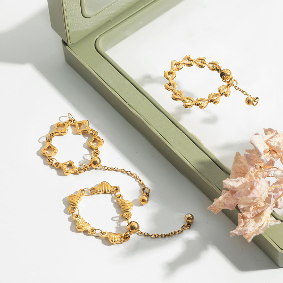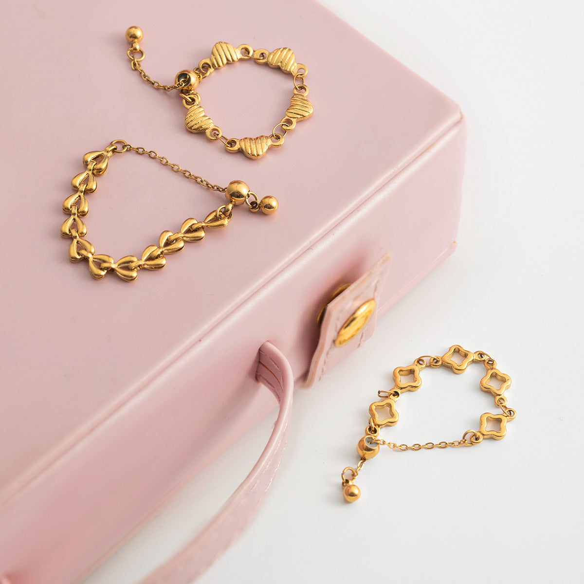 Three delicate gold rings, each crafted with its own unique silhouette — soft hearts, sculpted clovers, and folded waves. Their adjustable design ensures a perfect fit, blending comfort with a subtle glow that elevates any look. Lightweight, waterproof, and hypoallergenic, this trio reflects the effortless elegance and refined charm of Unglaz.