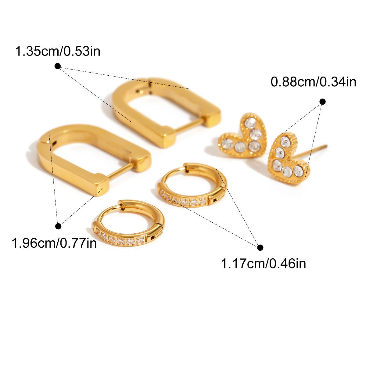 A refined trio designed for effortless layering, this earring set blends geometry, sparkle, and charm. The polished U-shaped hoops bring modern structure, the crystal-lined huggies add subtle brilliance, and the heart studs deliver a touch of softness. Together, they form a perfectly balanced statement — versatile, graceful, and distinctly Unglaz.