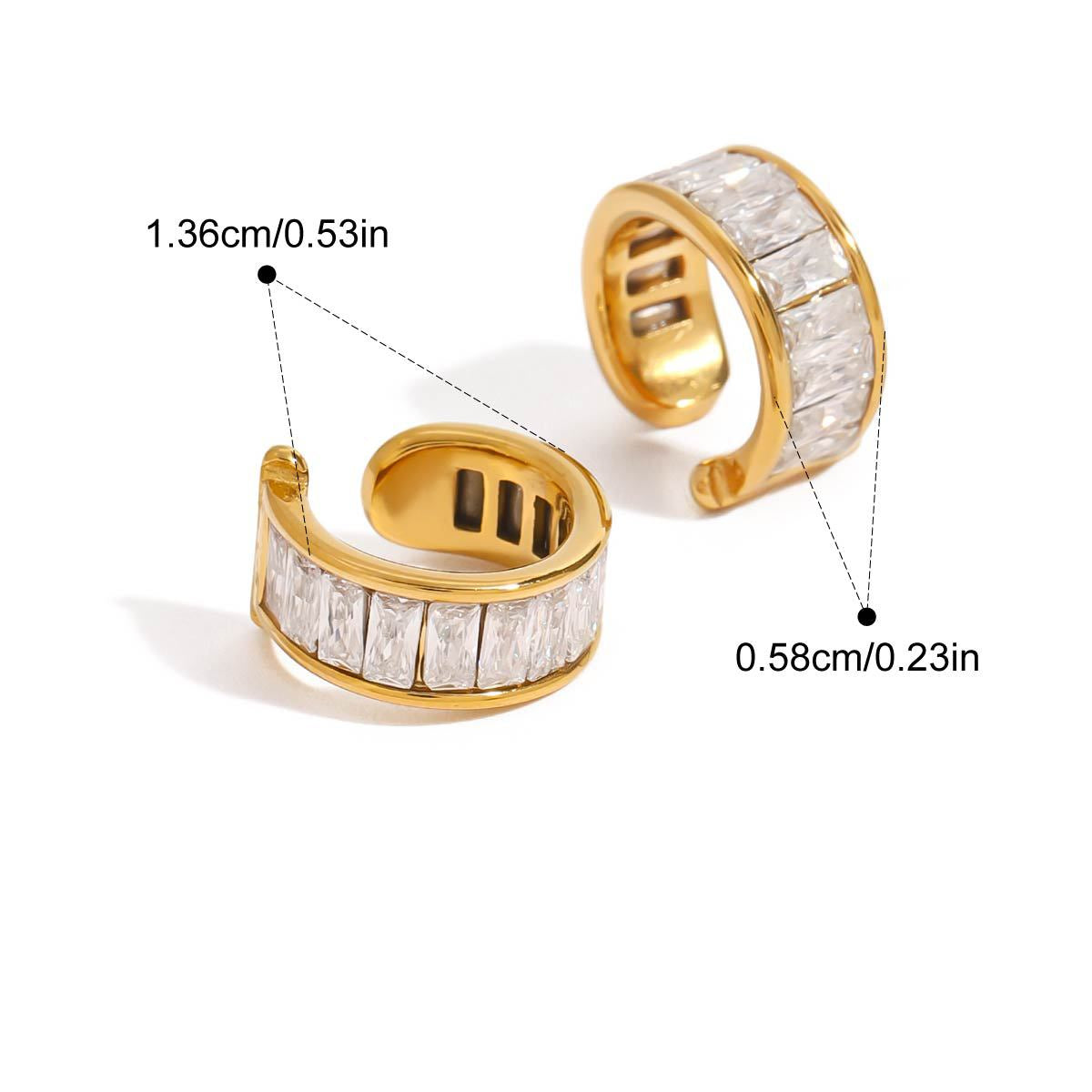 Crafted for daily wear with smooth edges, stable weight, and comfortable fit. Stone dimensions 0.93 cm by 1.86 cm. Baguette cuff size 1.36 cm by 0.58 cm. Rounded cuff diameter 1.5 cm with a 0.4 cm opening. Total combined weight 16.5 g. Waterproof and hypoallergenic.