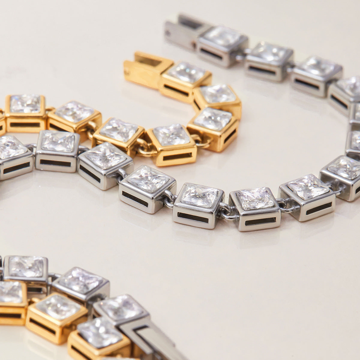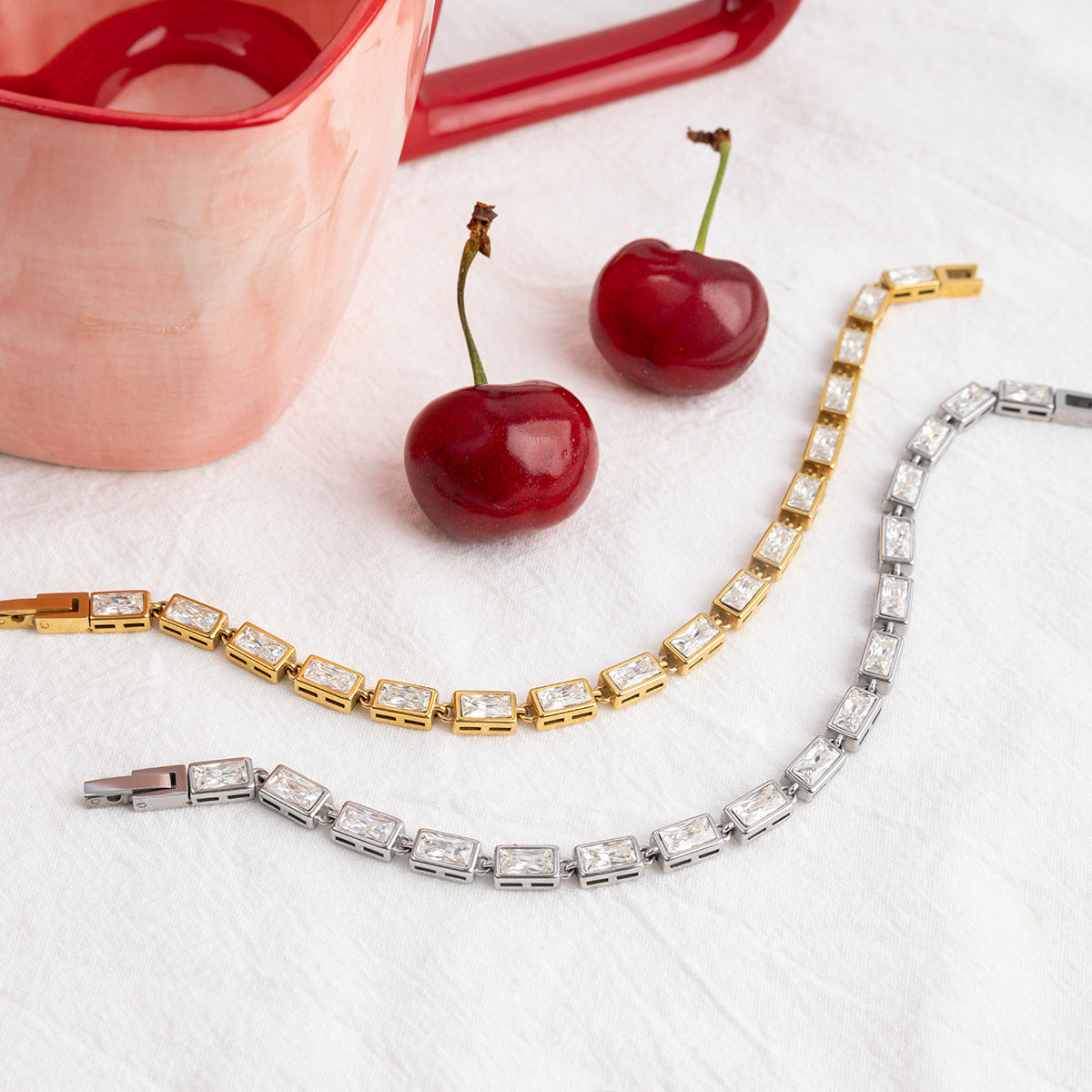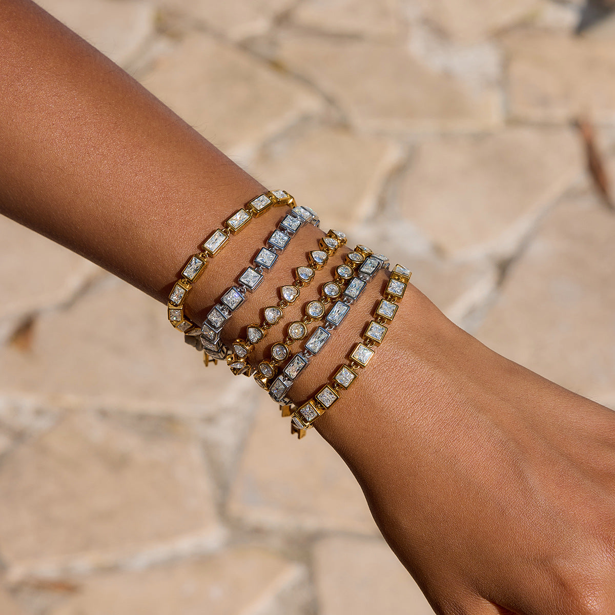 A statement piece for any occasion. Each bracelet features meticulously cut zircon stones in geometric or heart silhouettes, capturing the light with every movement. Designed with a waterproof and hypoallergenic finish, they combine durability with refined elegance — a modern essential with timeless appeal. Crafted with the signature precision of Unglaz.