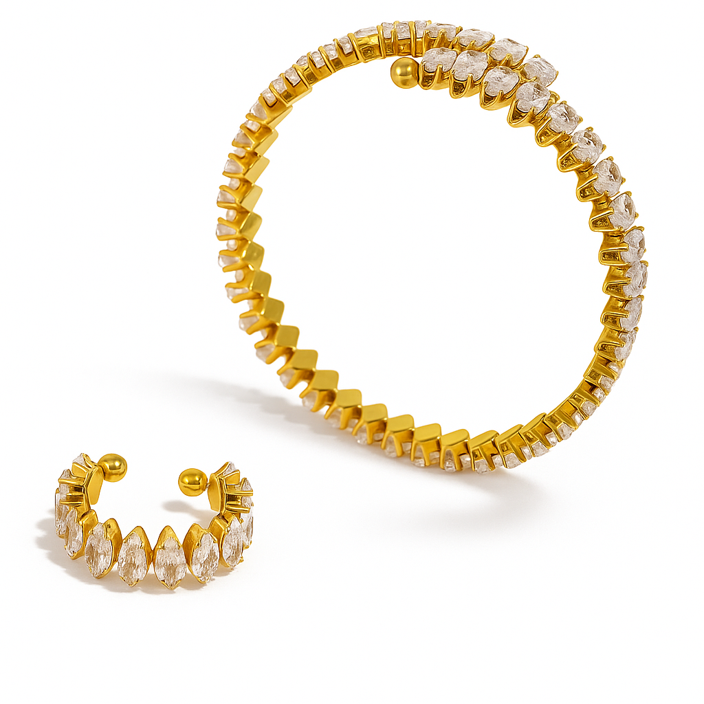 The photo shows a matching ring and bracelet set featuring marquise-cut stones arranged in a symmetrical line, set in polished gold tone. Both pieces share identical design language — refined brilliance and lightweight comfort.