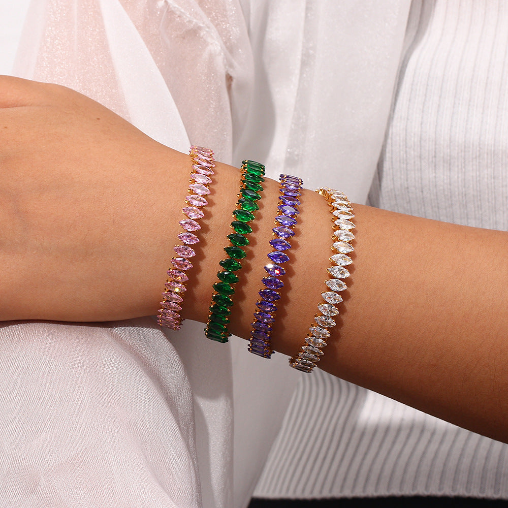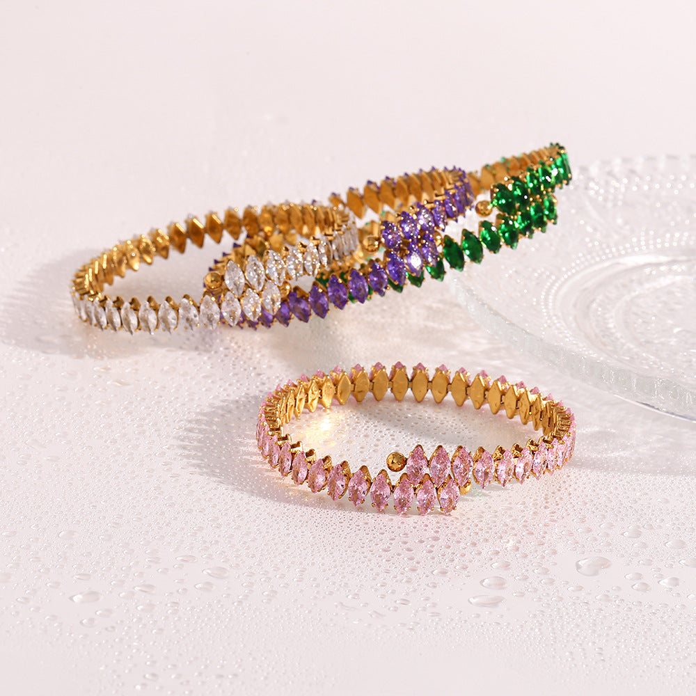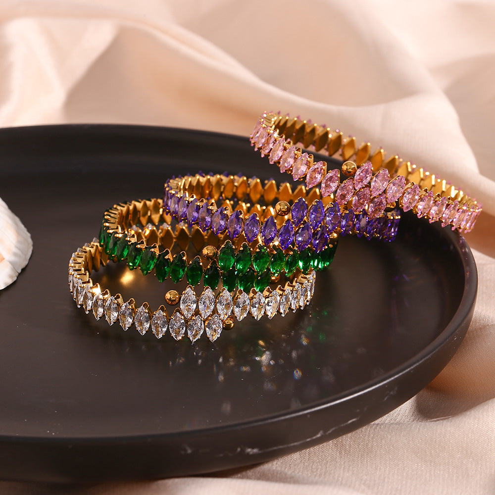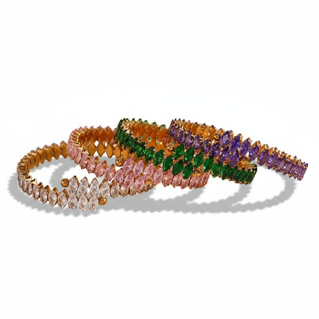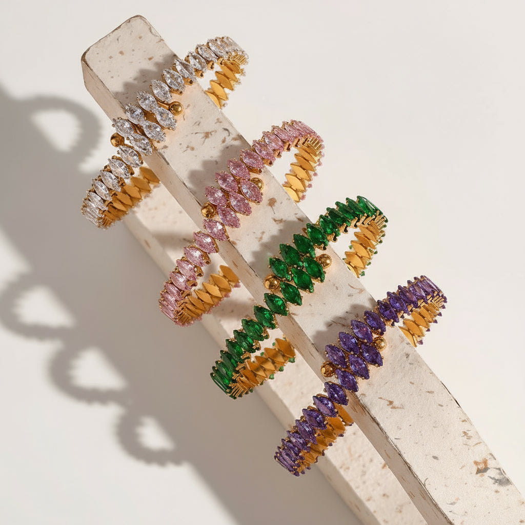 A vivid symphony of color and light — each stone shaped in elegant marquise cut, catching reflections with every movement. Whether in soft pink, emerald green, ocean violet, or crystal white, it’s a piece that transforms the ordinary into something magnetic.