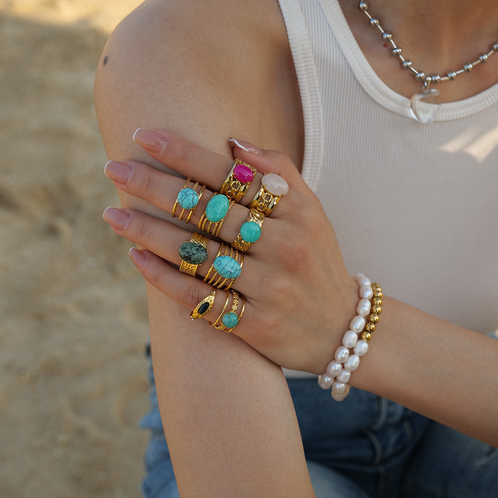 Each ring in this set speaks in silence—smooth lines, natural shapes, and the quiet strength of stone. Worn together or apart, they orbit your hand like calm planets, reminding you of the beauty in simplicity and the quiet power you carry. There is nothing to prove—only to feel, to move, to be.