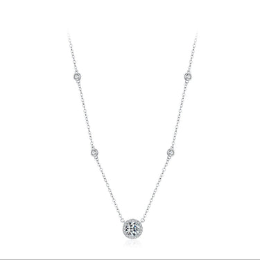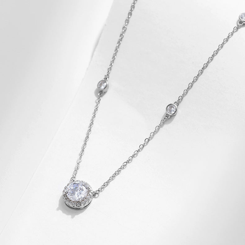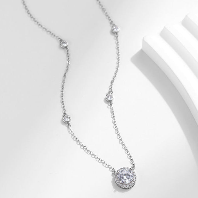 A quiet shimmer that rests gently on the skin, bringing a soft touch of clarity to your everyday glow. The round center stone sits in a 7 mm silhouette, lifted by two subtle 4 mm accents that guide the eye toward its clean, balanced sparkle. Together, they create a light line of radiance along the collarbone, elegant without trying.