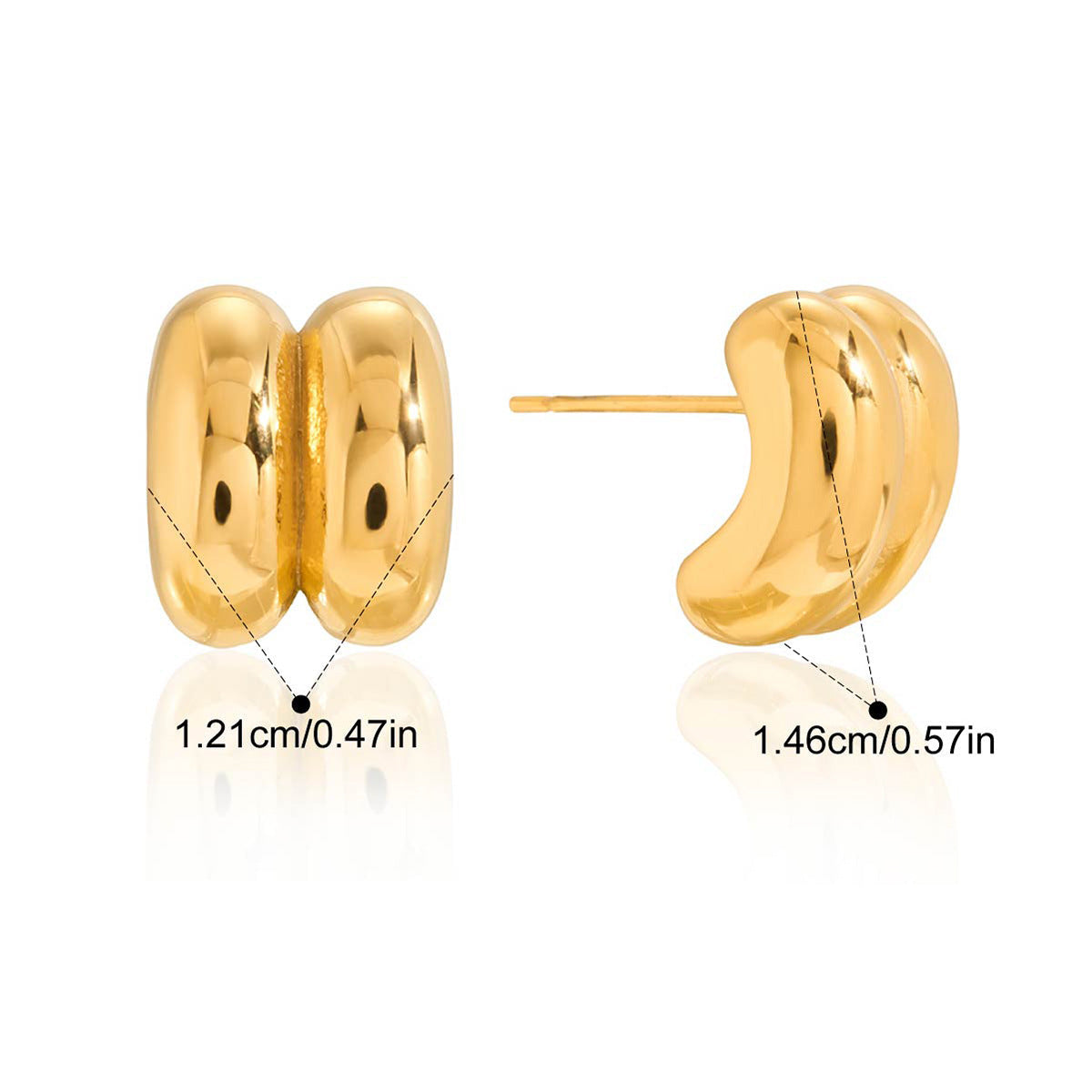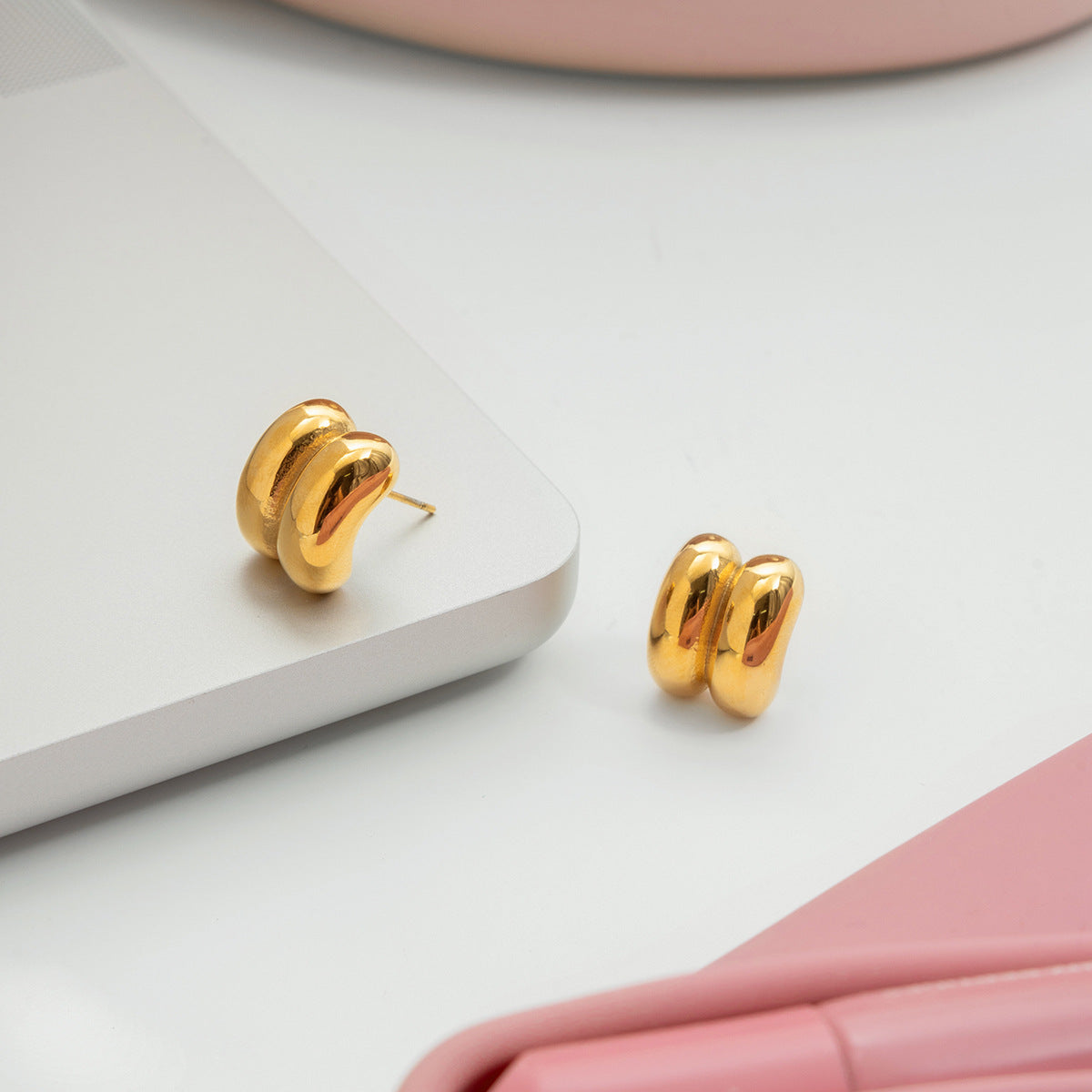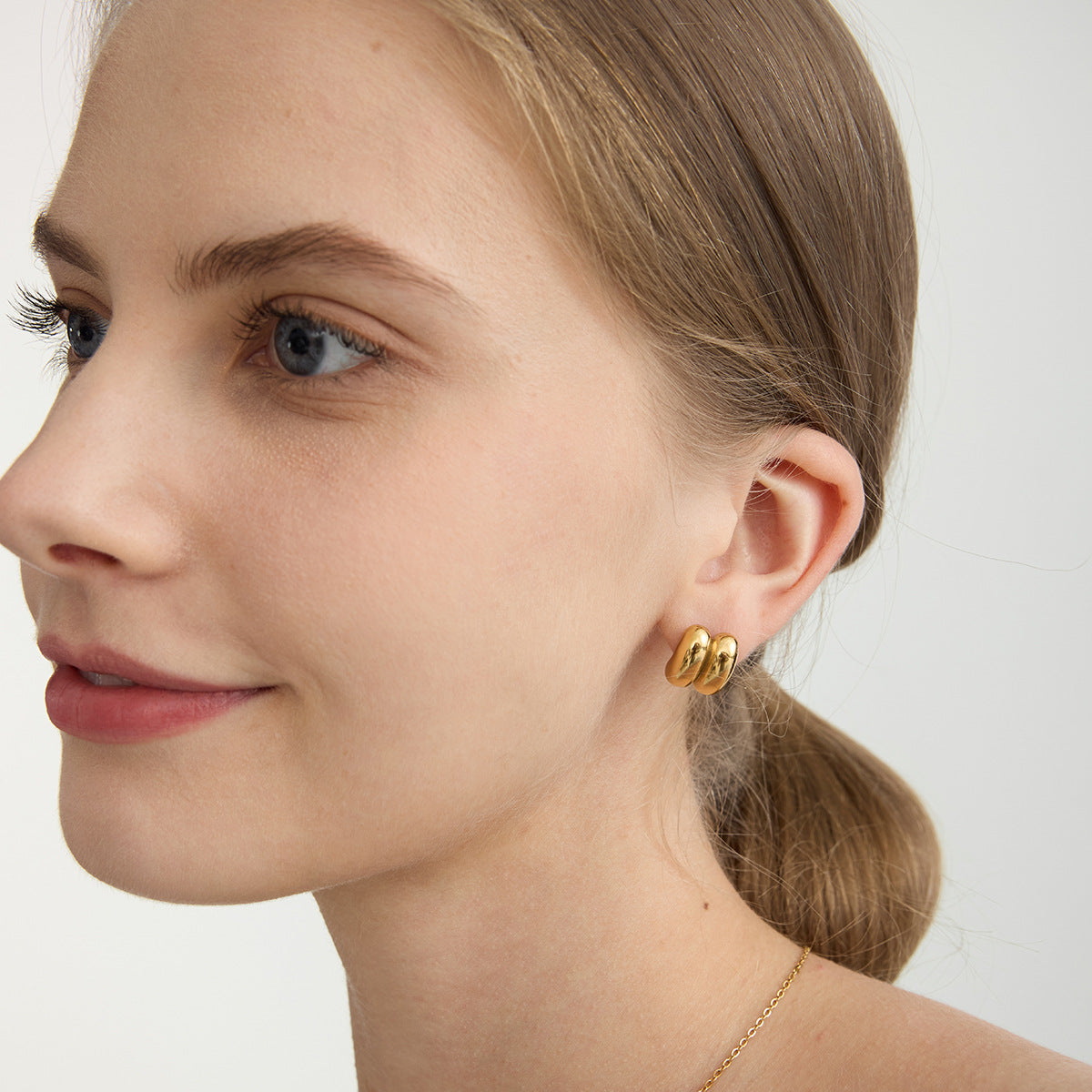 Compact sculptural earrings defined by their rounded, fluid shape and mirror-like gold finish. The curved double-layer form creates a bold yet balanced profile that catches light from every angle. Measuring 1.46 cm in height and weighing 6.5 g, they feel solid yet comfortable for daily wear.