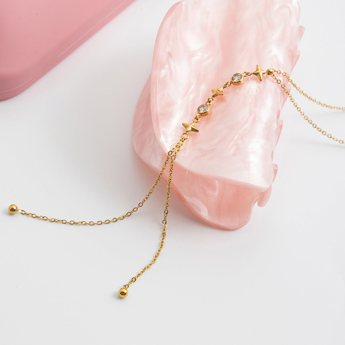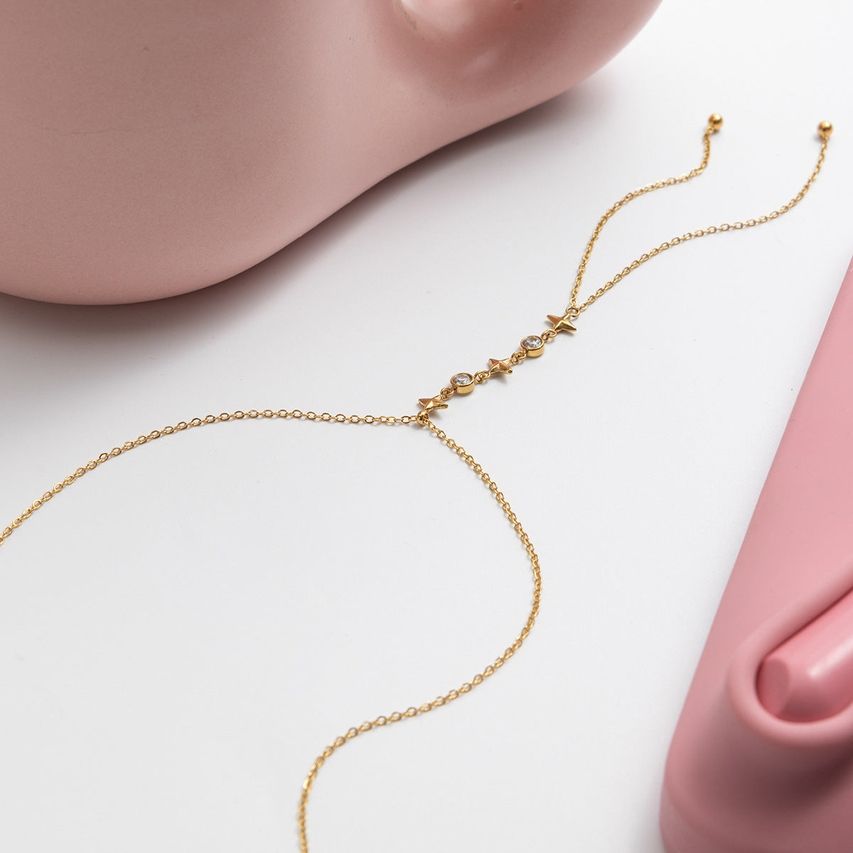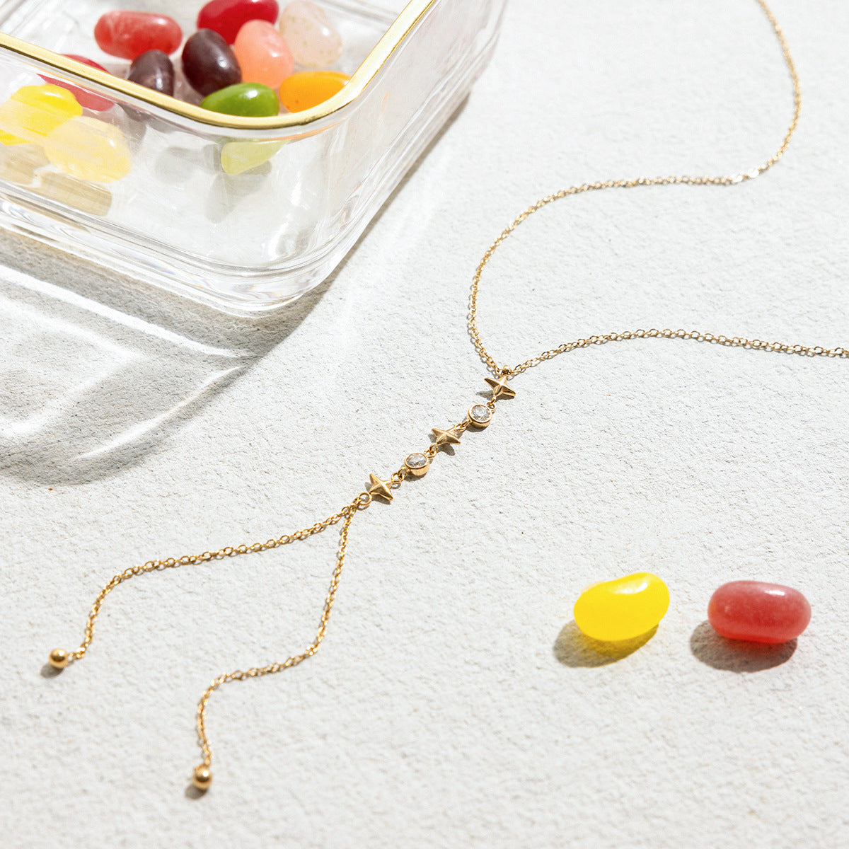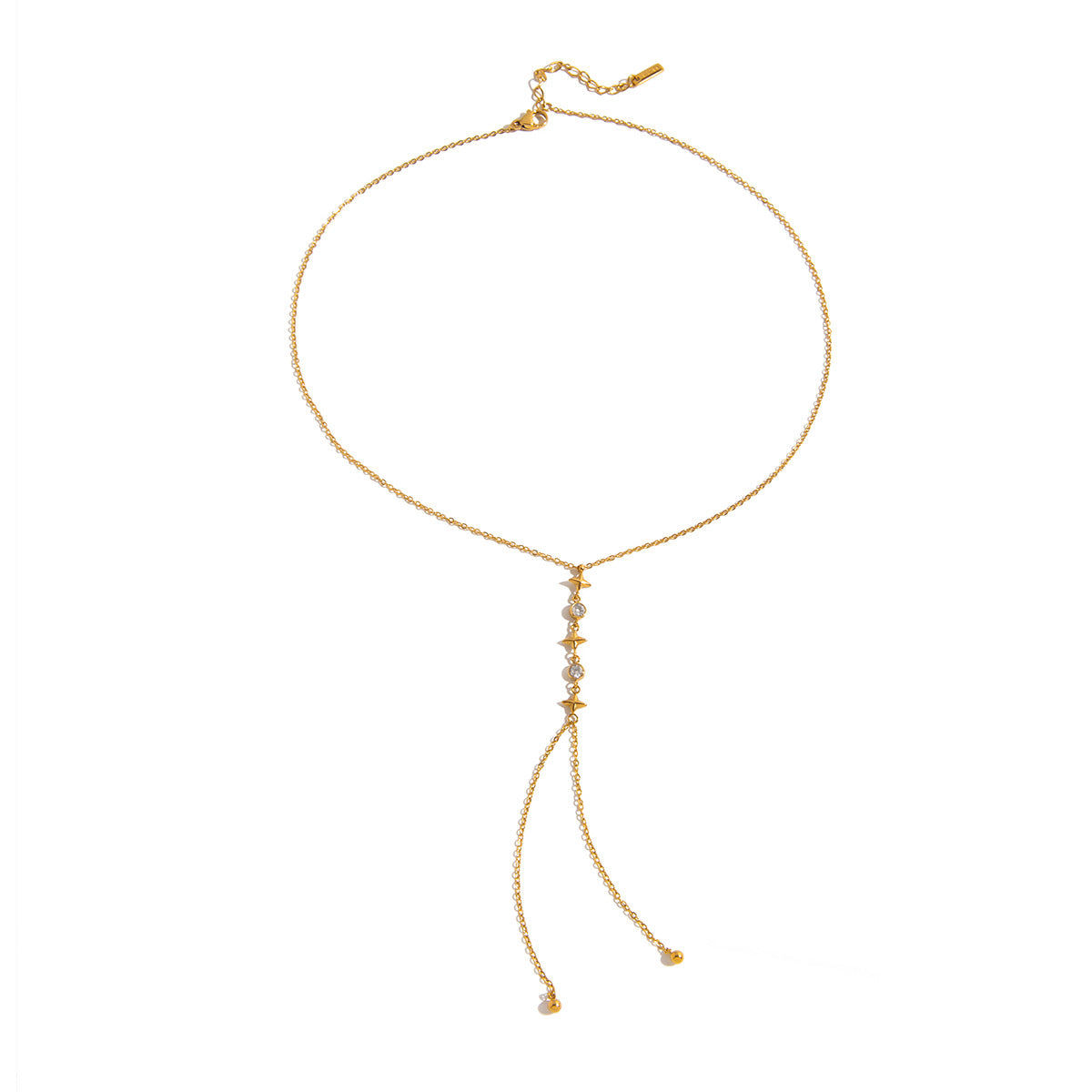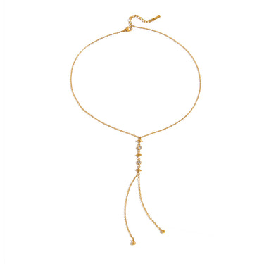 A delicate Y-shaped necklace featuring fine gold-tone chains and crystal accents, creating a graceful line that elongates the neckline. Lightweight yet eye-catching, it pairs beautifully with layered pieces for a luminous, seaside-inspired look.