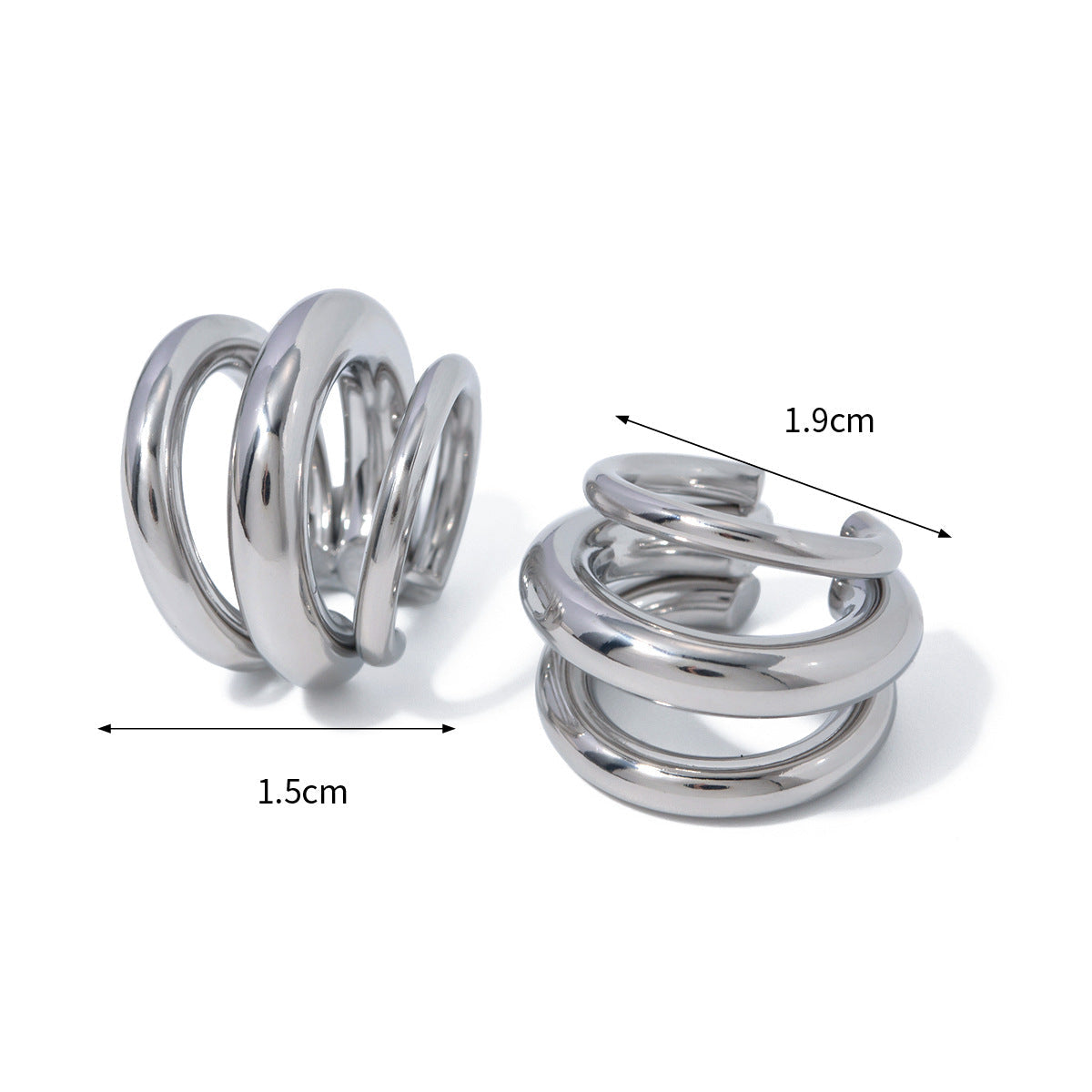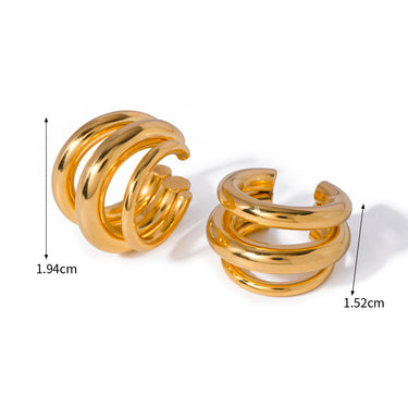 Bold sculptural design meets refined geometry in these triple-layered hoop earrings. Their thick, curved silhouette creates a statement look while maintaining a clean, modern feel. Crafted with a mirror-like polish, available in both gold and silver tones. Lightweight yet substantial at 14.6g, these earrings embody power and balance.