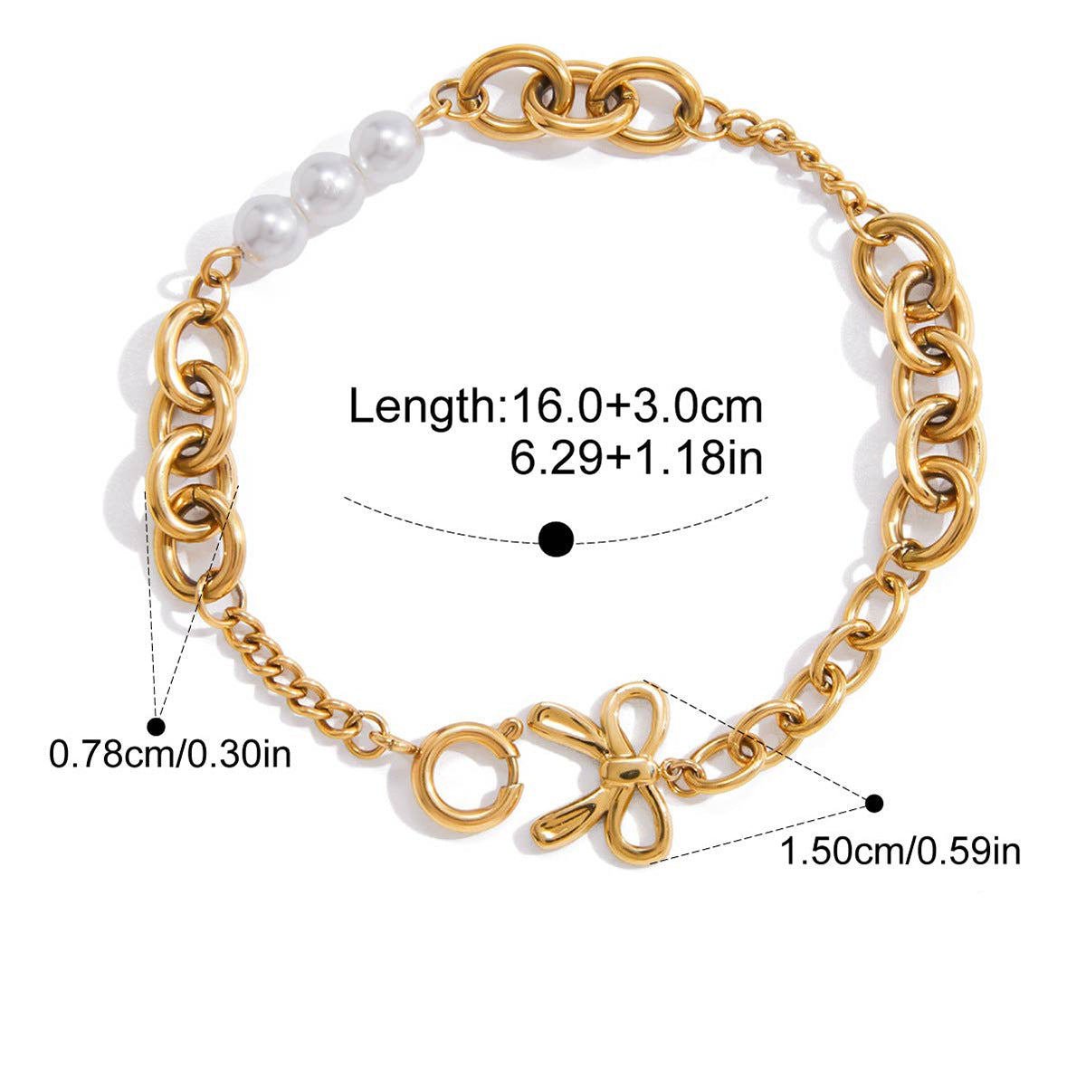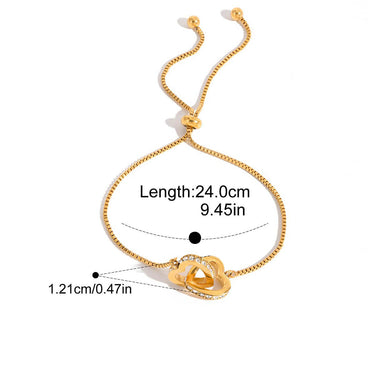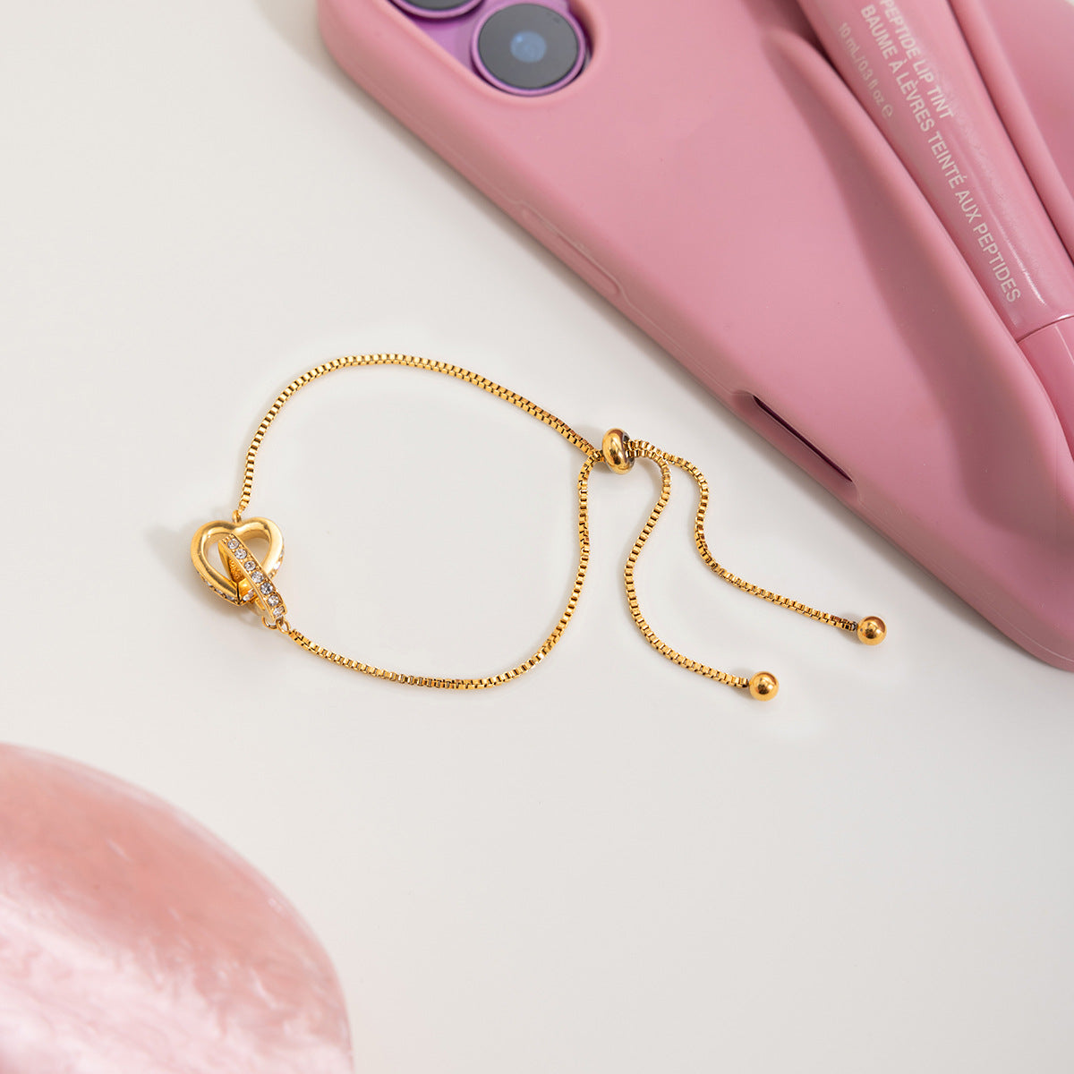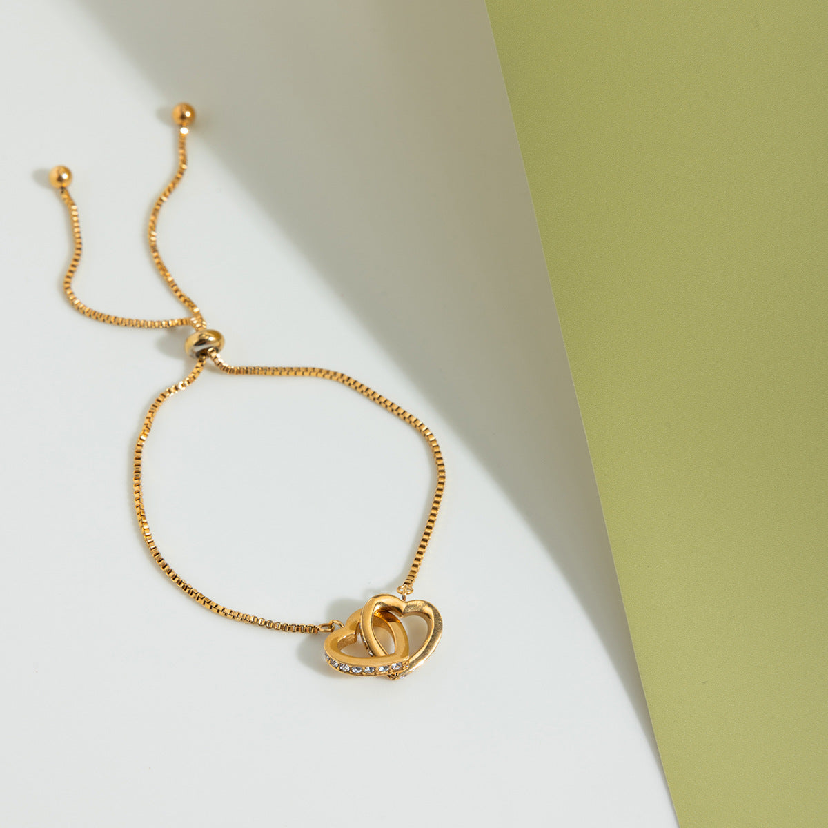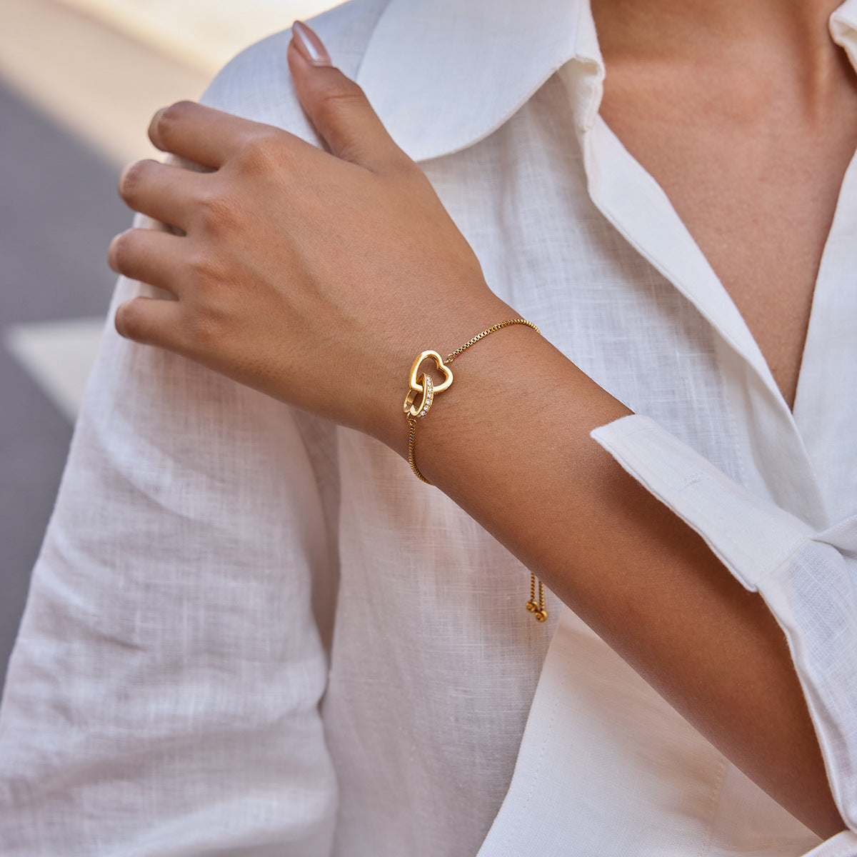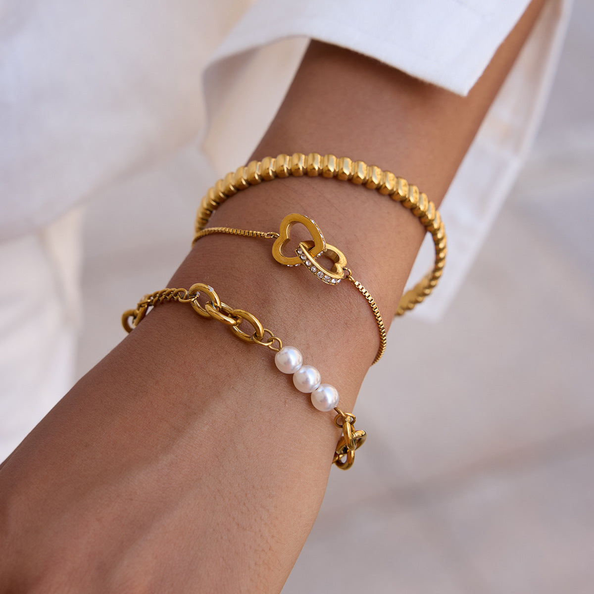 A set of three gold-finish bracelets, each built with distinct form and balance. One features a linked chain with pearl accents and a small bow clasp. Another showcases a flexible structure of smooth rounded shapes with a solid, uniform surface. The last piece includes a sliding chain with an interlocking double-heart detail, creating a light and adjustable fit. Together they form a cohesive combination that transitions easily between styles.