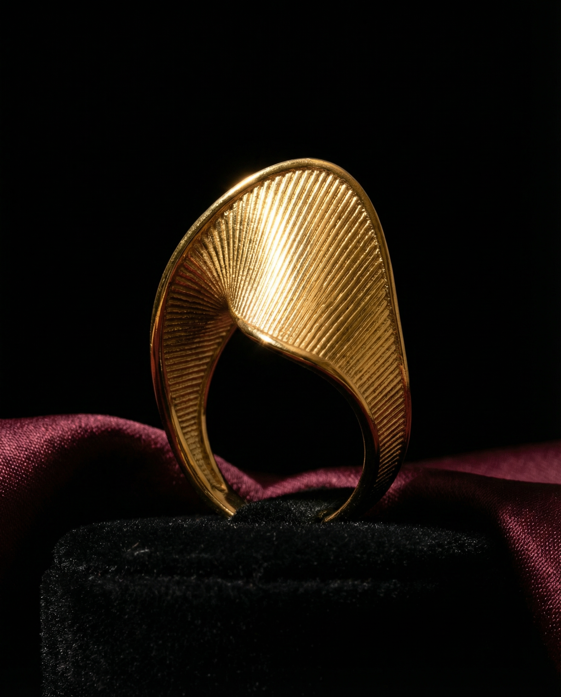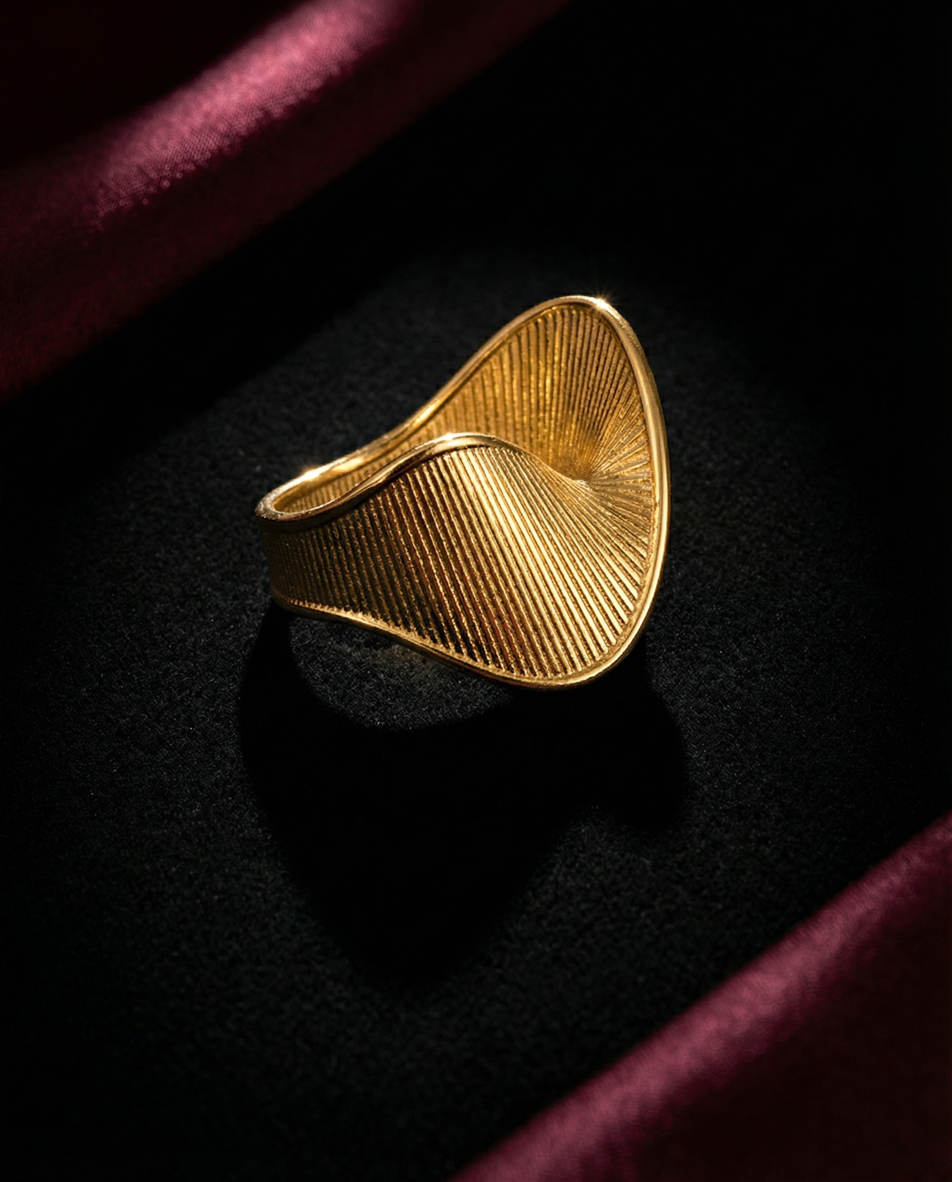 Twenty-one millimeters of twisted conviction on your finger. Diagonal stripes corrugate across sculptural surface that refuses flat logic—twisted form creates dimensional presence proving rings don't require symmetry. Each stripe catches light differently as metal curves through space. 4.9 grams means statement without burden. Available in sizes that fit because geometry this bold deserves precision. This isn't stacking jewelry—it's singular twisted architecture claiming knuckle territory.