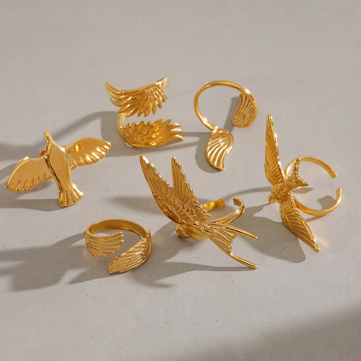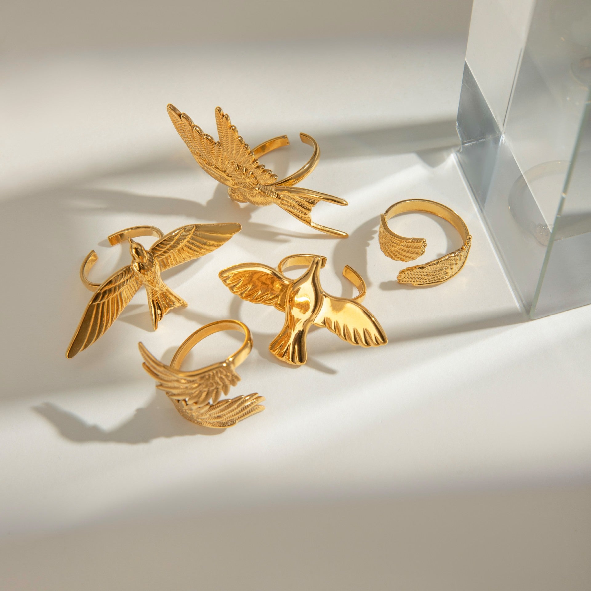 Rings inspired by the grace and power of flight — each design captures the essence of freedom, transformation, and strength. The sculpted wings and soaring silhouettes evoke movement and lightness, creating pieces that feel both bold and poetic.