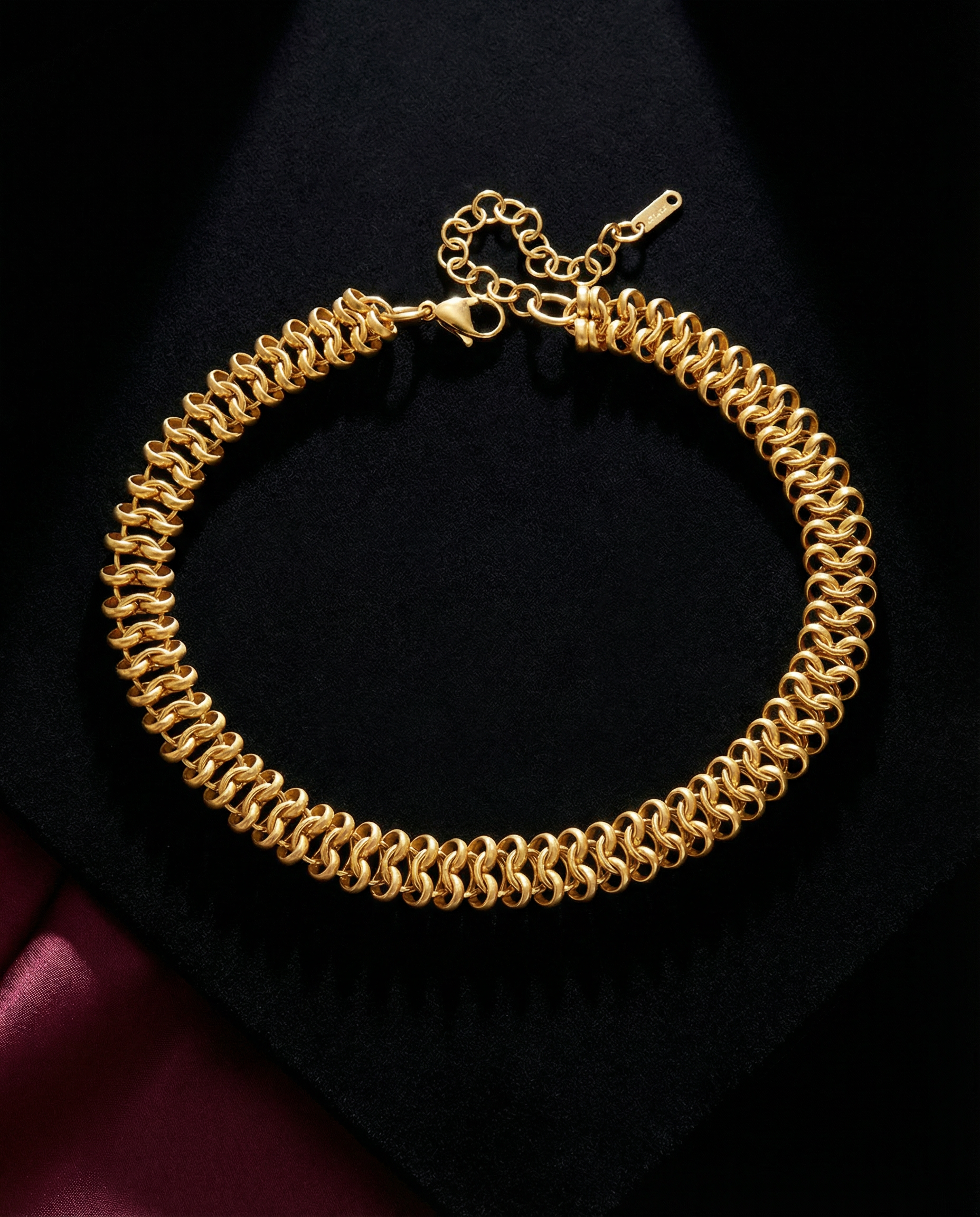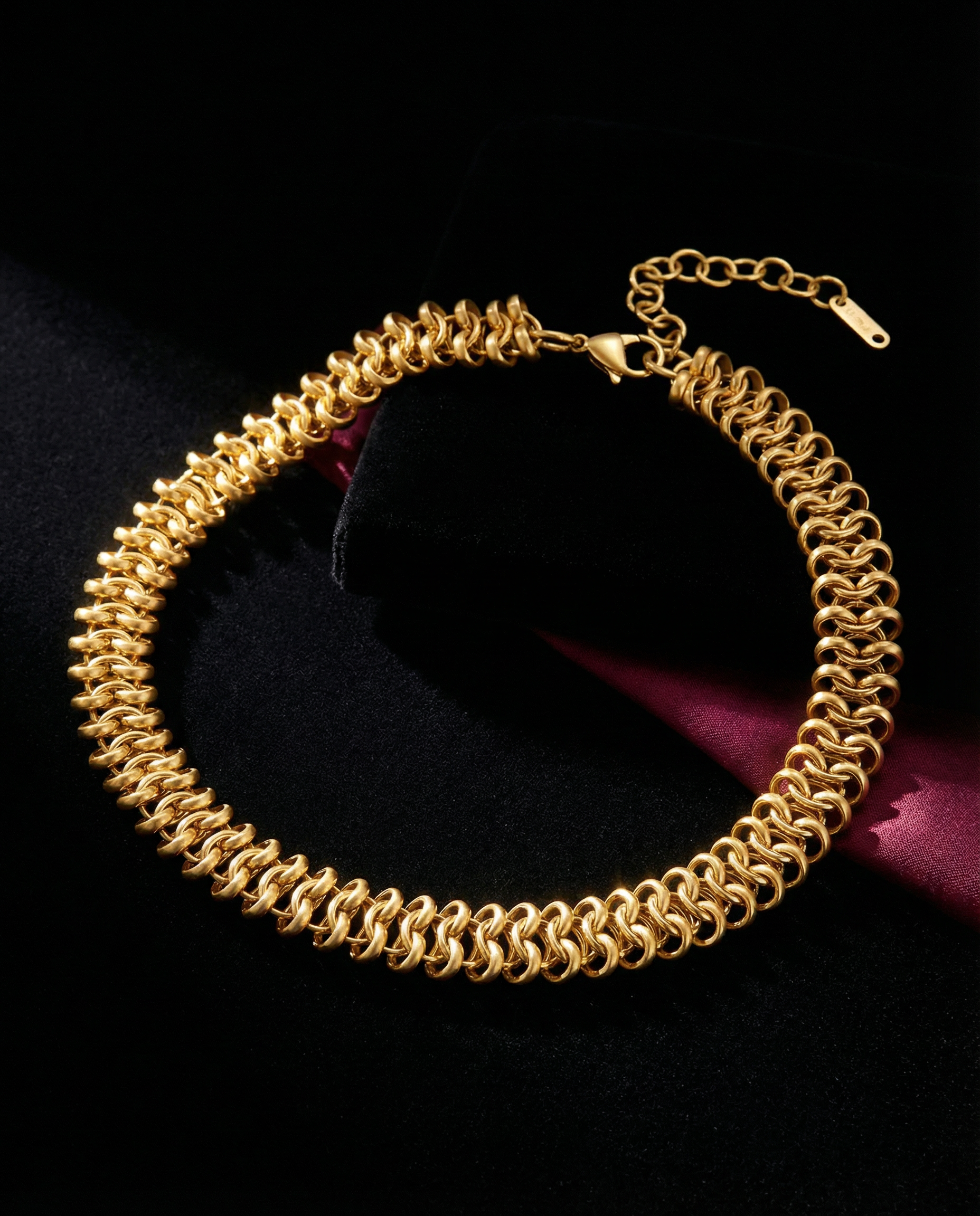 Thirty-three centimeters of sculptural coil refusing delicate chain logic. Each link a compressed spiral—polished gold wound tight then released into 12mm of substantial presence. Not links that connect but coils that claim. Sits at collarbone where pulses are, 38.3 grams reminding you it's there without asking permission. Extender chain matches the coiled aesthetic because coherence matters. This isn't layering jewelry—it's singular territorial marking at the throat.
