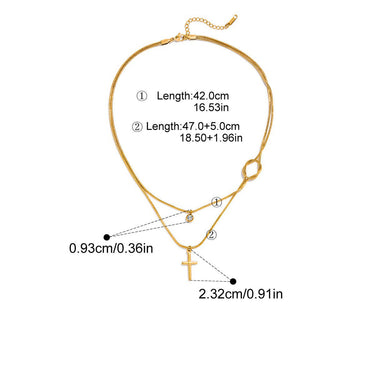You carry a soft glow where the cross meets the knot, layered in a fluid double strand that frames your neckline with quiet strength. The zircon pendant catches light with subtle fire, adding a gentle brilliance that feels natural and assured. Each detail rests easily against your skin, refined and graceful without effort.