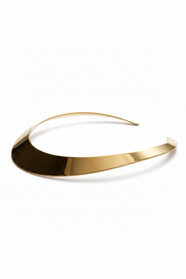 Twenty-one millimeters of curved gold claiming throat territory through rigid geometry. Open collar wraps 14cm refusing chain logic—this sits, doesn't drape. Mirror-polished smooth surface proves minimalist doesn't mean quiet. 26 grams of architectural presence worn as permanent throat fixture. No clasp because geometry this bold doesn't need mechanical closure.
