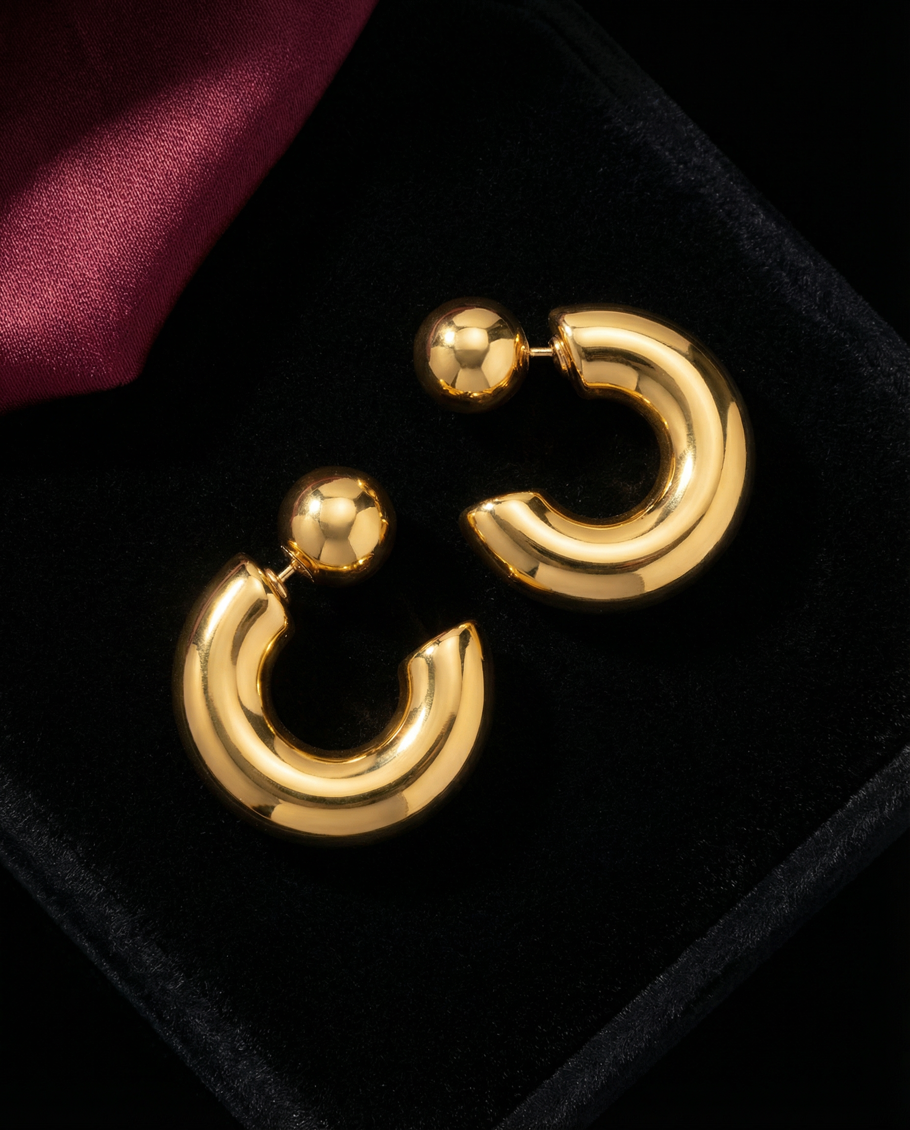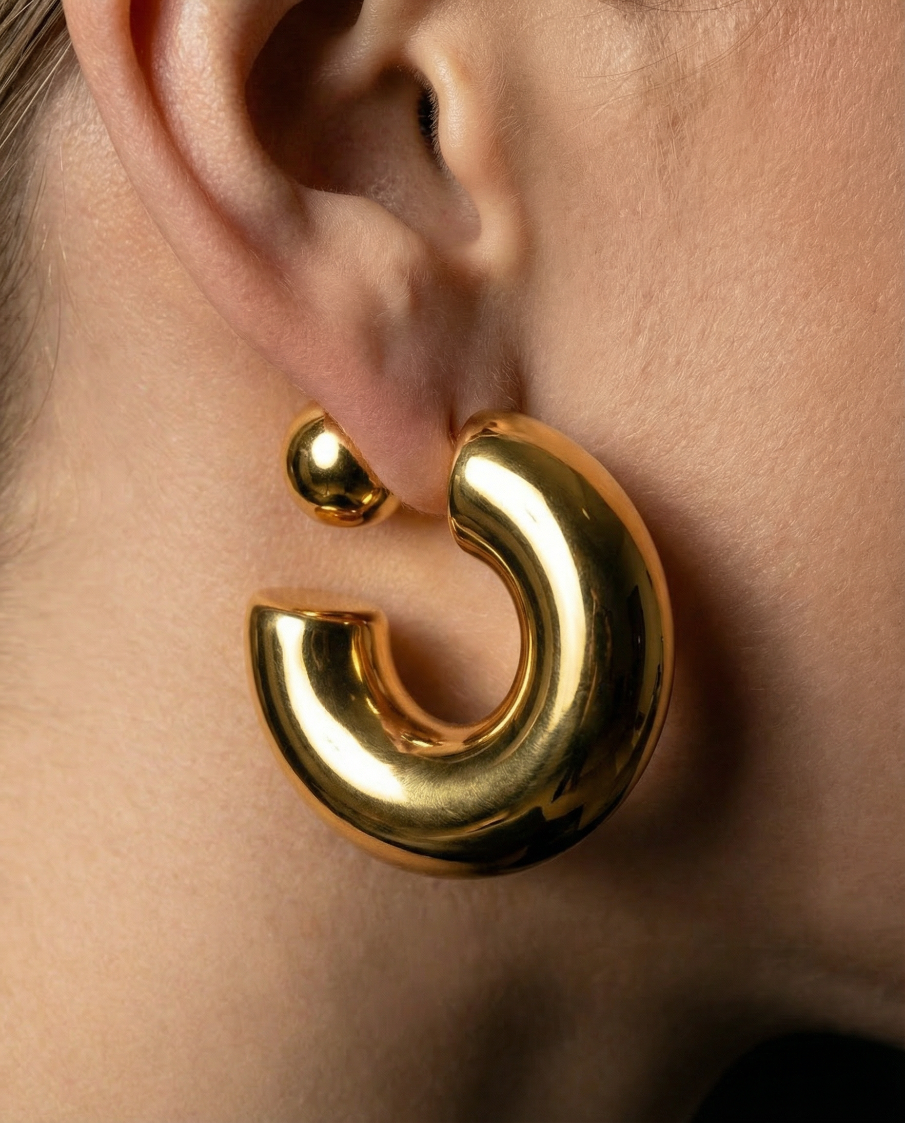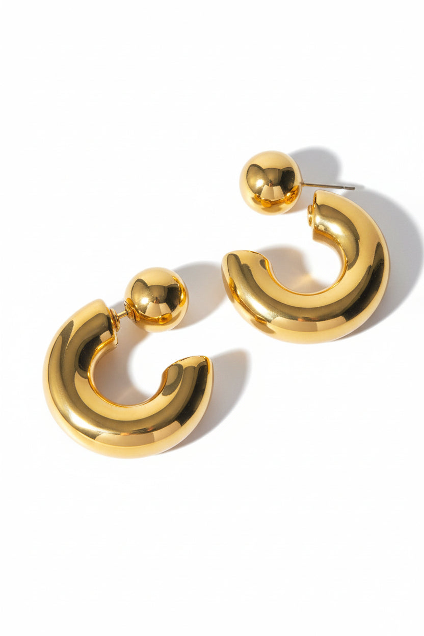 3.0 centimeters of polished gold demanding ear territory through dual-sphere construction. The ball claims space—bold, unapologetic, architectural. Mirror-polished surfaces catch nothing but reflect authority. 17.63 grams of sculptural weight declaring permanence. These earrings don't whisper. They speak.