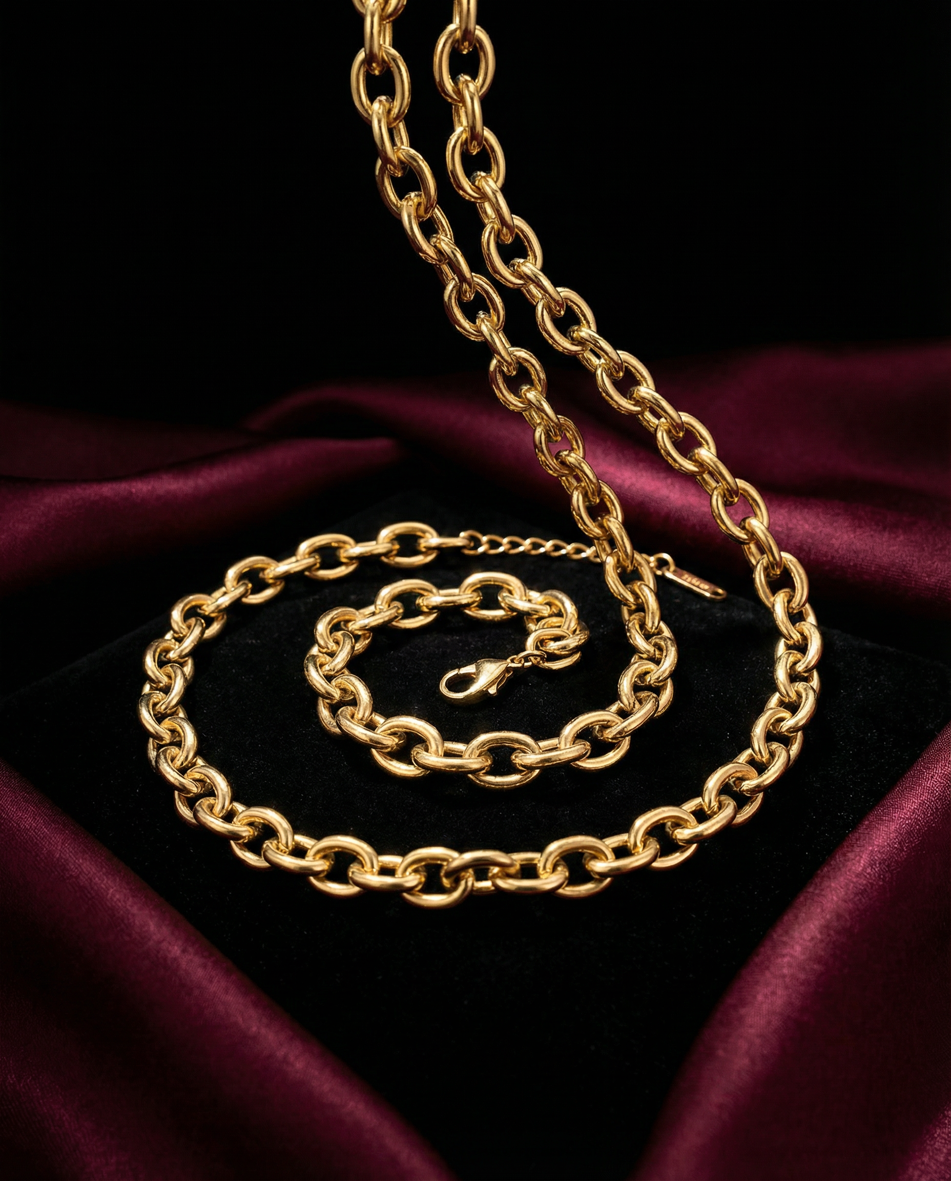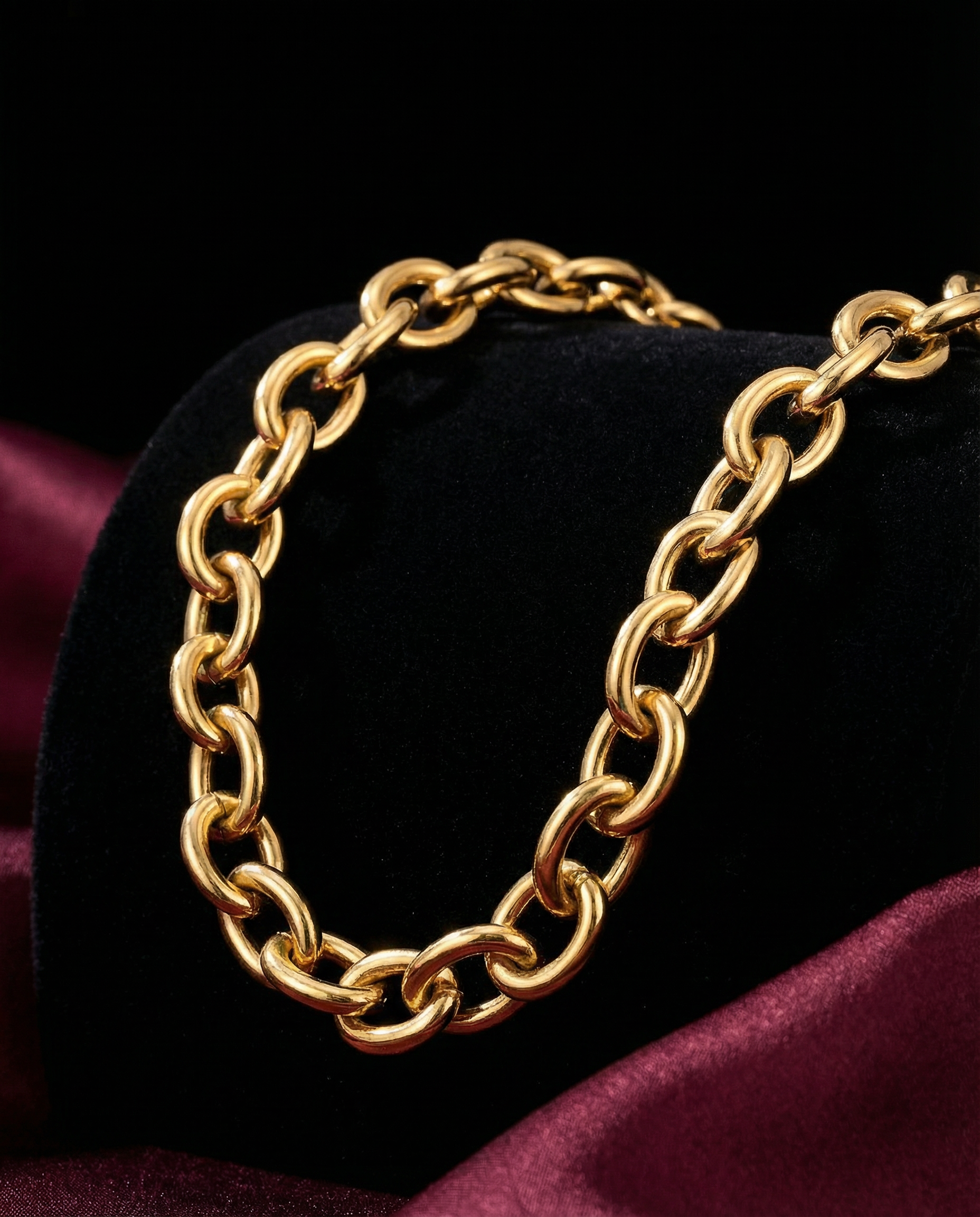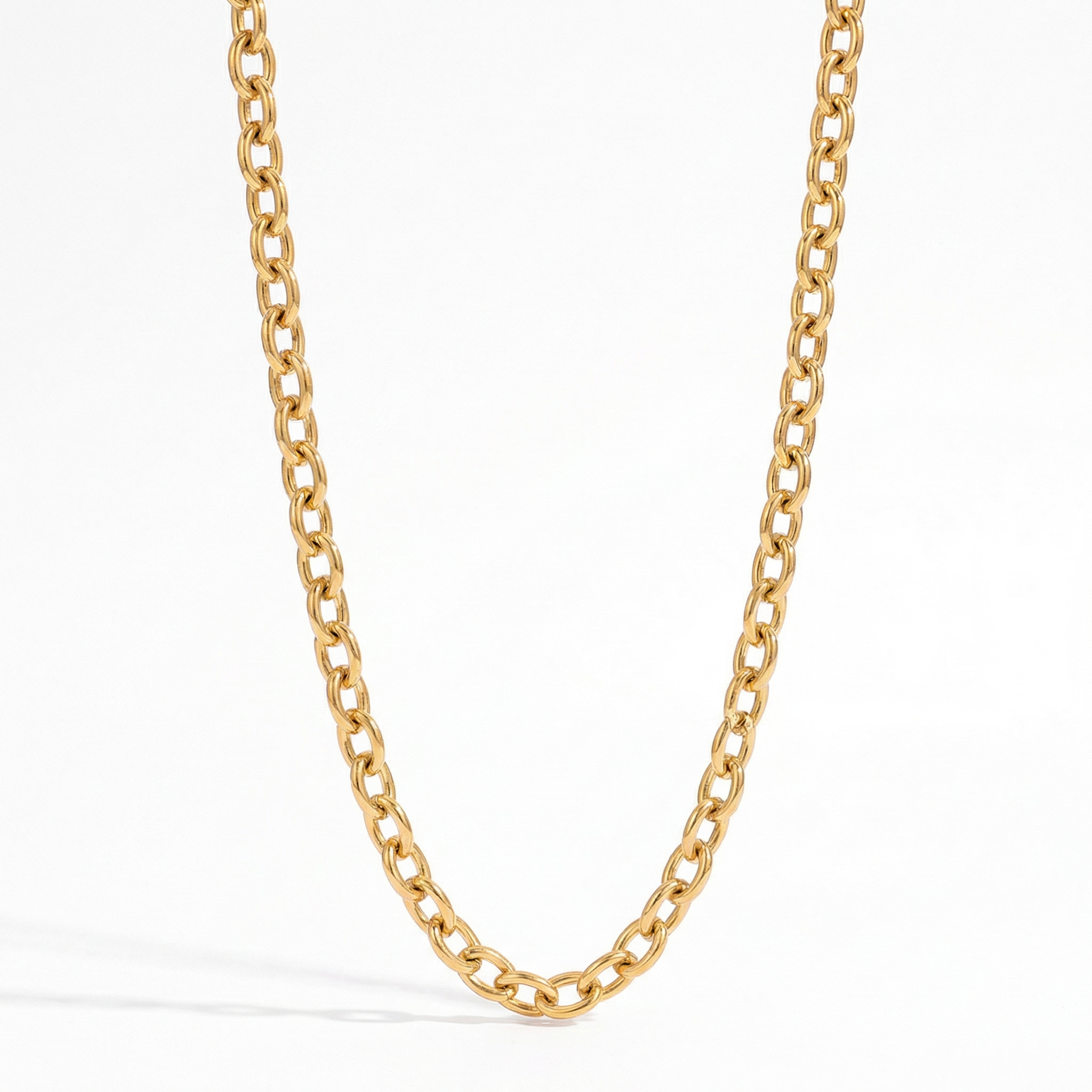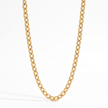 Forty centimeters of polished conviction refusing delicate chain logic. Chunky cable links—each 7.6mm oval interlocking with the next—creating continuous gold geometry that claims collarbone territory through mass not decoration. 31.6 grams means your neck knows it's occupied. Lobster clasp and extender prove precision matters even in closures. This isn't layering jewelry—it's singular cable architecture worn as permanent throat fixture.