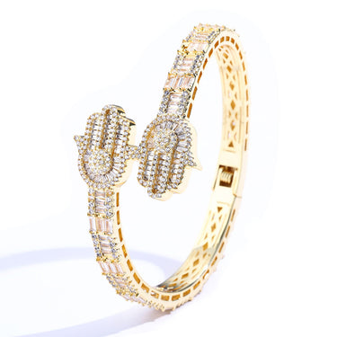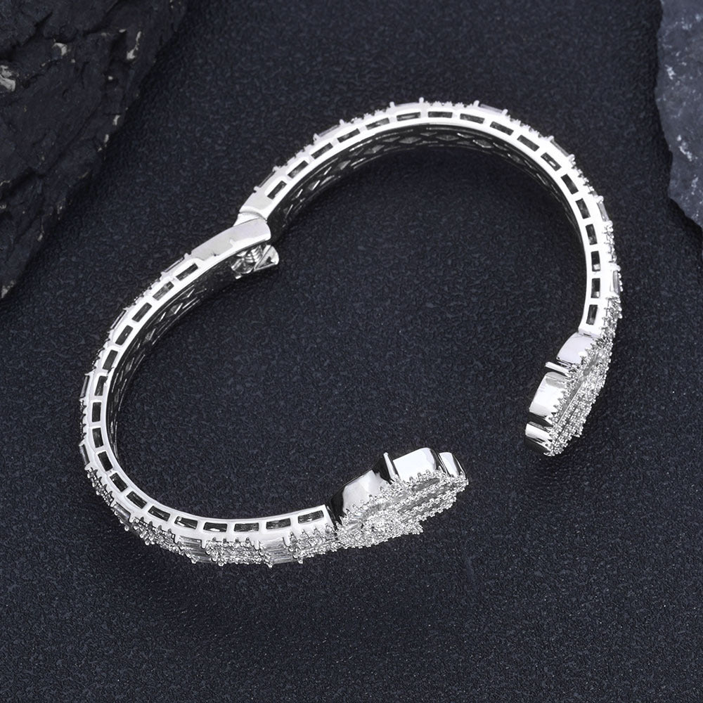 This palm-shaped bracelet, set with mixed zircon stones and a flexible spring clasp, bends easily to fit any wrist up to 24 cm. Designed as a universal emblem of strength and protection, it reflects quiet faith, power, and the calm of a man who knows who he is.