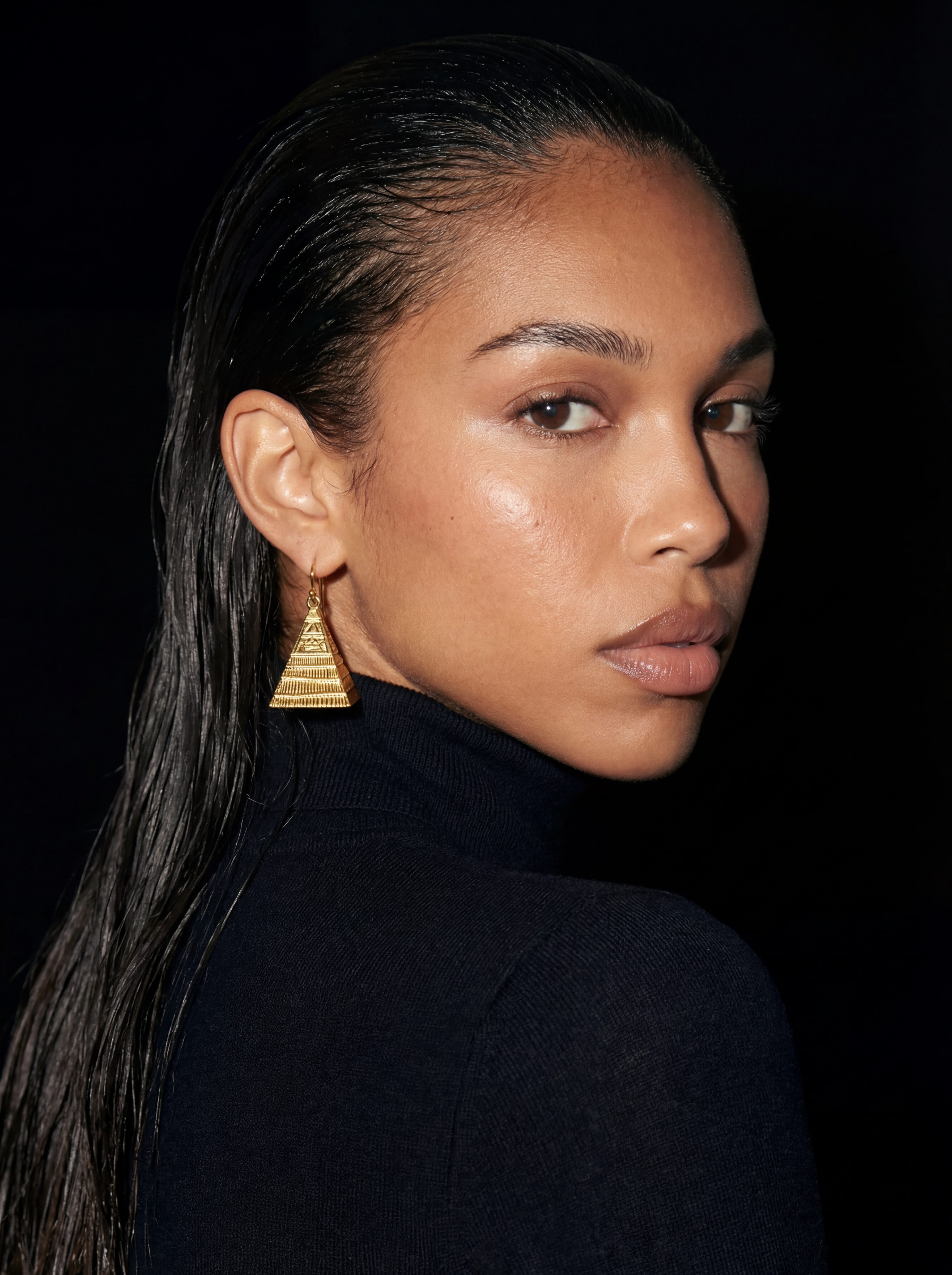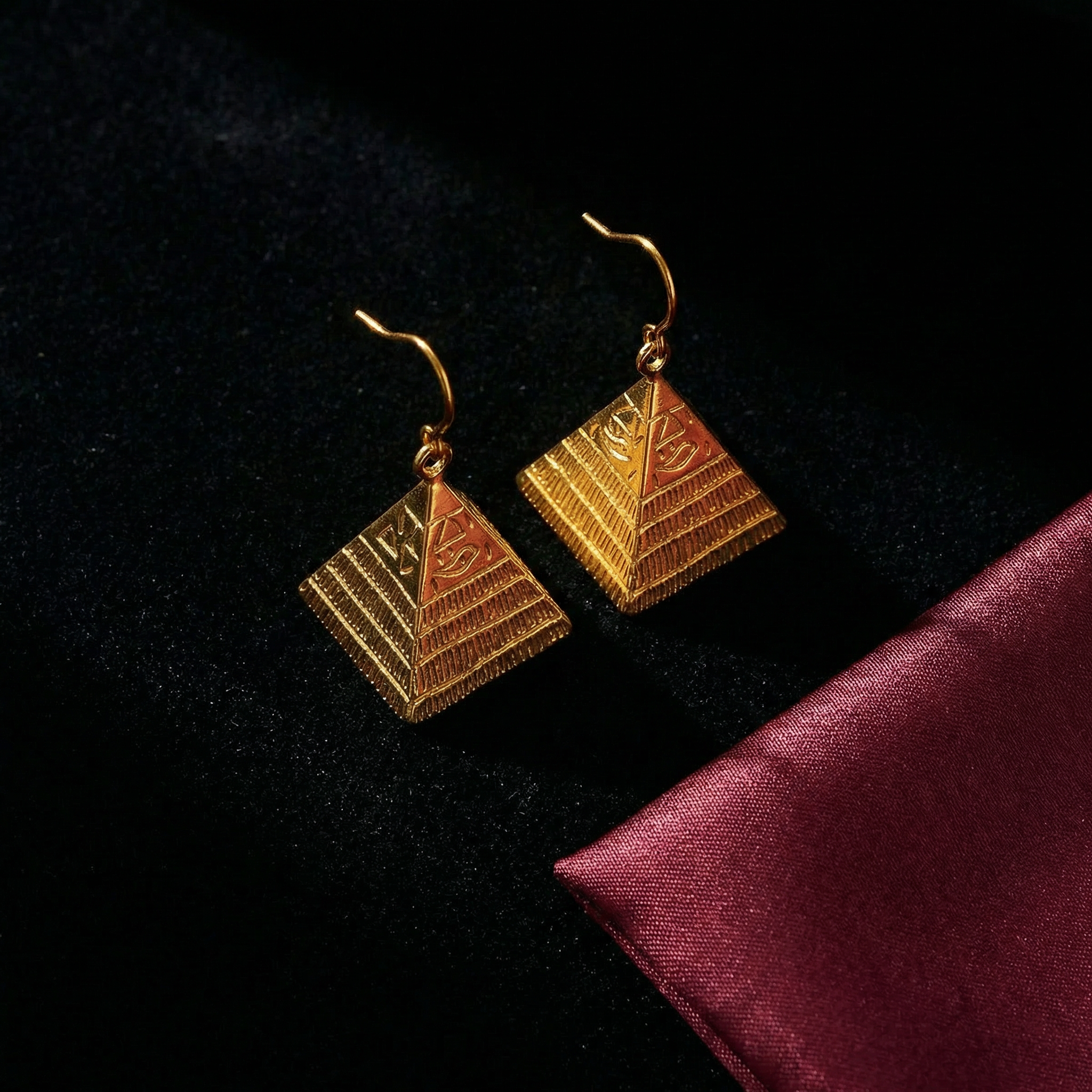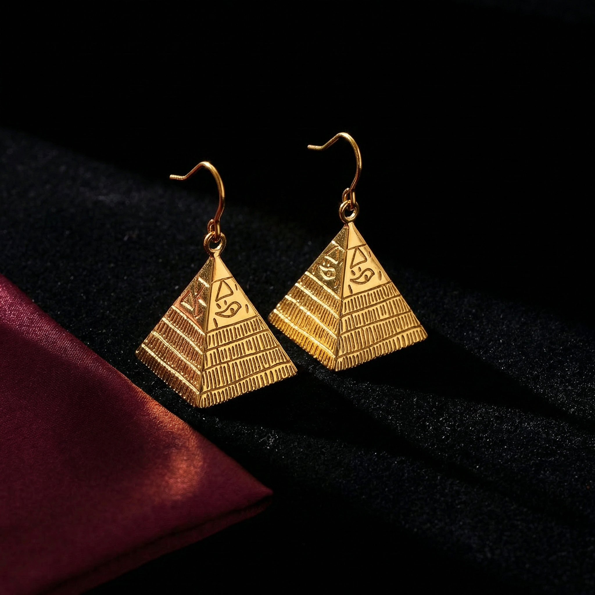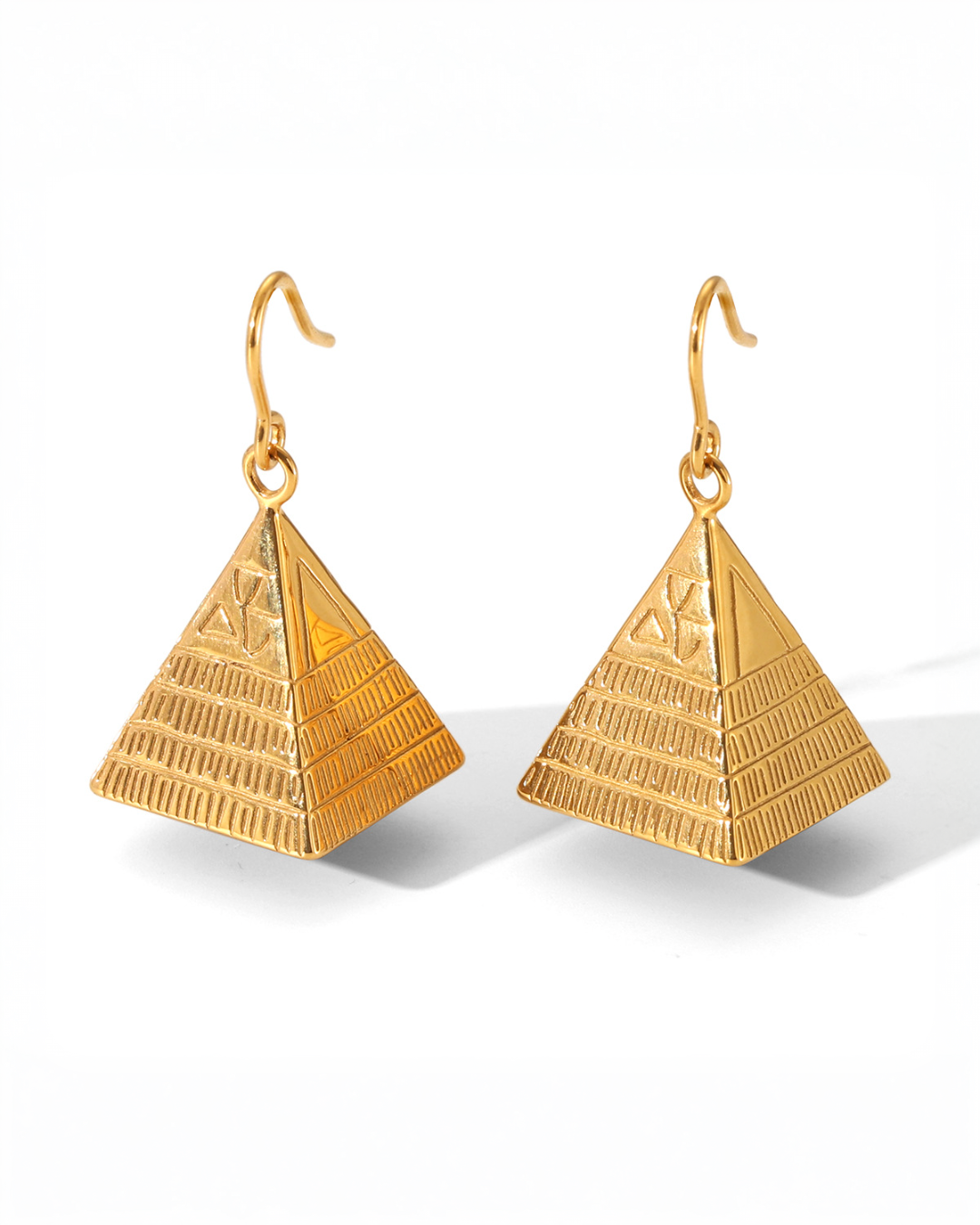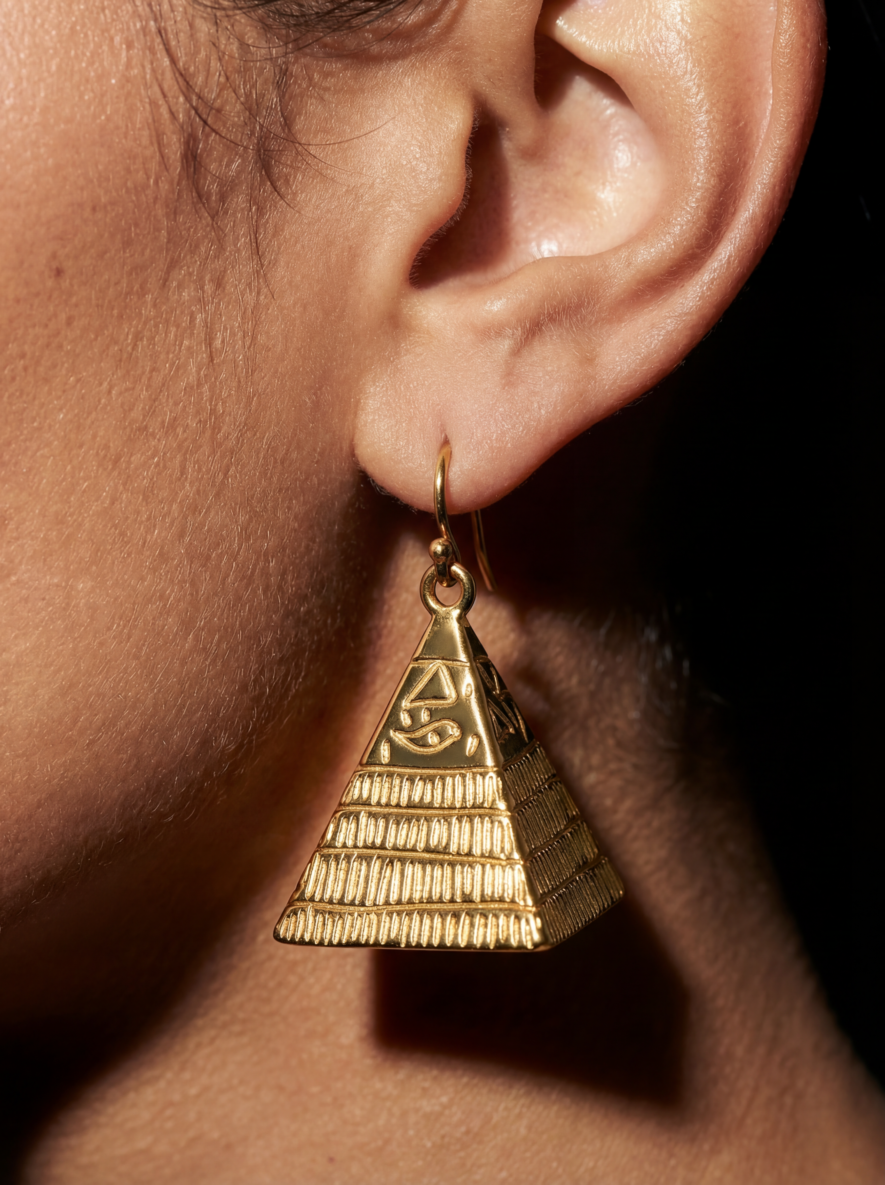 3.7 centimeters of solid architectural gold claiming ear territory through pyramid form. Each earring — a three-dimensional structure: horizontal ridged tiers ascending to apex, hieroglyphic geometry engraved on face. 14.3 grams per pair of monumental presence worn as permanent declaration. No stone. The pyramid is the statement.