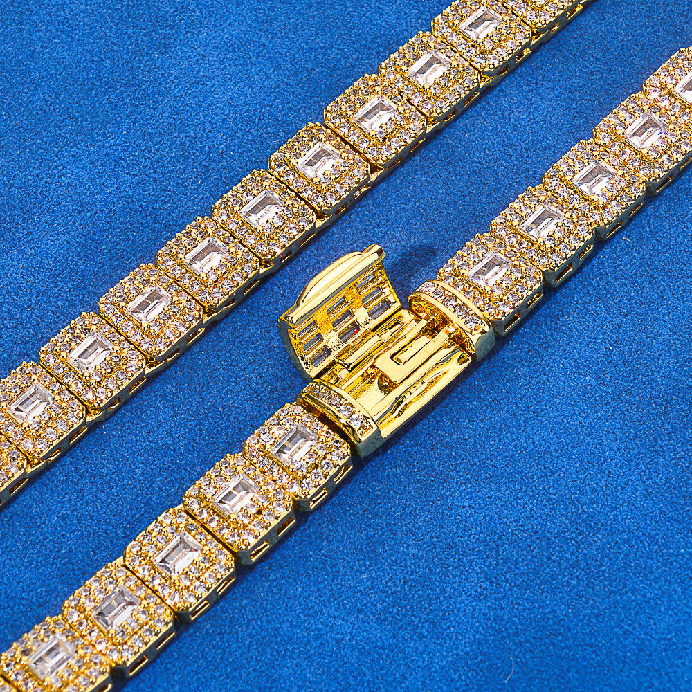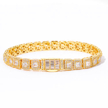 This 7.5mm bracelet features a T-square design, set with mixed-cut zircon stones that catch the light like liquid fire. Secured with a spring flap clasp, it adapts effortlessly to the wrist while holding an unshakable presence. Available in two tones—gold or silver—each one crafted for the man who owns his silence.