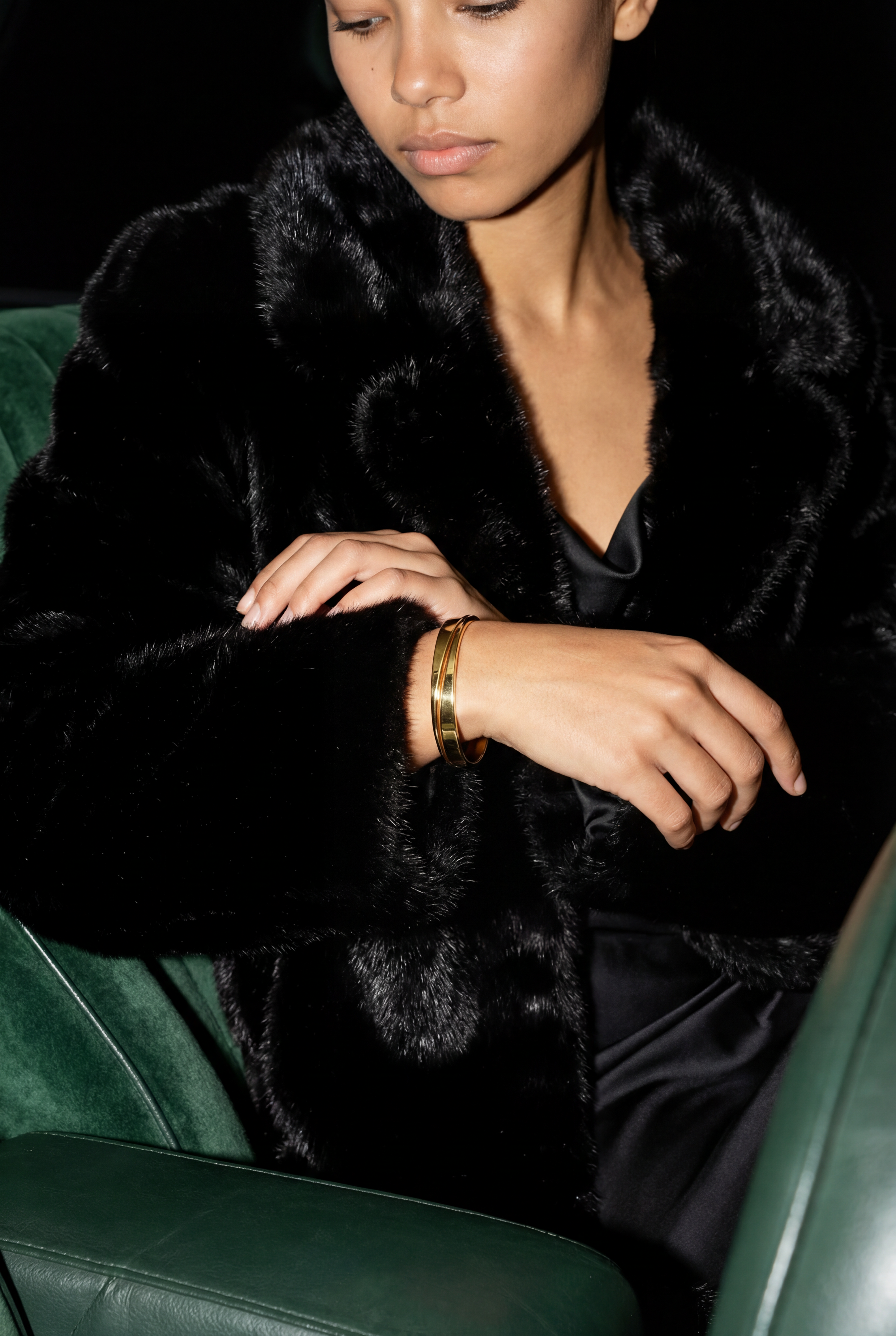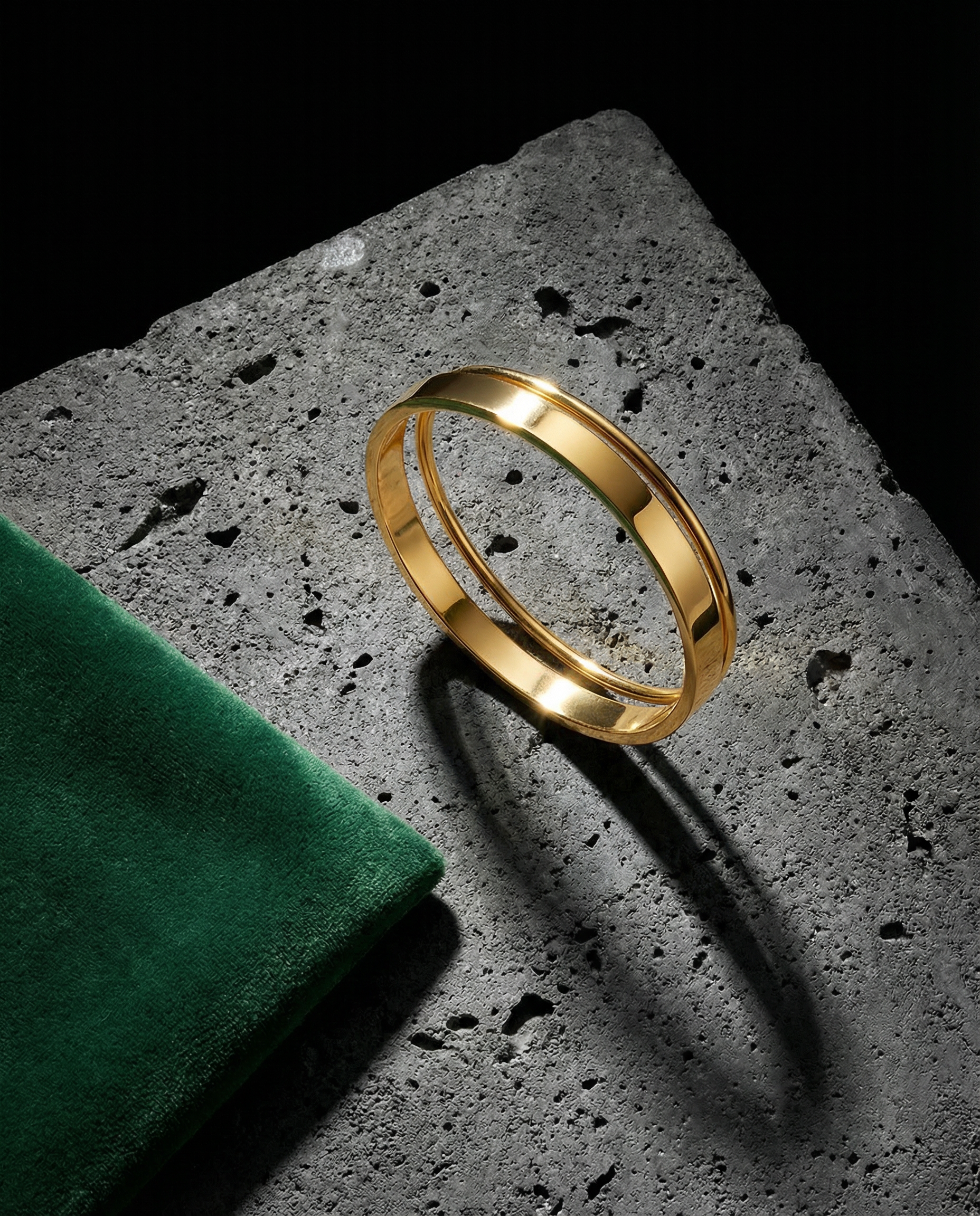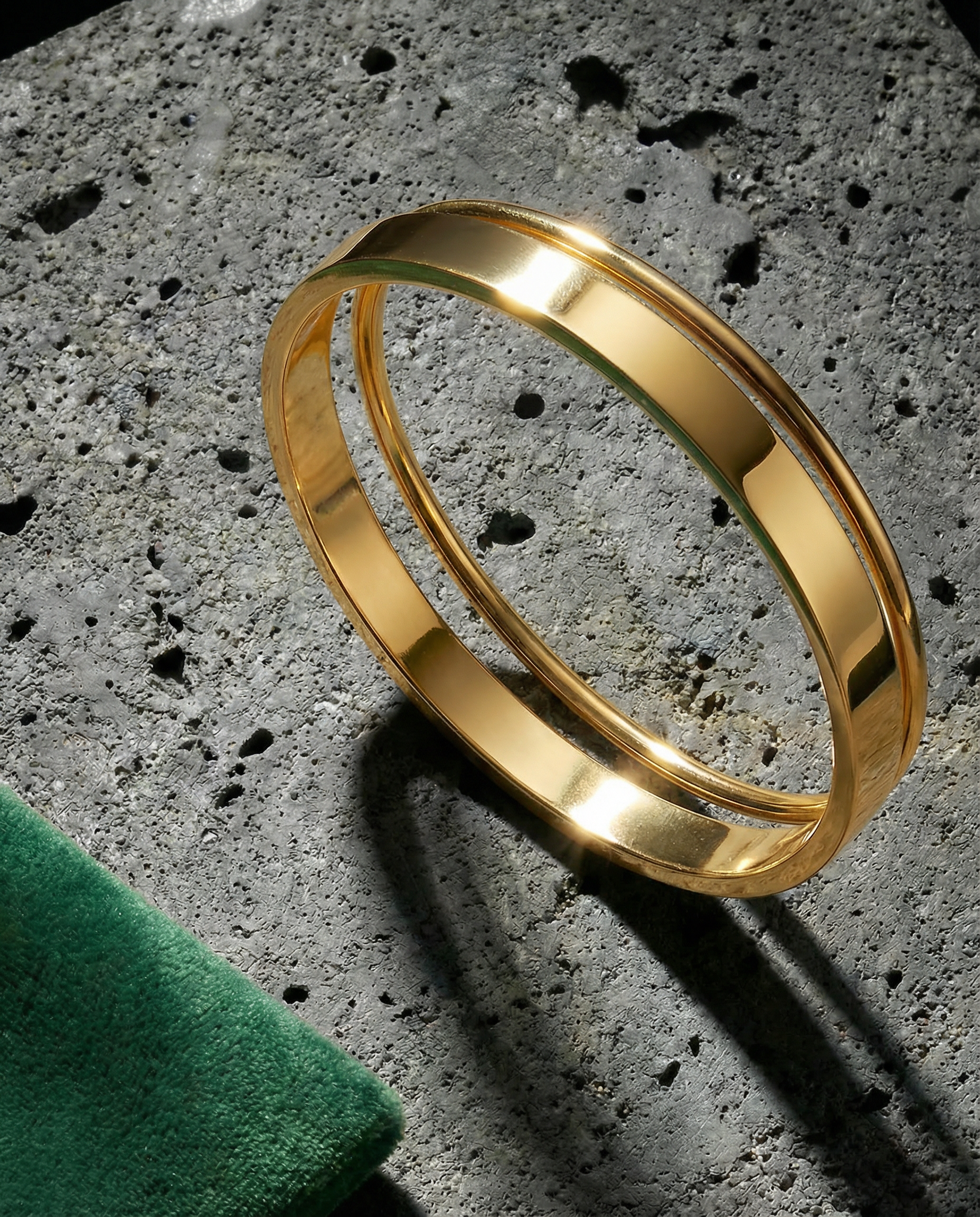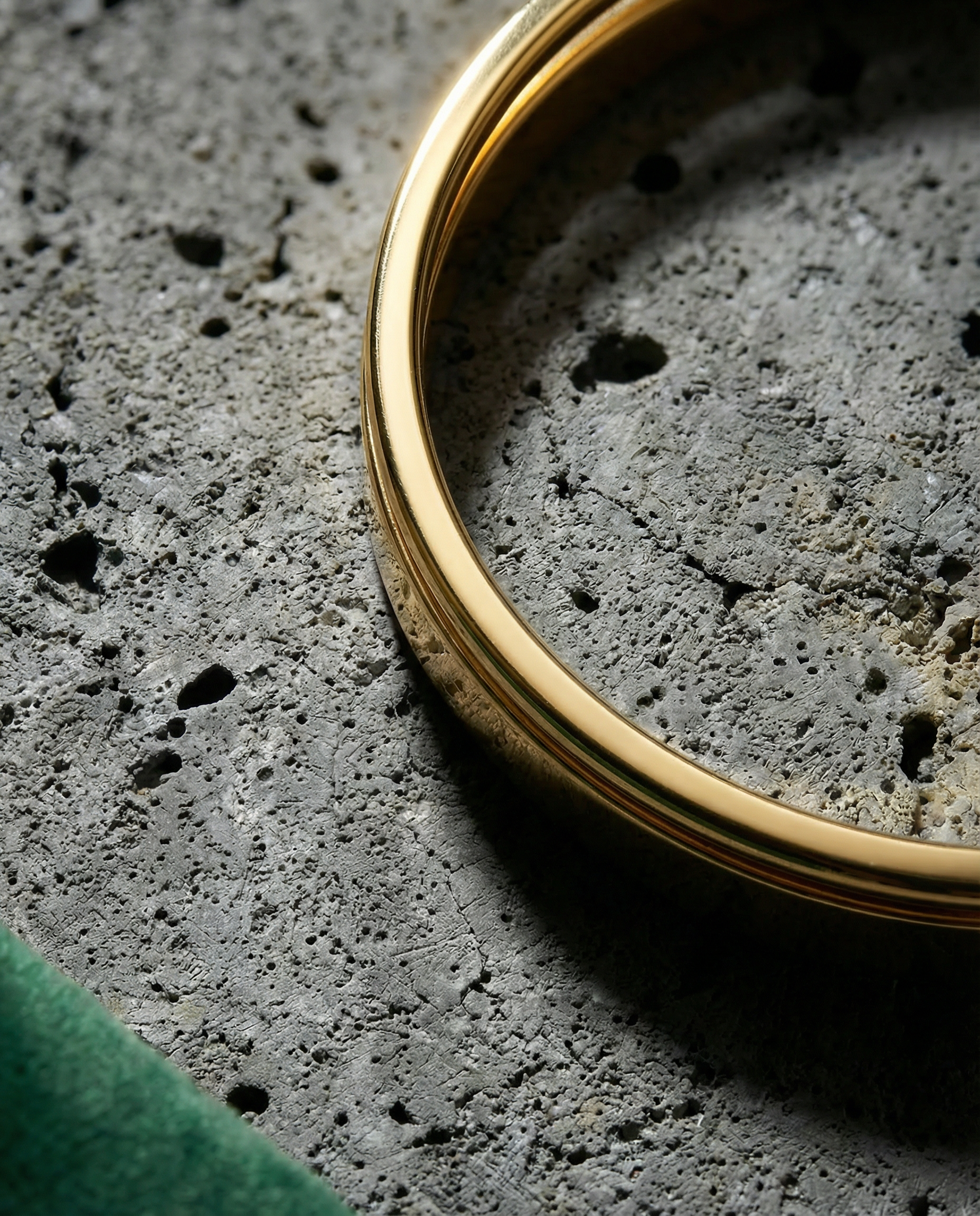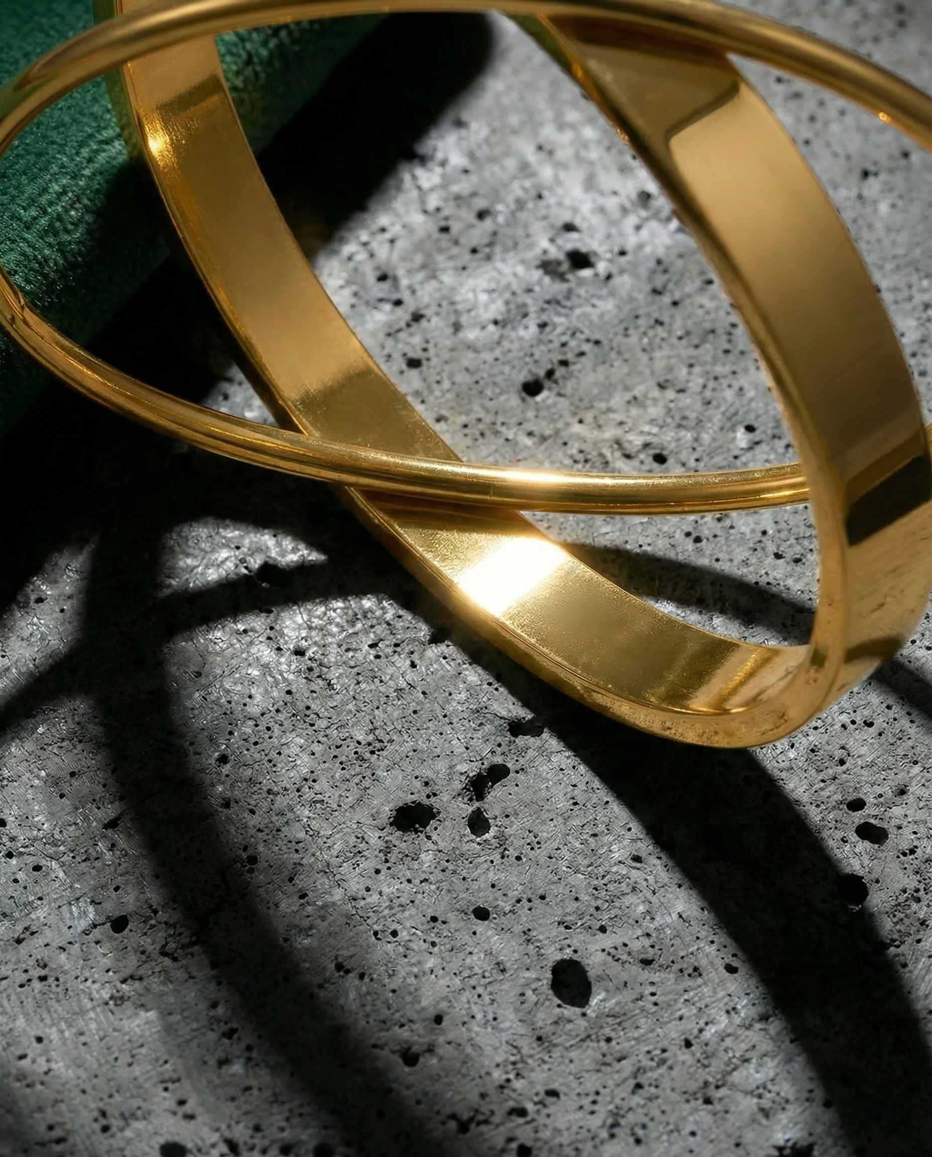 Two circles that refuse separation. Mirror-polished gold bangles—one statement (6.6mm), one whisper (2.2mm)—designed to be worn together or claimed individually. Closed circles slide on deliberately, no opening to compromise the continuous form. 34.3 grams distributed across two intentions means presence without apology. Stack them. Separate them. The choice remains yours, but the pairing is permanent. This isn't coordination—it's conversation between bold and subtle made wearable.