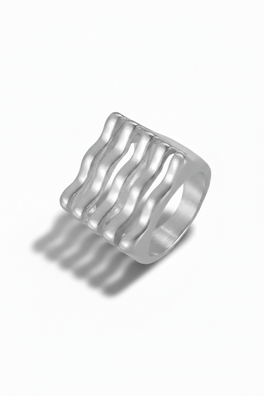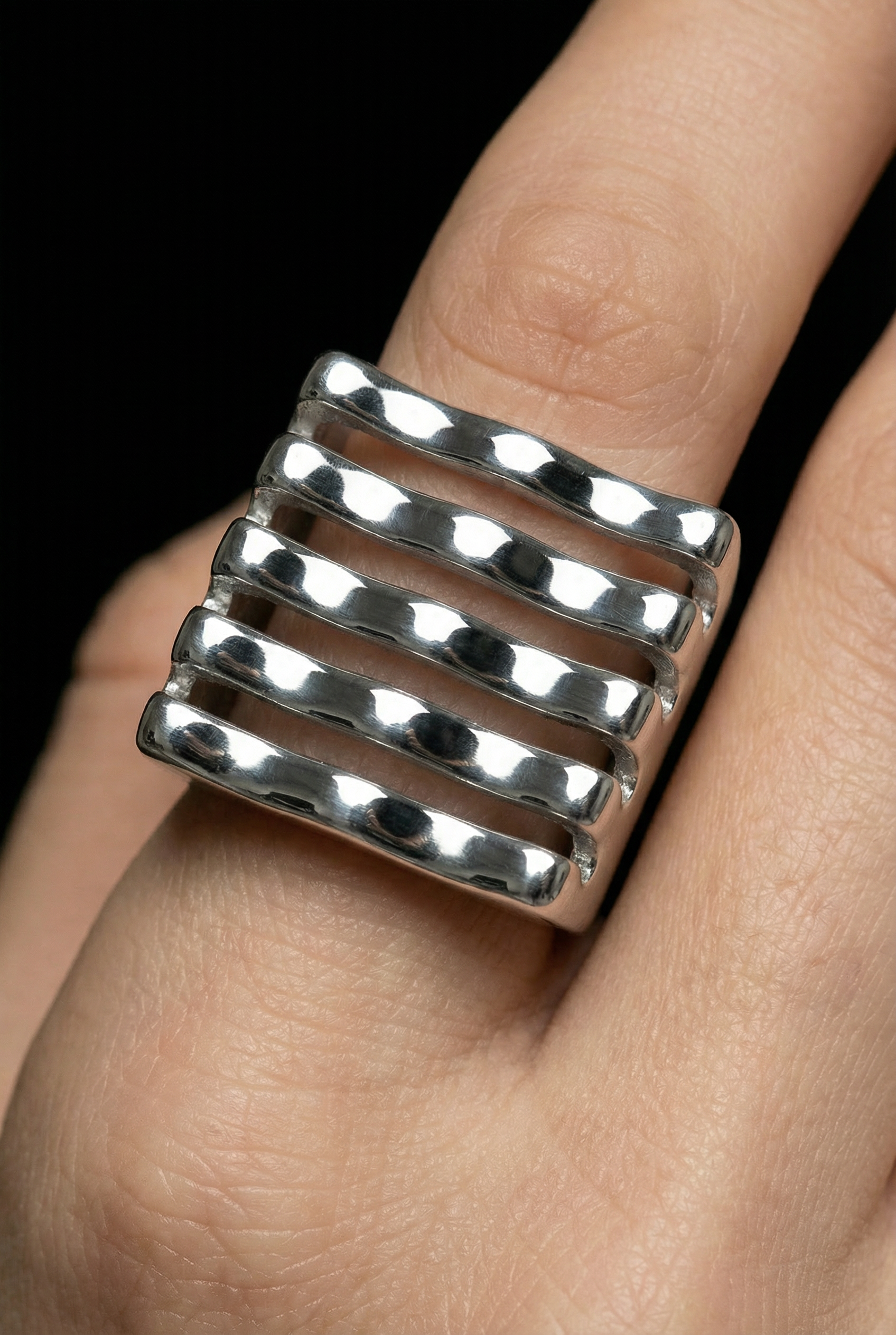 2.2 centimeters of stacked architectural silver claiming finger territory through five parallel wave ridges. Rectangular block form houses horizontal undulating layers — each wave a deliberate structural declaration, each gap between layers an intentional void. Mirror-polished surfaces refuse subtlety. 13.5 grams of monumental presence worn as permanent territorial marker. No stone because five-layer wave geometry is the statement.