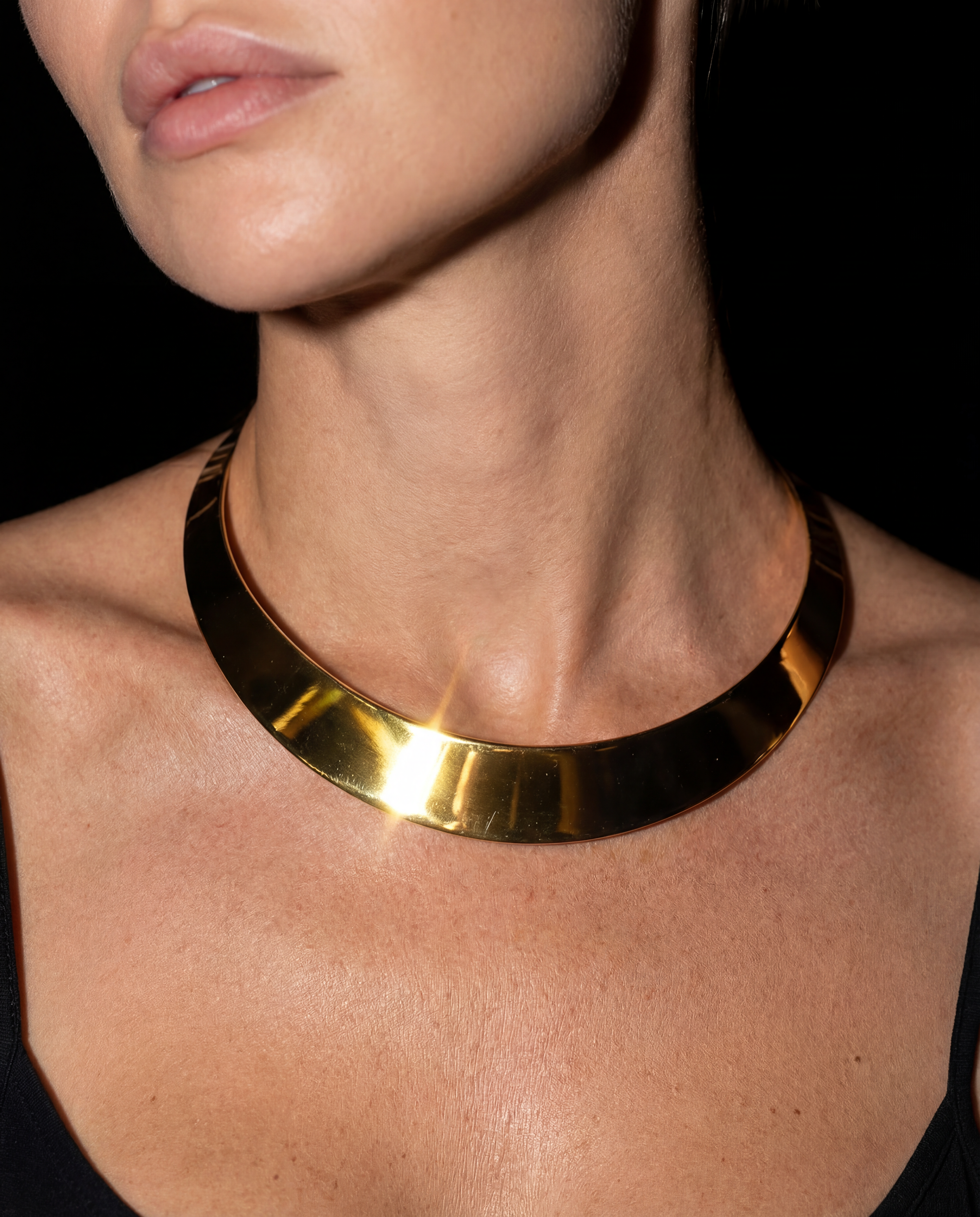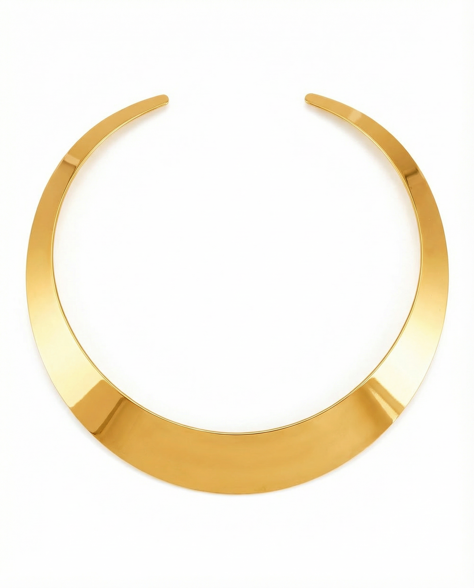 Twenty-one millimeters of curved gold claiming throat territory through rigid geometry. Open collar wraps 14cm refusing chain logic—this sits, doesn't drape. Mirror-polished smooth surface proves minimalist doesn't mean quiet. 26 grams of architectural presence worn as permanent throat fixture. No clasp because geometry this bold doesn't need mechanical closure.