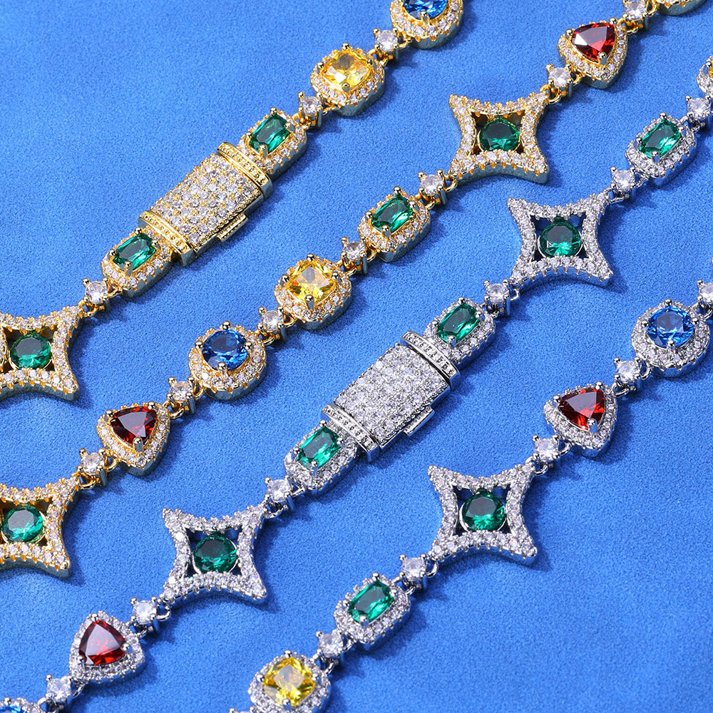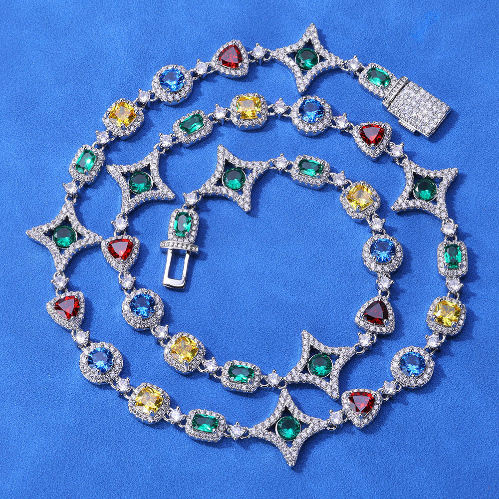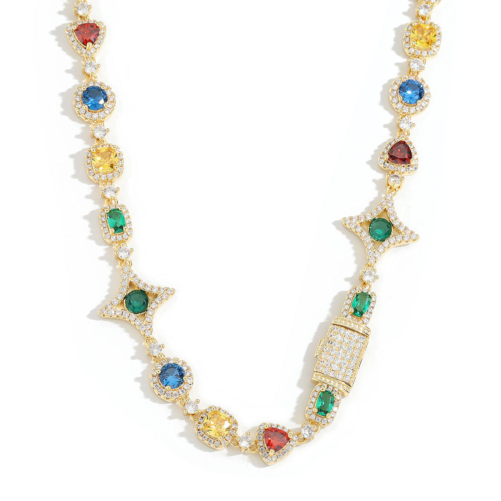 A chain that owns the room before you speak. Each link blazes with colored zircon gemstones, set in platinum or gold finish, catching light like fire across steel. It is more than style, it is presence, dominance, and command.