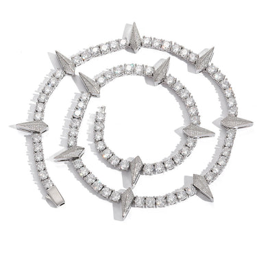 For the man whose silence carries danger. This 5mm chain fuses wolf-tooth edges with black zircon fire, built to command attention without a word. It is presence sharpened into metal, a mark of untamed authority.